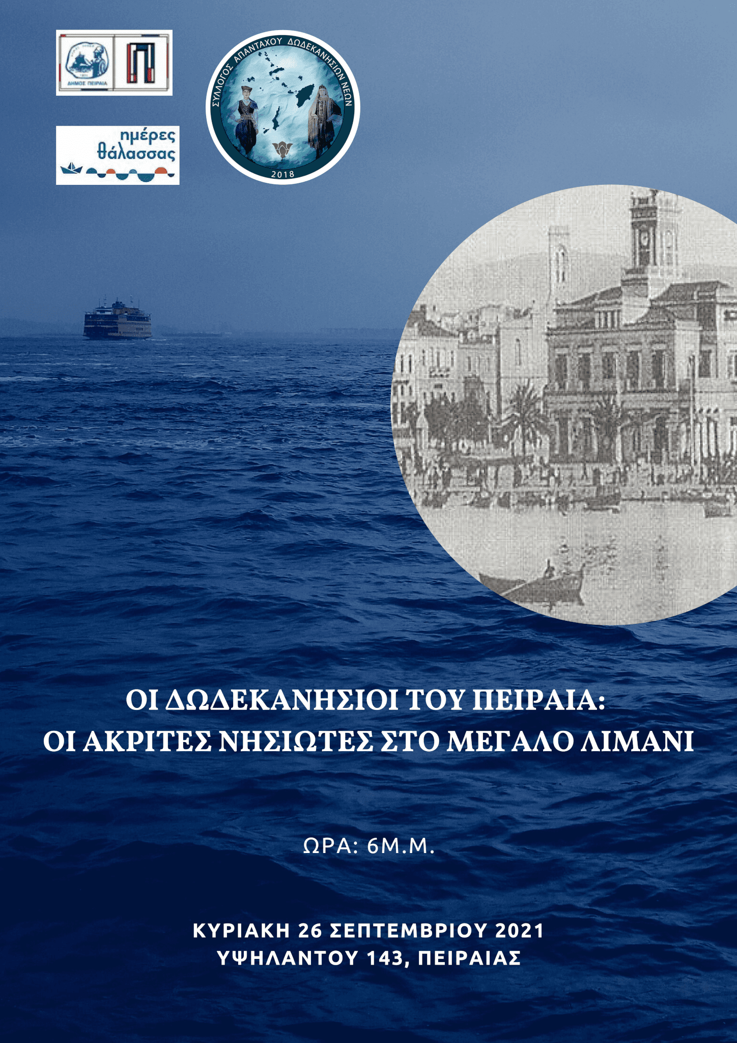 Σύλλογος Απανταχού Καρπαθίων2021-09-07 11:35:522021-09-07 11:35:52Σ.Α.Δ.Ν: Οι Δωδεκανήσιοι του Πειραιά: οι ακρίτες νησιώτες στο Μεγάλο Λιμάνι – Κυριακή 26/9/21 ώρα 18.00 – Δωδεκανησιακή Εστία