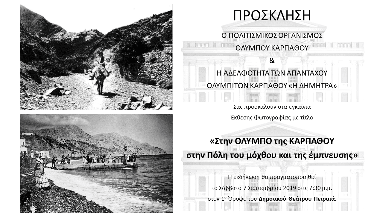 Με ιδιαίτερη χαρά ο Πολιτισμικός Οργανισμός Ολύμπου Καρπάθου και η Αδελφότητα Ολυμπιτών Καρπάθου “Η Δήμητρα” σας προσκαλούν να παρευρεθείτε στην έκθεση φωτογραφίας που συνδιοργανώνουν με τίτλο “Στην Όλυμπο της Καρπάθου στην Πόλη του μόχθου και της έμπνευσης”.