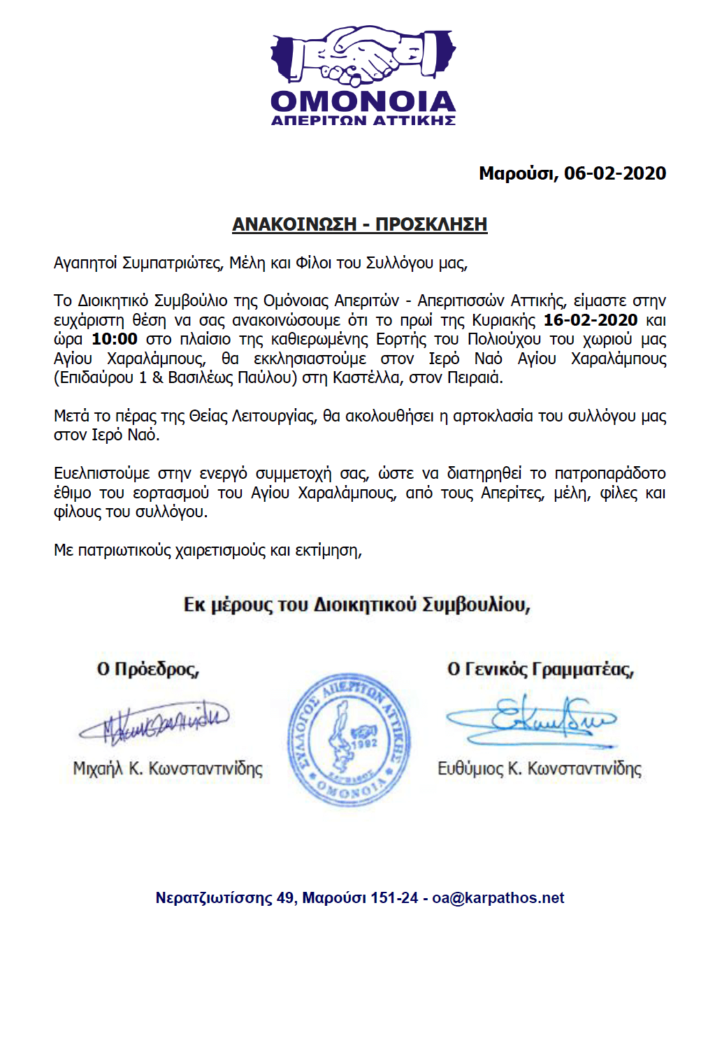 Συνημμένη θα βρείτε την Επιστολή – Πρόσκληση για τον εορτασμό του Αγίου Χαραλάμπους, πολυούχου του Απερίου.