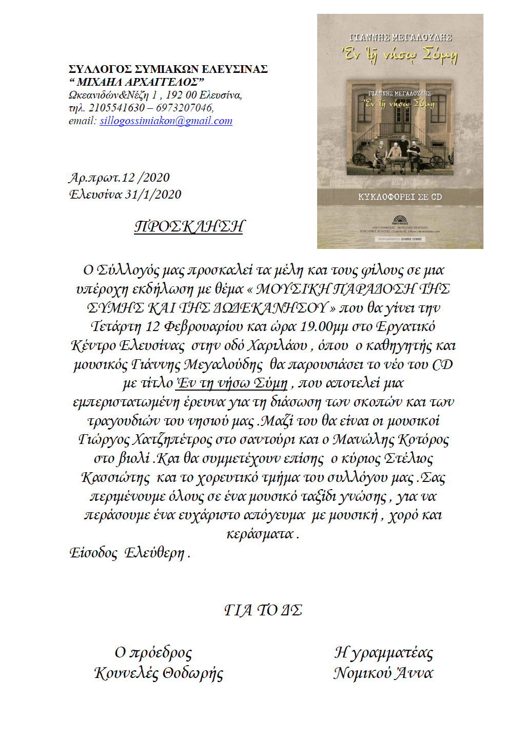 Πρόσκληση σε μουσική βραδιά από τον Σύλλογο Συμιακών Ελευσίνας “Μιχαήλ Αρχάγγελος”