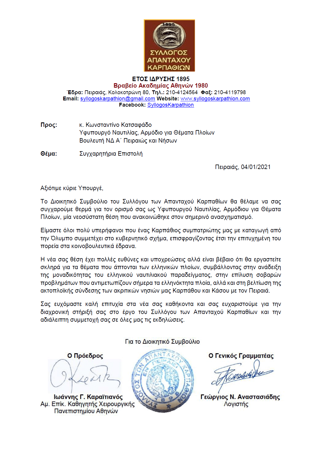 Ο Σύλλογος των Απανταχού Καρπαθίων αμέσως μετά τον ορισμό του συμπατριώτη μας Βουλευτή Α΄ Πειραιώς και Νήσων κ. Κωνσταντίνου Κατσαφάδου, ως Υφυπουργού Ναυτιλίας, Αρμόδιου για θέματα Πλοίων, απέστειλε την παρακάτω συγχαρητήρια επιστολή: