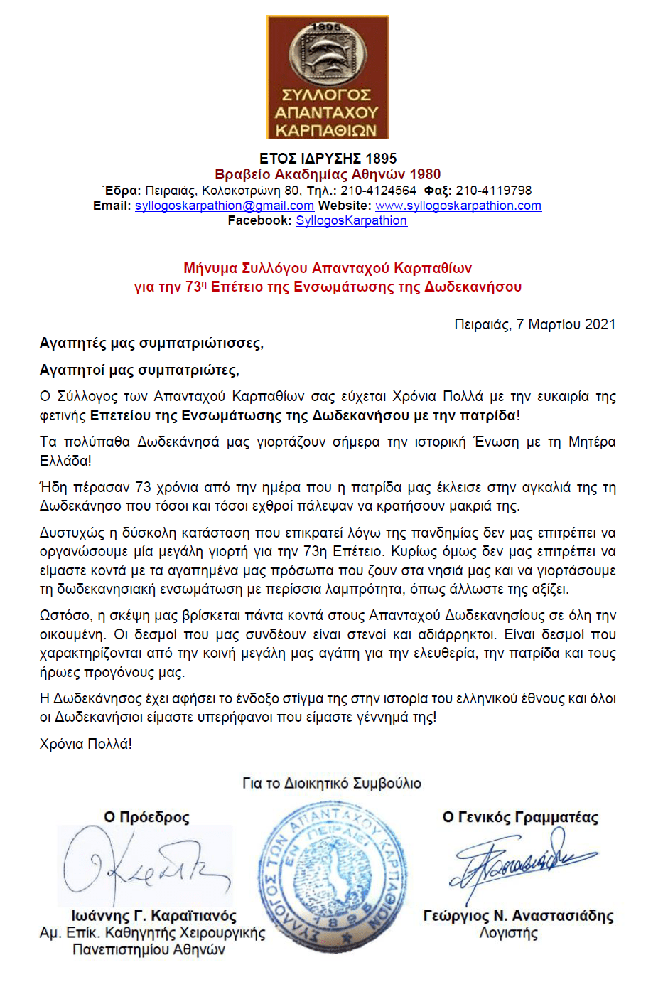 Μήνυμα Συλλόγου Απανταχού Καρπαθίων για την 73η Επέτειο Ενσωμάτωσης της Δωδεκανήσου