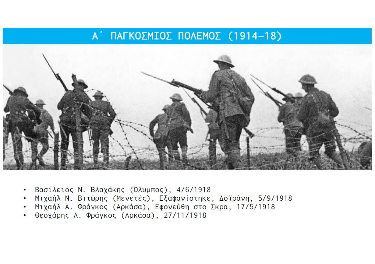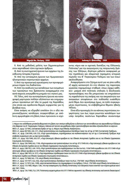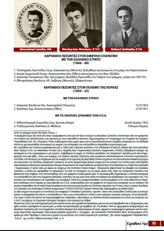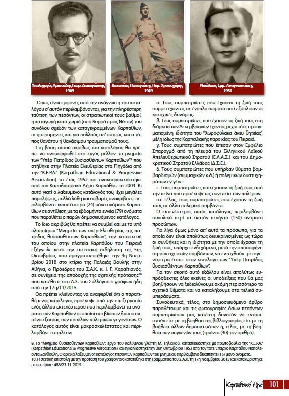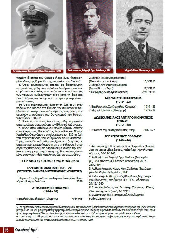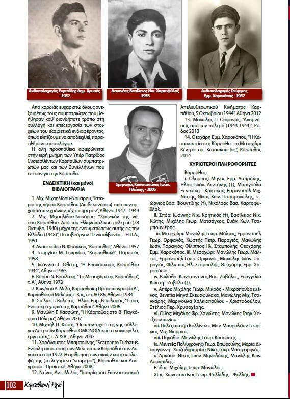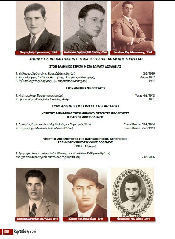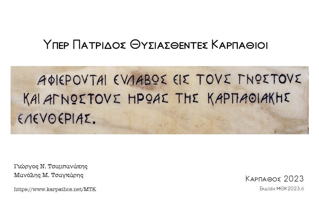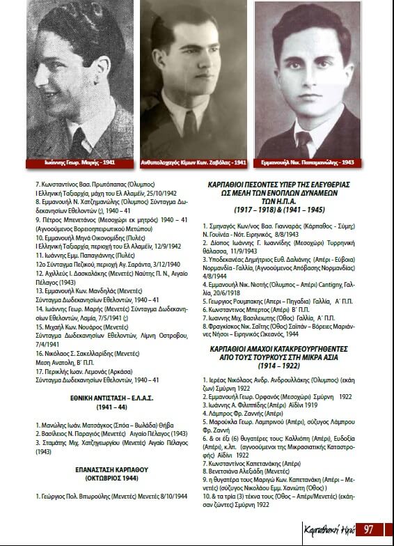 Ο κατάλογος των υπέρ πατρίδος θυσιασθέντων Καρπαθίων από τους: Γιώργο Νικ. Τσαμπανάκη και Μανόλη Μιχ. Τσαγκάρη