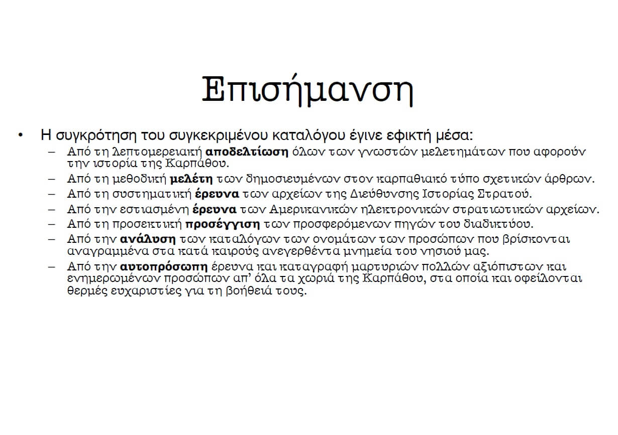 Προσπαθήσαμε να συμπεριλάβουμε εξαντλητικά σ’ αυτήν Καρπαθίους, που θυσιάστηκαν στον βωμό της πατρίδας, εντός και εκτός Καρπάθου.