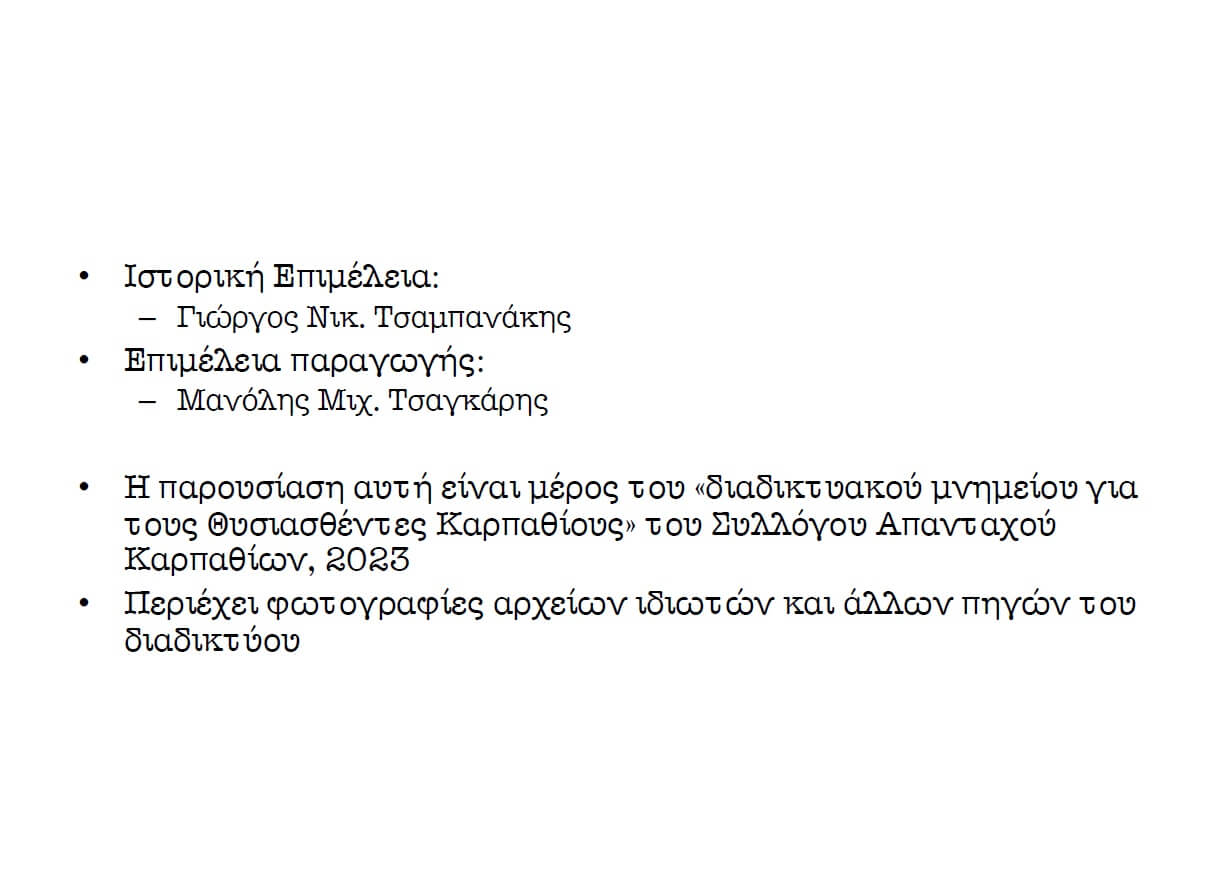 Η παρατιθέμενη παρουσίαση αποτελεί προϊόν εμπεριστατωμένης ιστορικής έρευνας, η οποία μπήκε στην τελική της φάση το 2014 με αφορμή τον εορτασμό της 70ης επετείου της Επανάστασης της Καρπάθου, που διοργάνωσε ο Σύλλογος των Απανταχού Καρπαθίων.