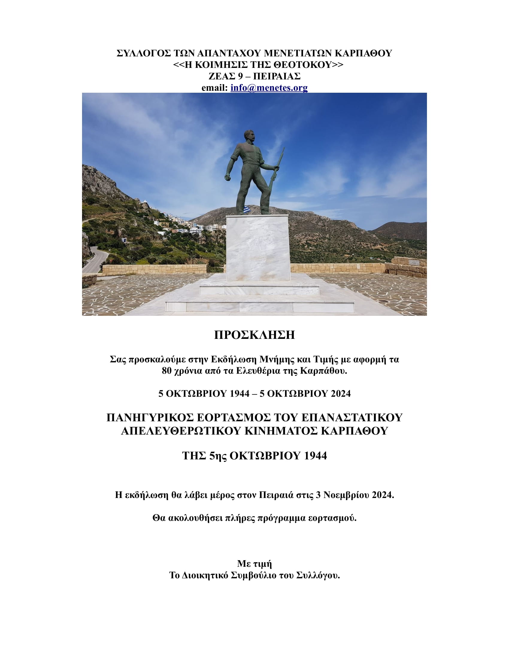 Σήμερα όλοι οι Καρπάθιοι απανταχού εορτάζουμε την 80ή Επέτειο από την Επανάσταση της 5ης Οκτωβρίου 1944 και της Απελευθέρωσης της Καρπάθου από τον ιταλικό ζυγό που ξεκίνησε από τις Μενετές και επεκτάθηκε σε όλο το νησί μας!