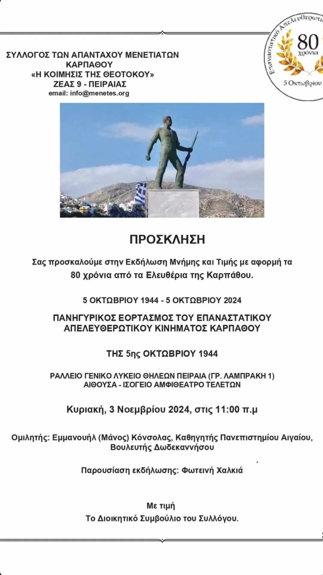 Σύλλογος Απανταχού Μενετιατών Καρπάθου-Εορτασμός Επετείου 80 χρόνων από την Επανάσταση και Απελευθέρωση της Καρπάθου-5η Οκτωβρίου 1944 | 3.11.2024 ώρα 11.00 Ράλλειο Γενικό Λύκειο Θηλέων Πειραιά