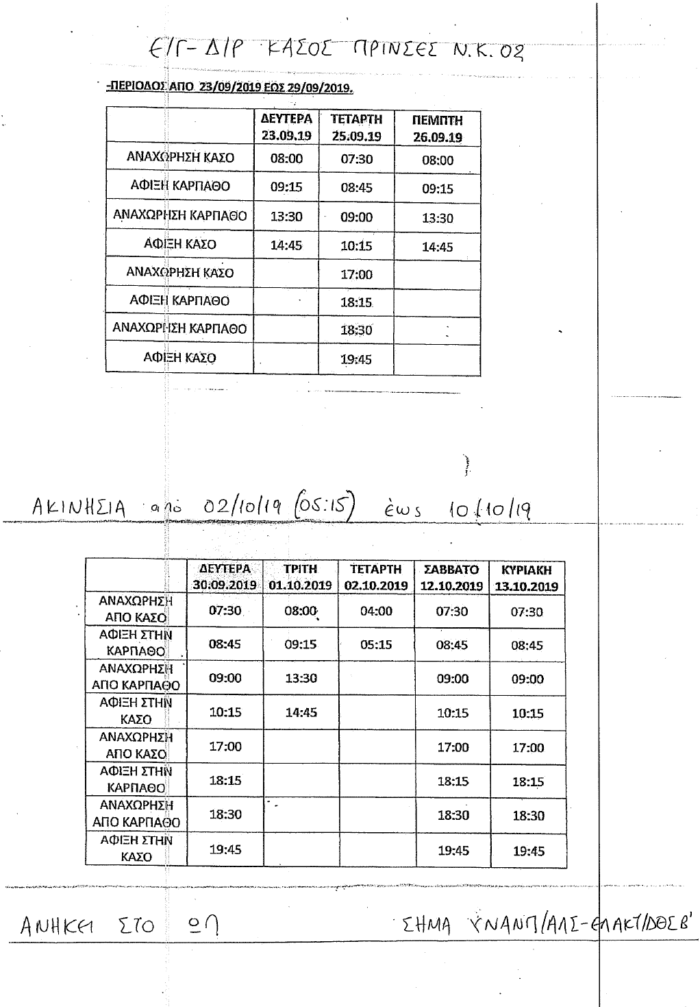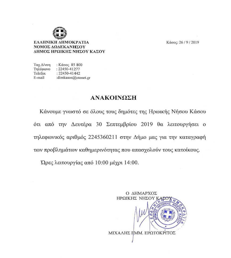 ΕΛΛΗΝΙΚΗ ΔΗΜΟΚΡΑΤΙΑ Κάσος, 24 / 9 / 2019