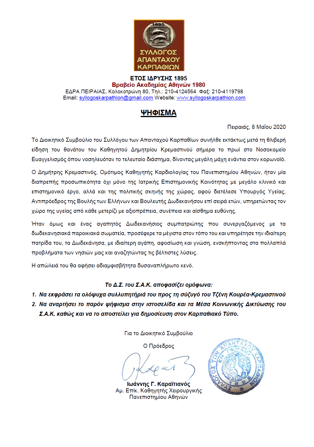 Στην τελετή των αποκαλυπτηρίων είχε προσκληθεί ο Μανώλης Γλέζος. Δυστυχώς όμως, η ευάλωτη υγεία του δεν του επέτρεψε να μετακινηθεί από την Αθήνα. Απέστειλε όμως ένα γραπτό μήνυμα, το οποίο ανέγνωσε κατά τη διάρκειας της τελετής ο τότε Σύμβουλος Πολιτισμού της Επαρχίας Καρπάθου-Κάσου, κ. Γιώργος Τσαμπανάκης. Το μήνυμα του Μανώλη Γλέζου έχει επί λέξει ως εξής: