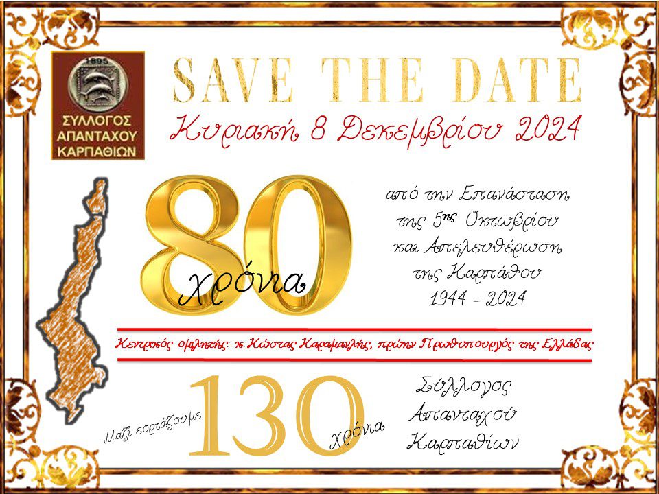 Επισυνάπτεται η αφίσα του Παγκαρπαθιακού Εορτασμού που διοργανώνει ο Σύλλογός μας για την 80ή Επέτειο της Επανάστασης της 5ης Οκτωβρίου και Απελευθέρωσης της Καρπάθου, 1944-2024, την Κυριακή 8 Δεκεμβρίου!