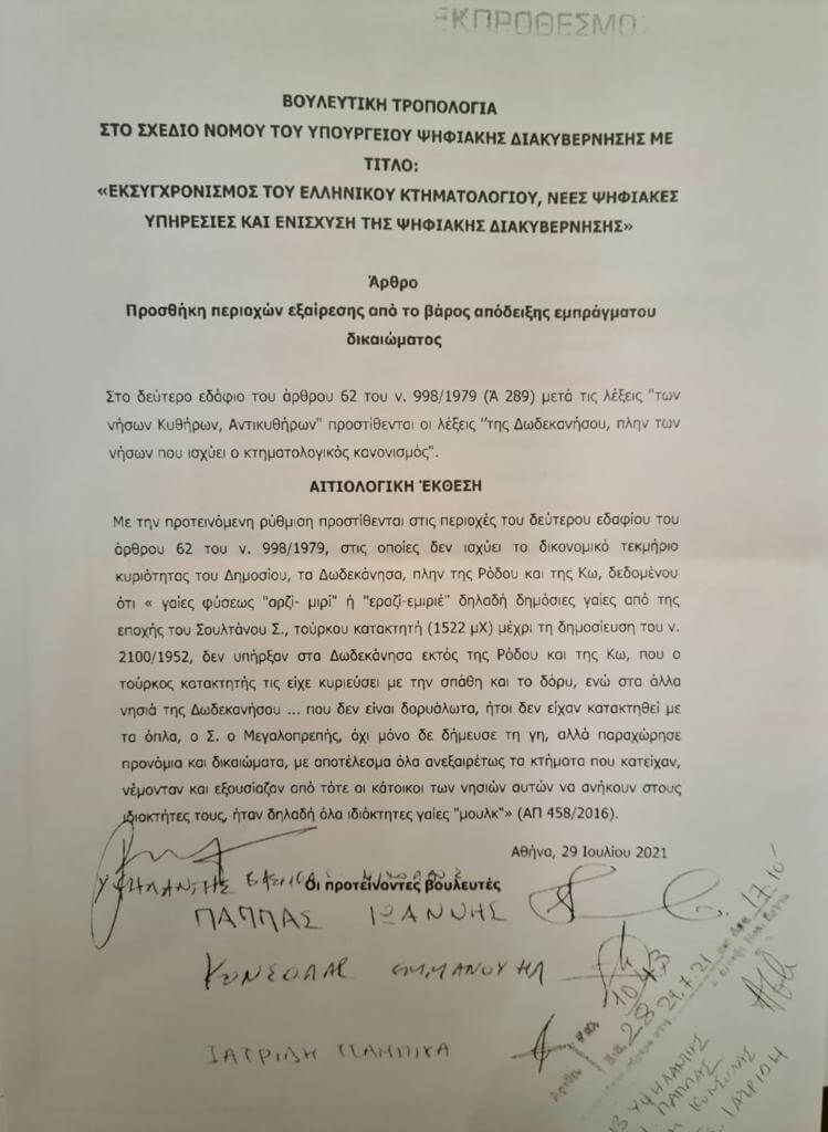 Η εν λόγω τροπολογία, την οποία συνυπογράφουμε όλοι οι συνάδελφοι, βουλευτές Δωδεκανήσου της ΝΔ, ορίζει πως στο δεύτερο εδάφιο του άρθρου 62 του ν. 998/1979 (Ά 289) μετά τις λέξεις “των νήσων Κυθήρων, Αντικυθήρων” προστίθενται οι λέξεις ‘’της Δωδεκανήσου, πλην των νήσων που ισχύει ο κτηματολογικός κανονισμός”.