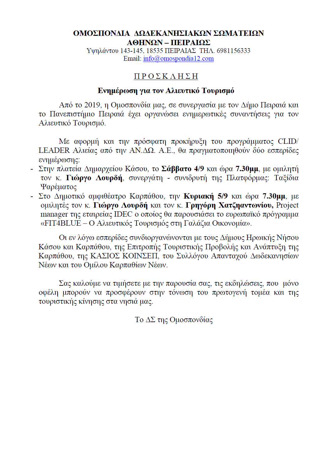Με το υπ. αριθμ. 2012 / 13-11-2020 έγγραφο μας προς τον Δήμαρχο Καρπάθου κ. Ιωάννη Νισύριο και