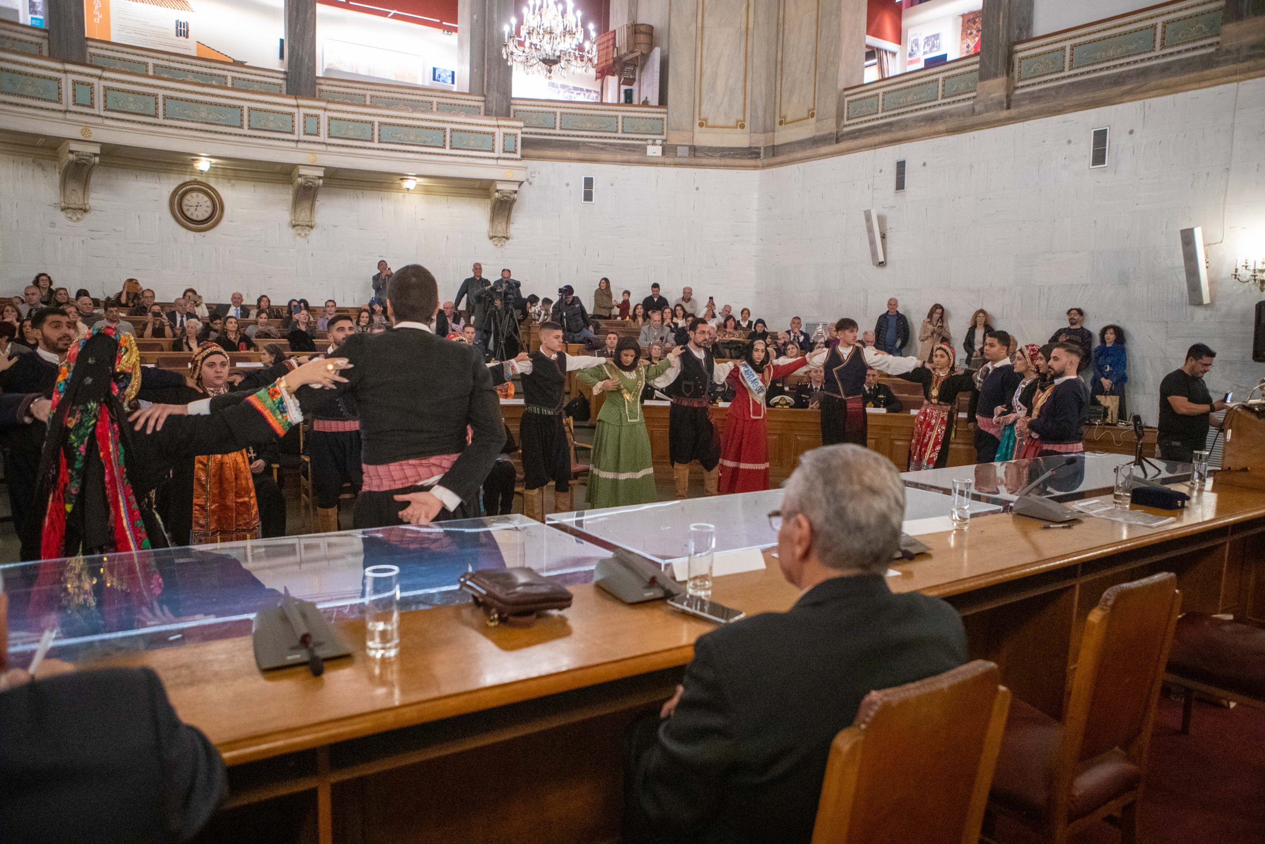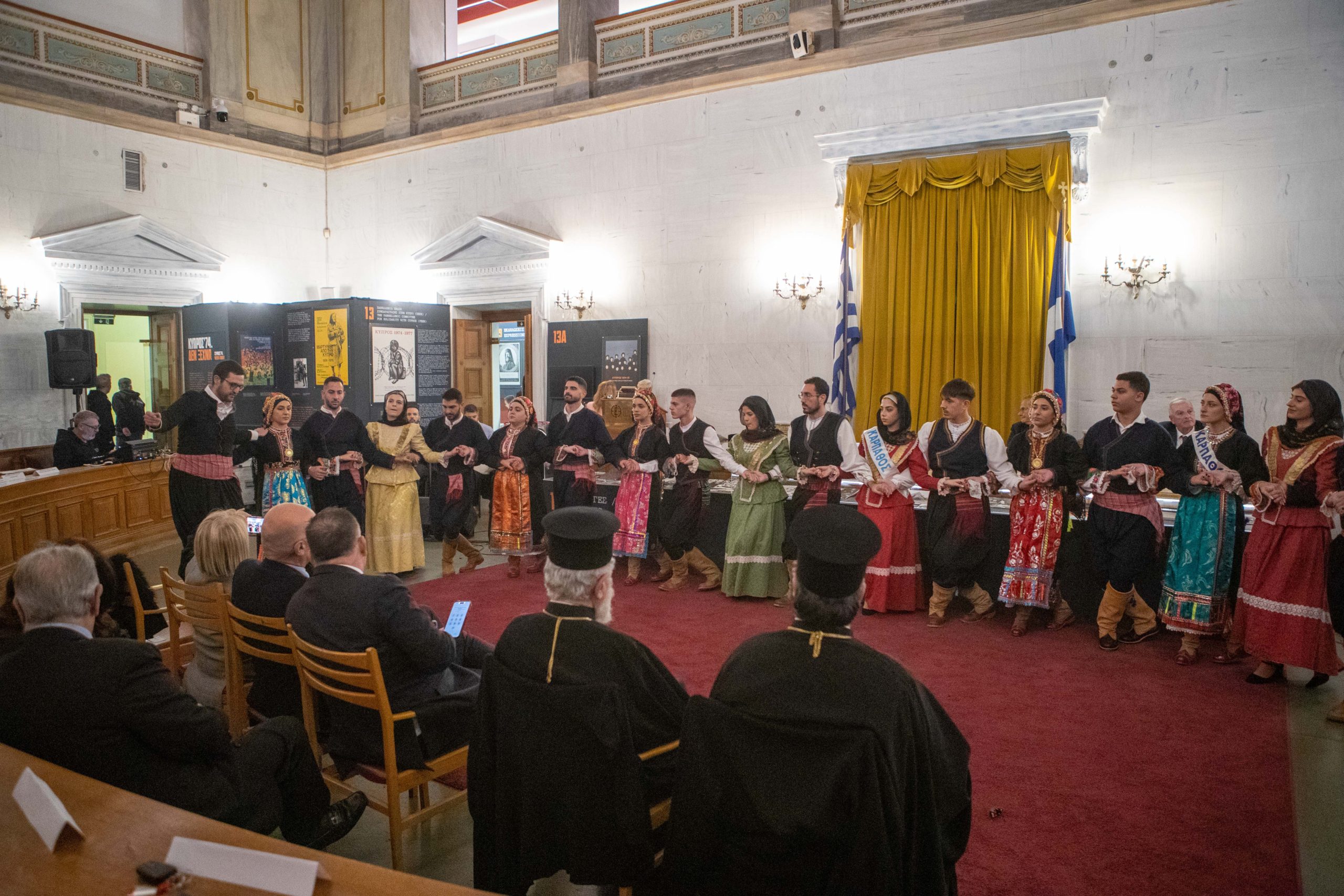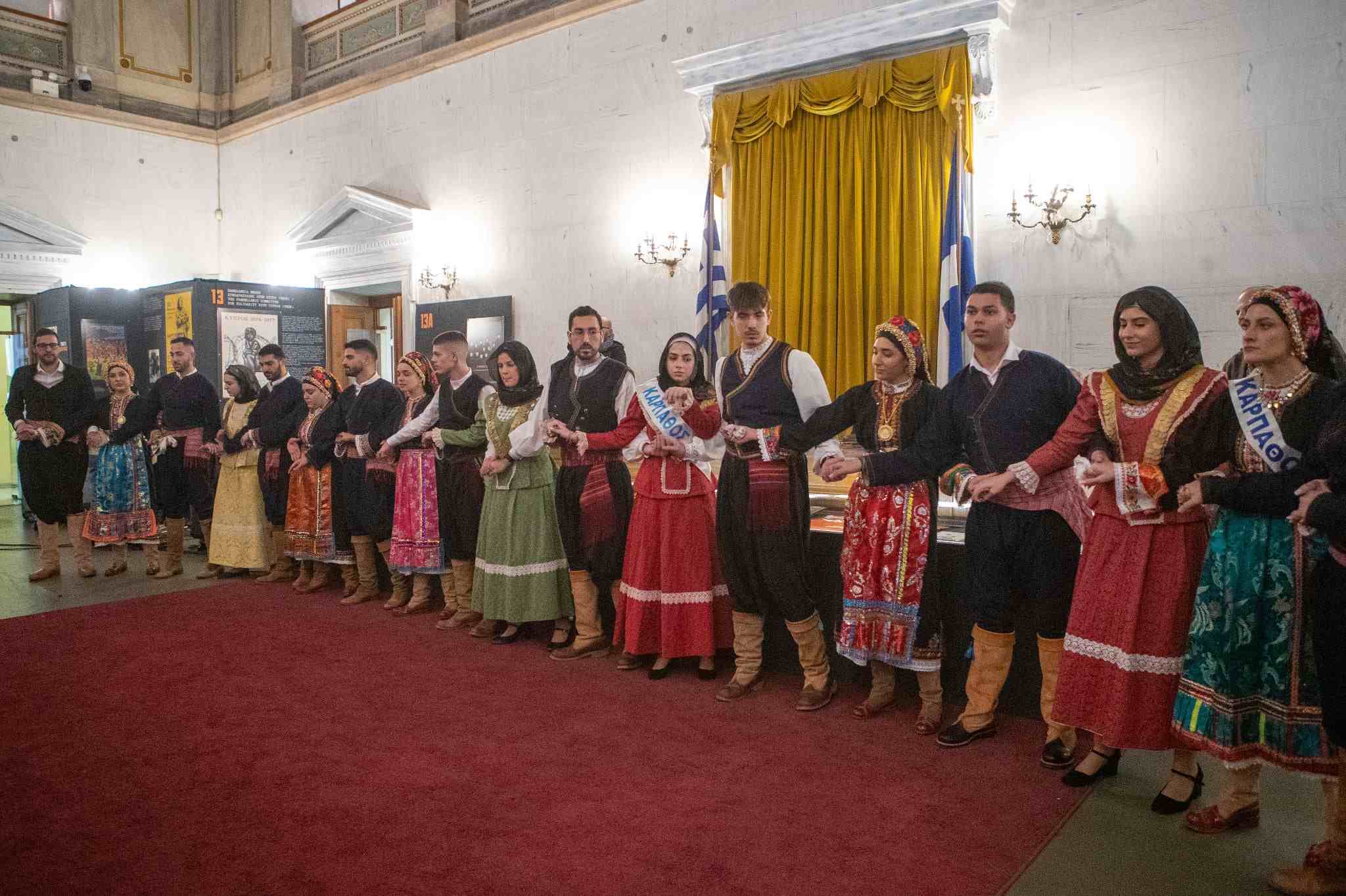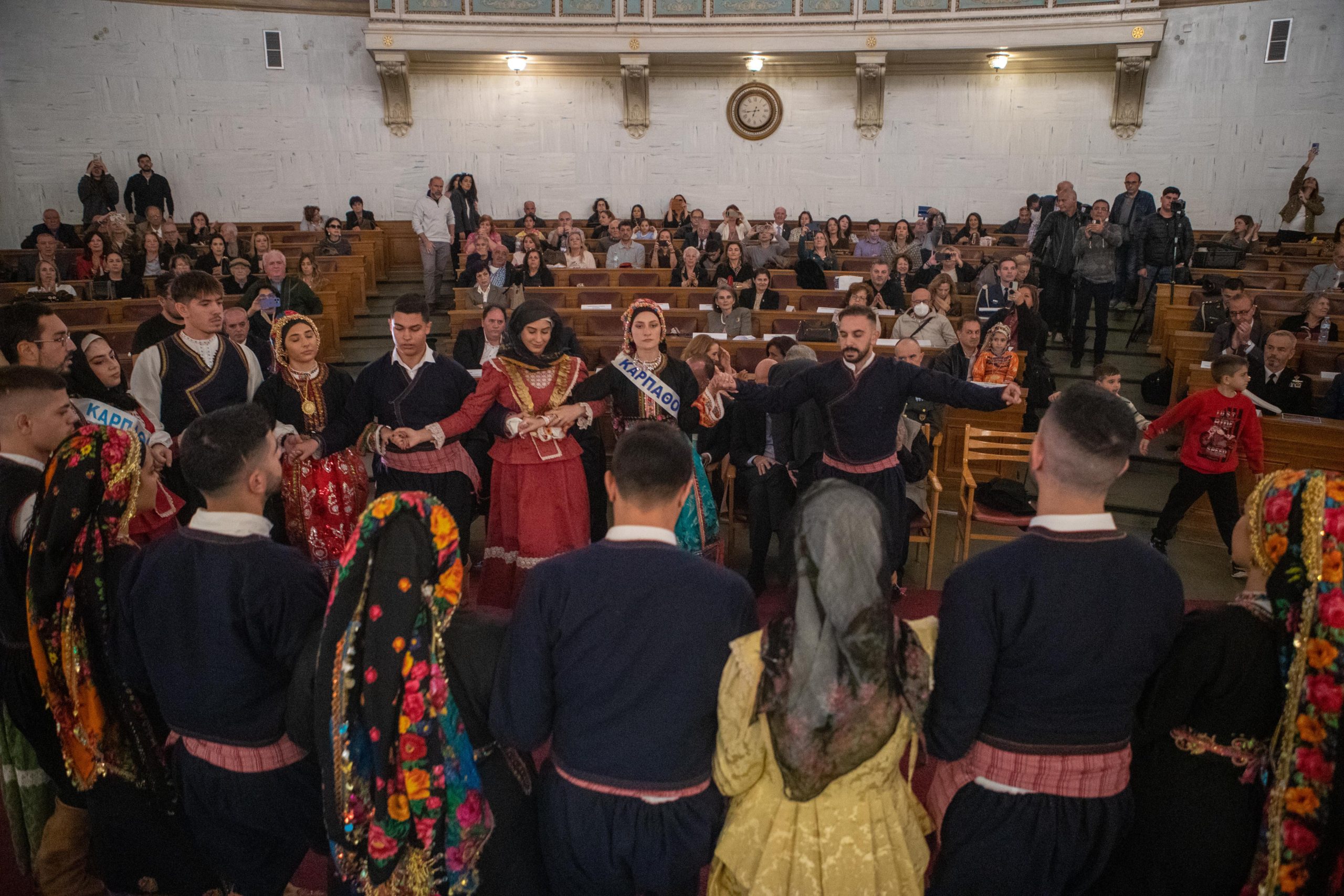 H εκδήλωση συνεχίστηκε στο ιστορικό κτήριο της Παλαιάς Βουλής, παρουσία του τέως Προέδρου της Ελληνικής Δημοκρατίας και εκλεκτού φίλου της Καρπάθου κ. Προκόπιου Παυλόπουλου. Η εκδήλωση ξεκίνησε με την παρουσίαση των χωριών και τοπικών Συλλόγων της Καρπάθου και νησιών της Δωδεκανήσου που εκπροσωπούσαν νέες από τον Όμιλο Καρπαθίων Νέων και τον Σύλλογο Απανταχού Δωδεκανησίων Νέων, ντυμένες με τοπικές ενδυμασίες. Ακολούθησαν απαγγελία μαντινάδων για την Επανάσταση και Απελευθέρωση της Καρπάθου από παιδιά τοπικών συλλόγων της Καρπάθου και χοροί από παιδιά της Αδελφότητας Ολυμπιτών Καρπάθου «Η Δήμητρα».