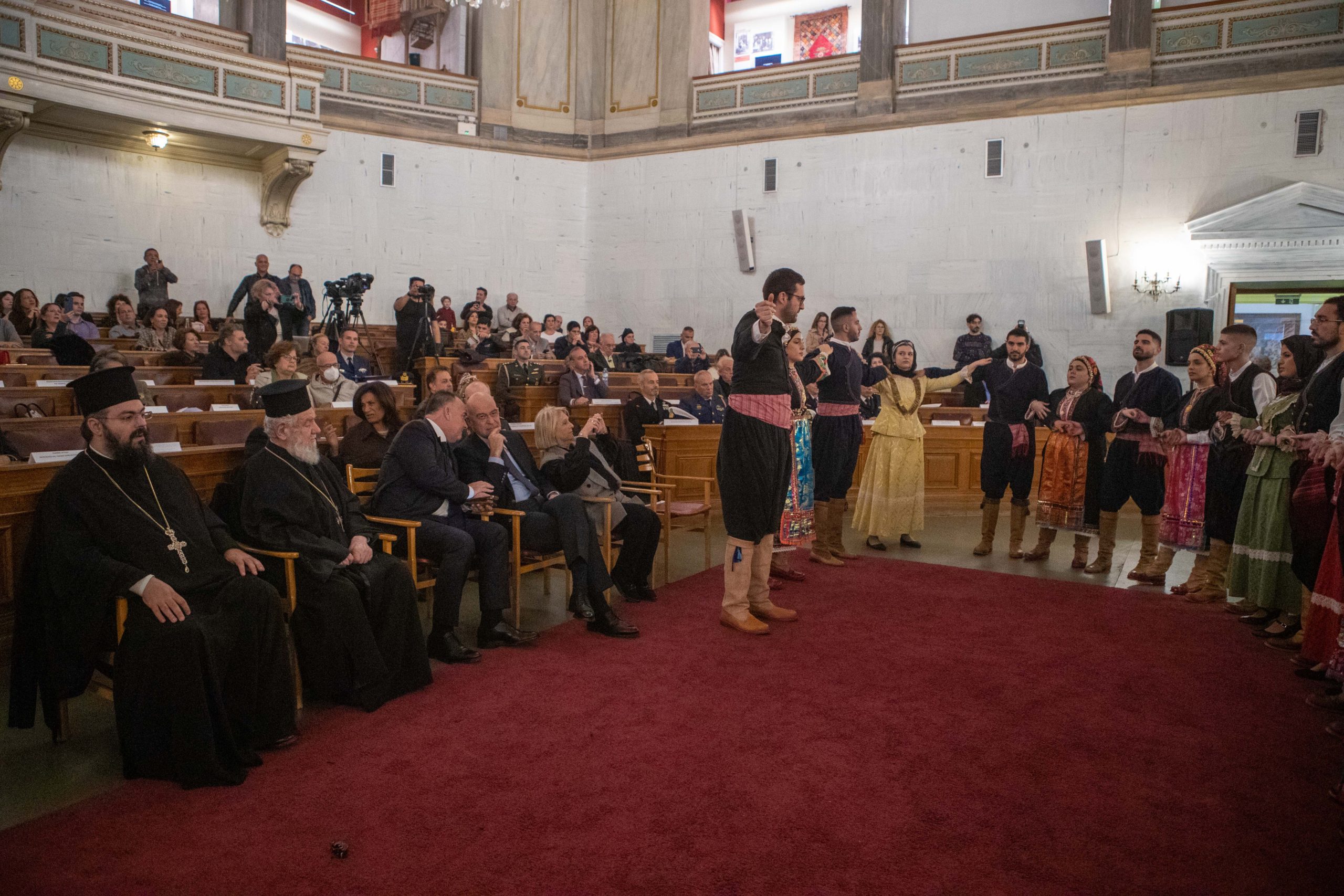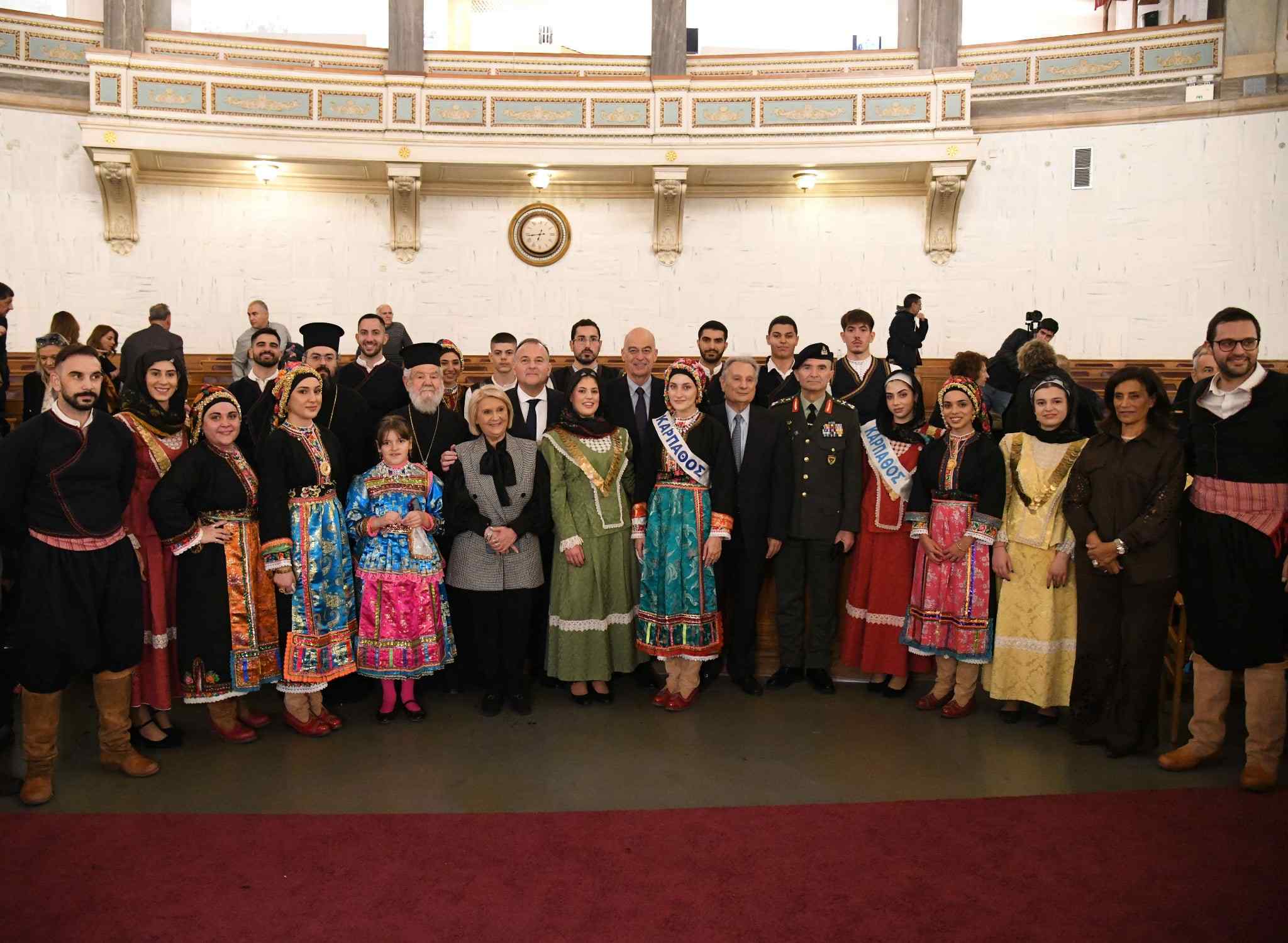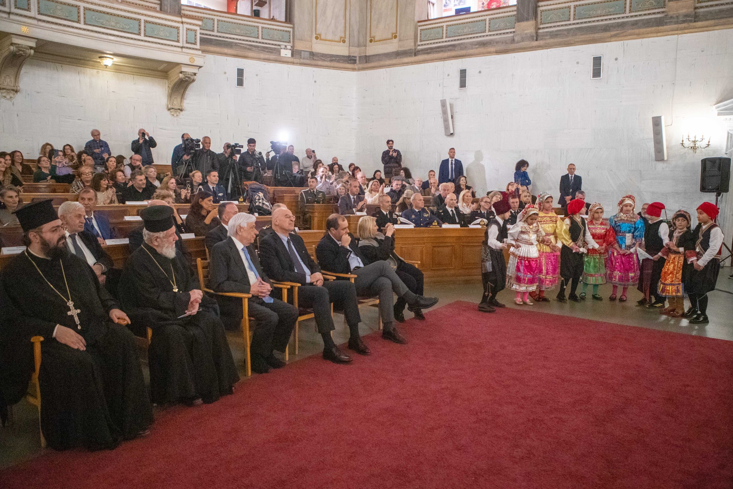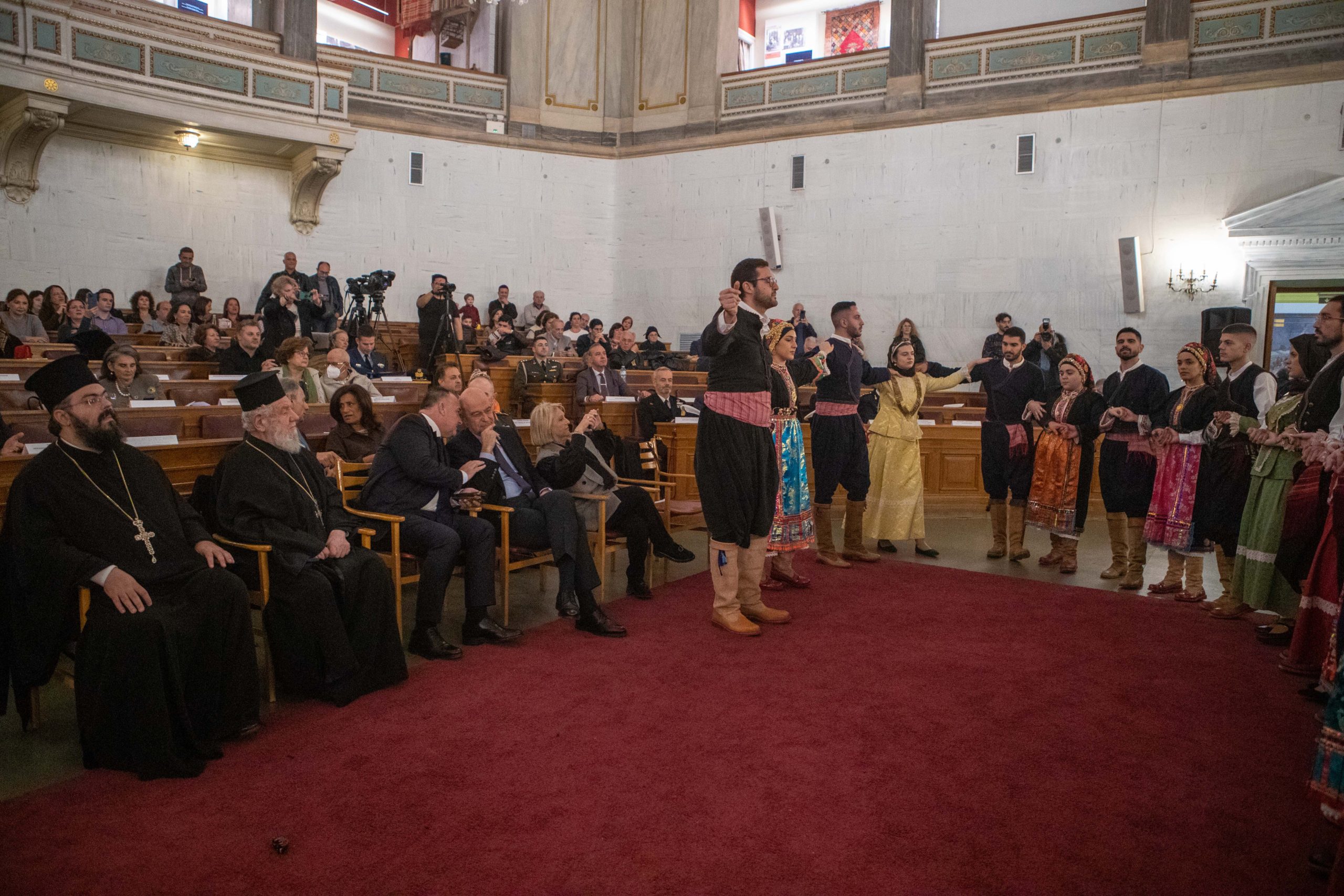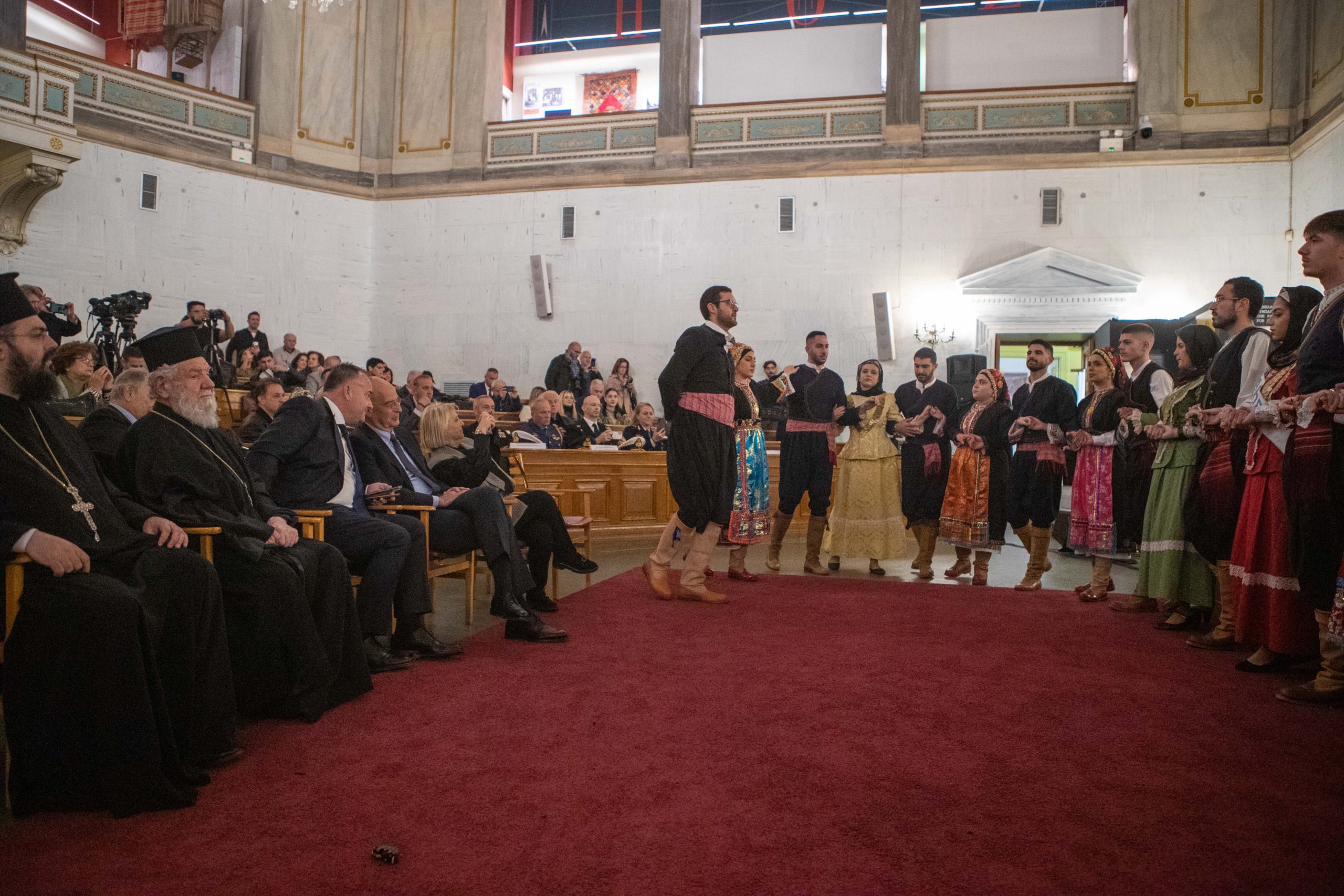 H εκδήλωση συνεχίστηκε στο ιστορικό κτήριο της Παλαιάς Βουλής, παρουσία του τέως Προέδρου της Ελληνικής Δημοκρατίας και εκλεκτού φίλου της Καρπάθου κ. Προκόπιου Παυλόπουλου. Η εκδήλωση ξεκίνησε με την παρουσίαση των χωριών και τοπικών Συλλόγων της Καρπάθου και νησιών της Δωδεκανήσου που εκπροσωπούσαν νέες από τον Όμιλο Καρπαθίων Νέων και τον Σύλλογο Απανταχού Δωδεκανησίων Νέων, ντυμένες με τοπικές ενδυμασίες. Ακολούθησαν απαγγελία μαντινάδων για την Επανάσταση και Απελευθέρωση της Καρπάθου από παιδιά τοπικών συλλόγων της Καρπάθου και χοροί από παιδιά της Αδελφότητας Ολυμπιτών Καρπάθου «Η Δήμητρα».