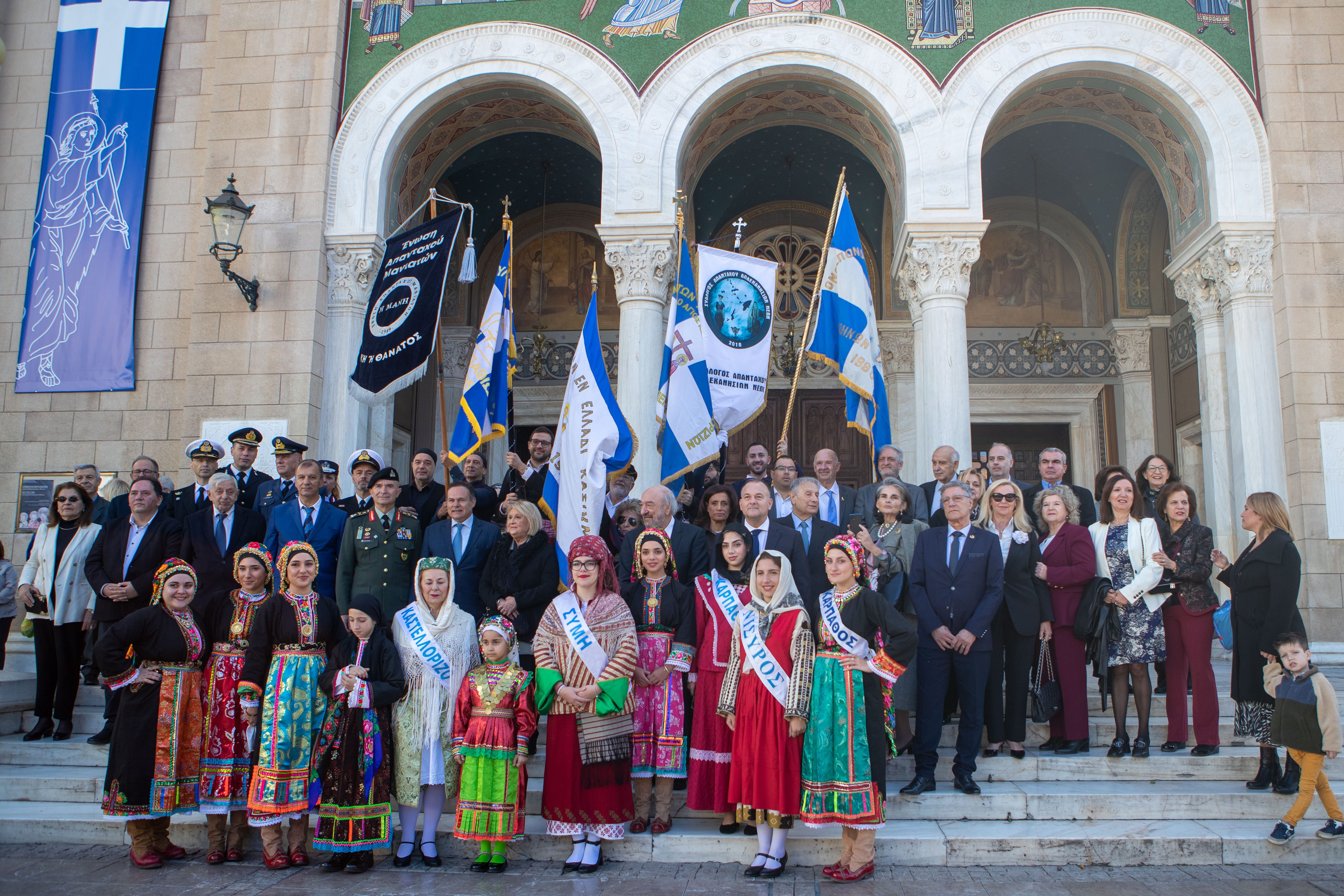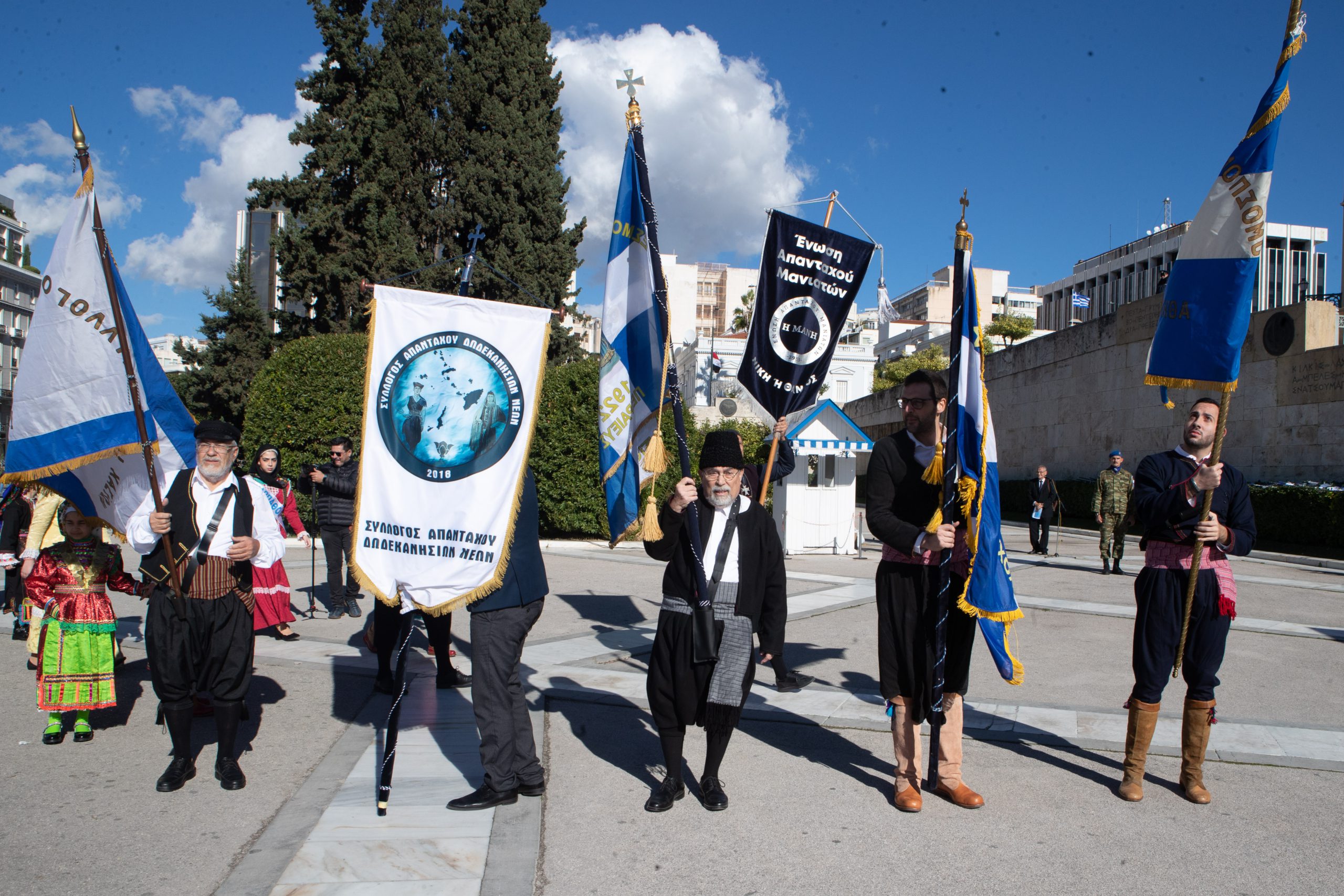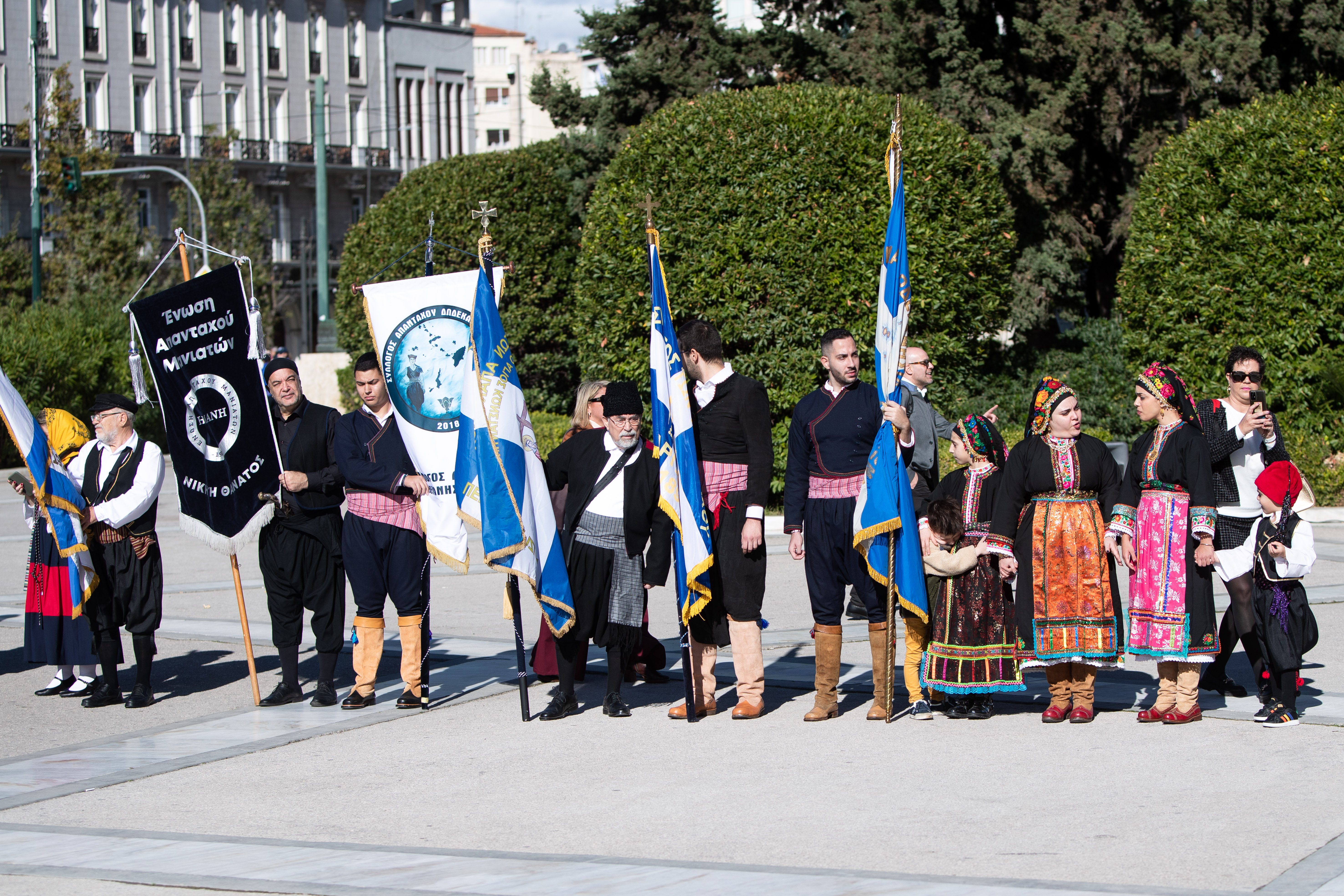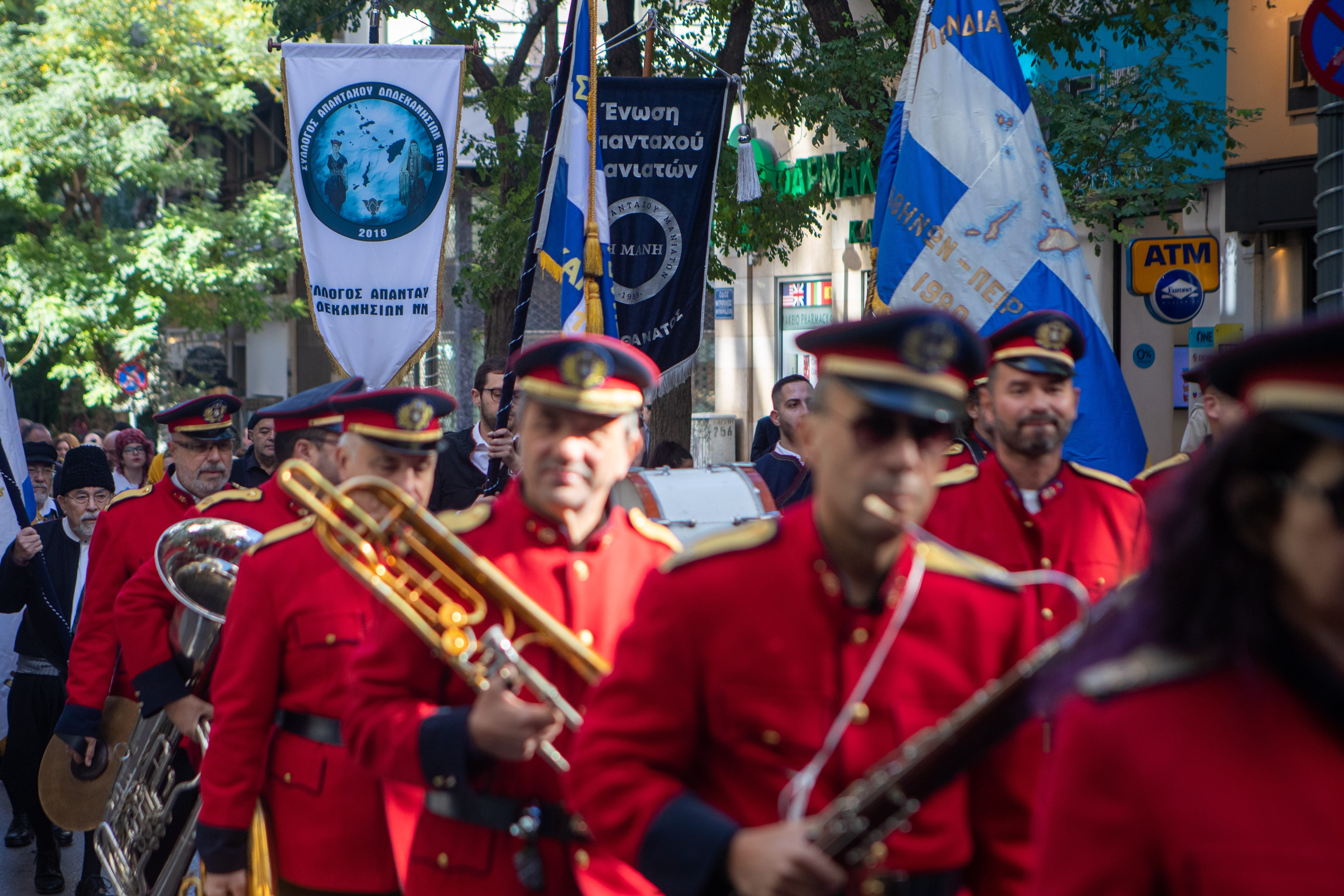 Μετά το πέρας της δοξολογίας ακολούθησε πολυπληθής πομπή από την Ιερά Μητρόπολη κατά μήκος της οδού Μητροπόλεως μέχρι το Σύνταγμα. Προπορεύονταν τα λάβαρα του Συλλόγου των Απανταχού Καρπαθίων, του Συλλόγου των Εν Ελλάδι Κασίων, της Ομοσπονδίας Δωδεκανησιακών Σωματείων, της Ένωσης Απανταχού Μανιατών, του Συλλόγου Απανταχού Δωδεκανησίων Νέων και του Ομίλου Καρπαθίων Νέων, με τη συνοδεία νέων, ντυμένων με τοπικές ενδυμασίες. Την παρέλαση, η οποία κατέληξε στο Μνημείο του Αγνώστου Στρατιώτη, παιάνισε η Φιλαρμονική Ορχήστρα του Δήμου Αθηναίων.