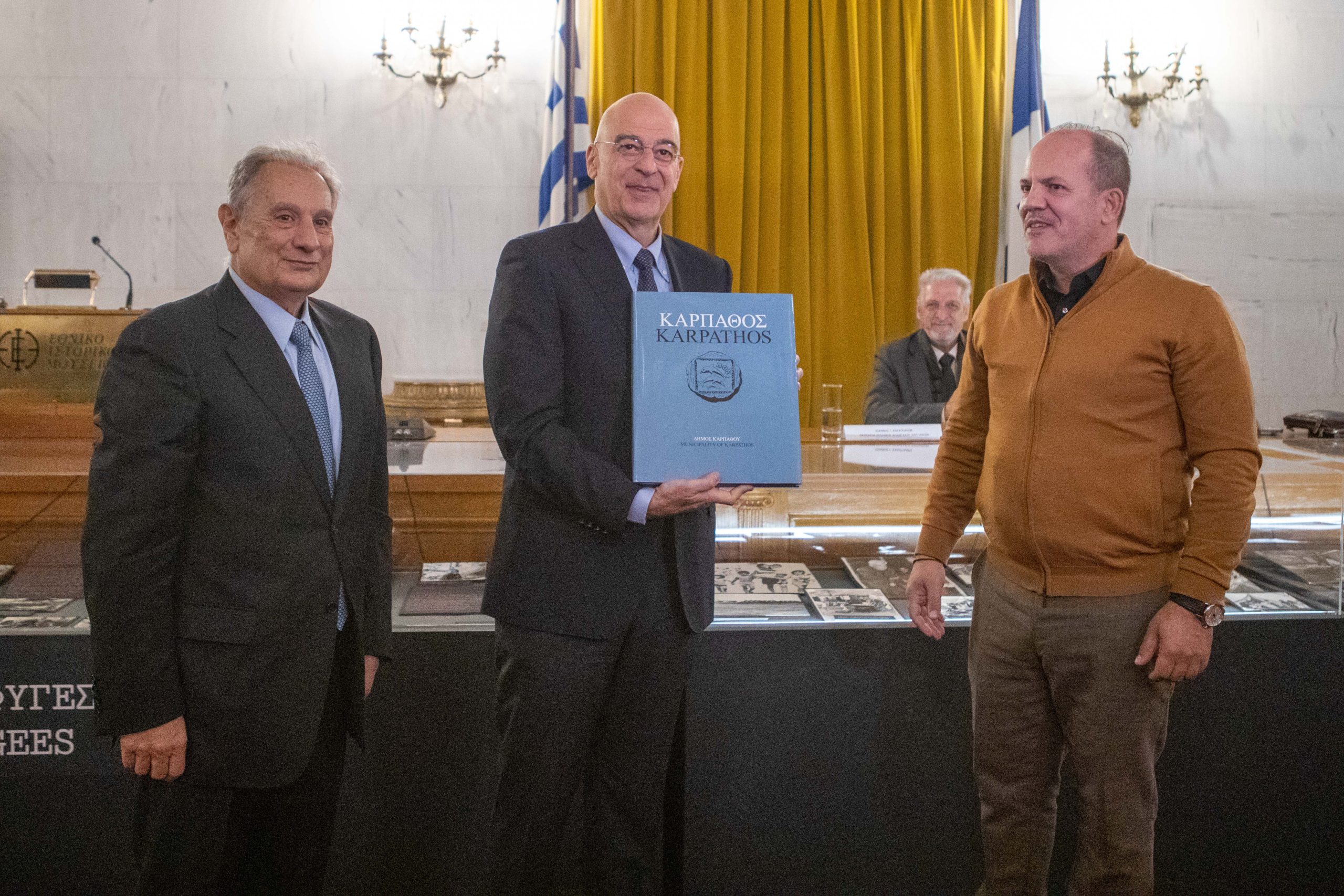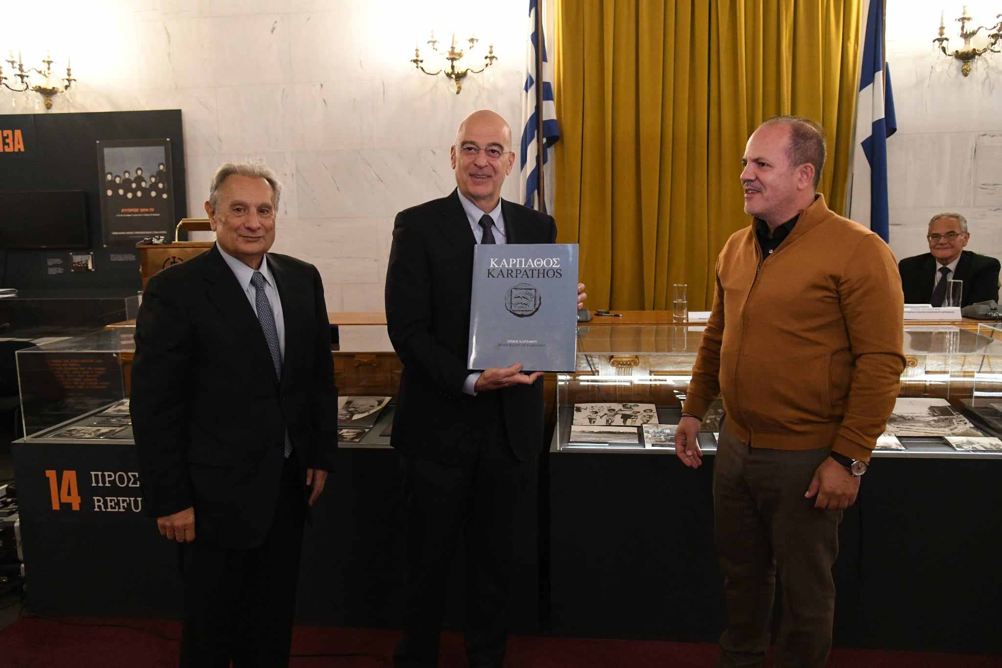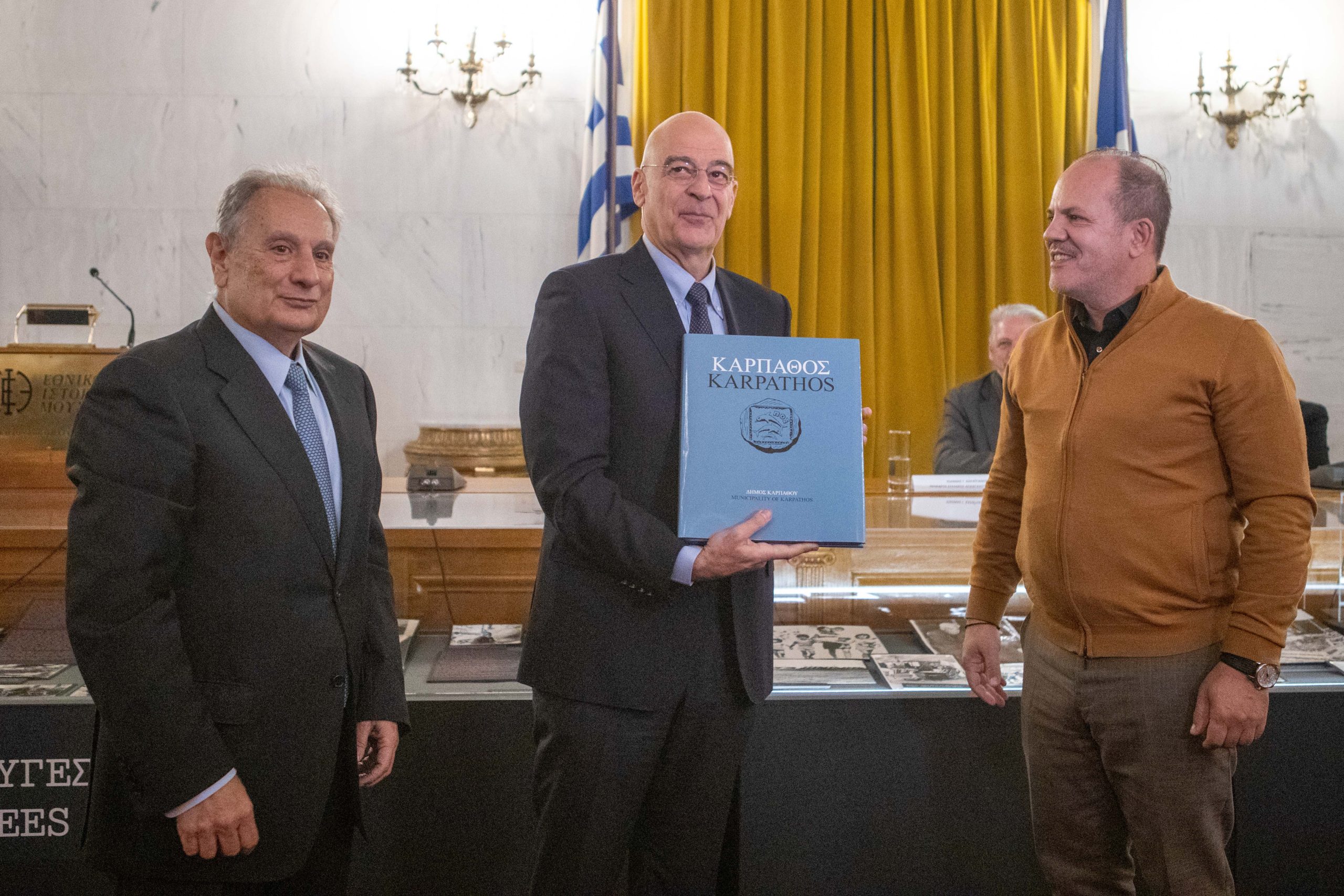 Ο Σύλλογος των Απανταχού Καρπαθίων απένειμε στον Υπουργό Εθνικής Άμυνας τιμητική πλακέτα σε αναγνώριση της πολύχρονης εθνικής προσφοράς του στην ενίσχυση της αμυντικής και αποτρεπτικής ικανότητας της χώρας και στη θωράκιση των νησιών και της πατρίδας μας, ενώ ο κ. Υπουργός παρέλαβε από τον Ιωάννη Βασιλάκη, ερευνητή και συγγραφέα, την έκδοση επιμέλειας του ιδίου και πρωτοβουλίας του δήμου Καρπάθου “Κάρπαθος-Karpathos: Ένα Λεύκωμα Μνήμης και Ιστορίας”. Ακολούθως ο Υπουργός Εθνικής Άμυνας απένειμε στον πρόεδρο του Σ.Α.Κ. Καθηγητή Ιωάννη Καραϊτιανό τον θυρεό του Υπουργείου Εθνικής Άμυνας.