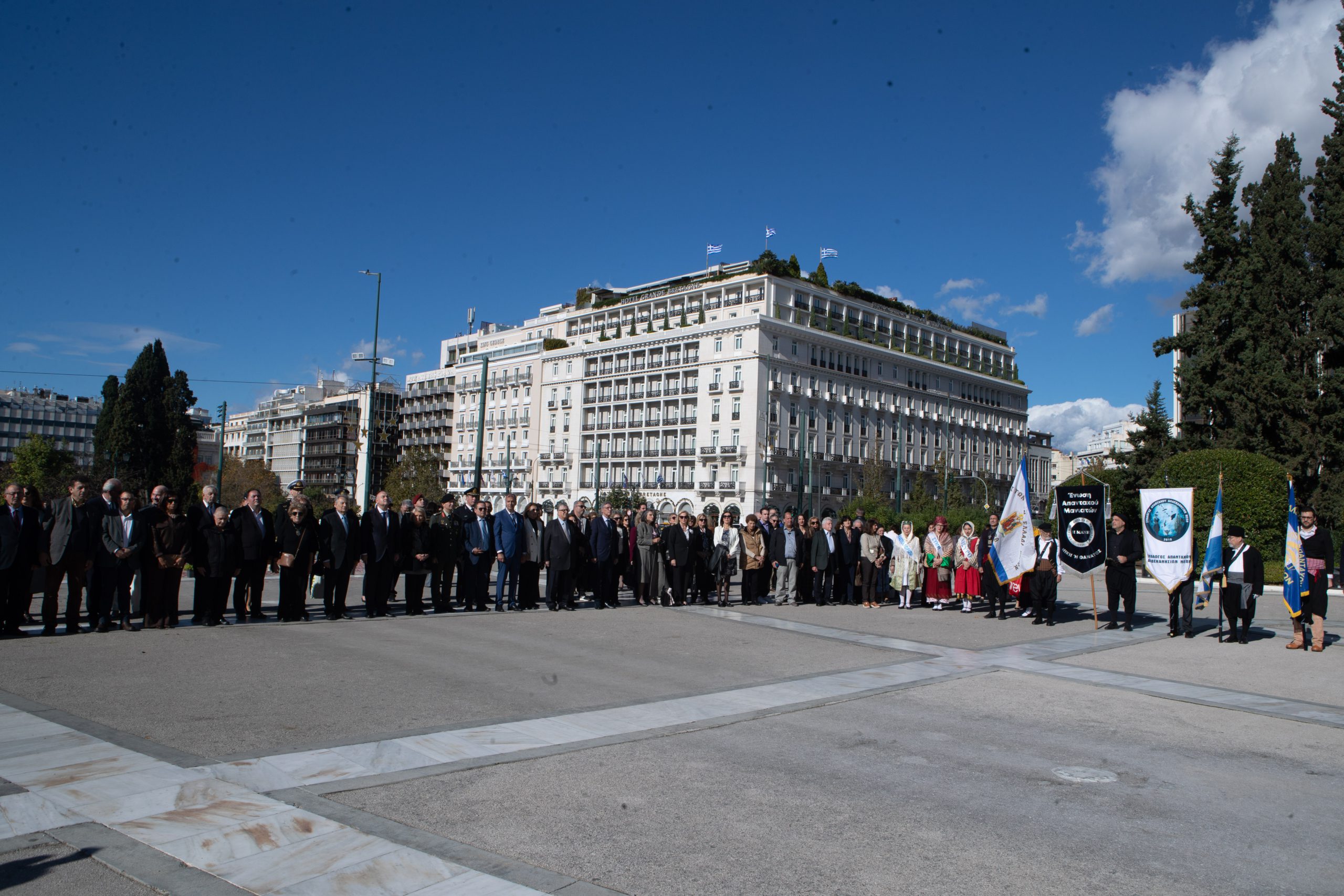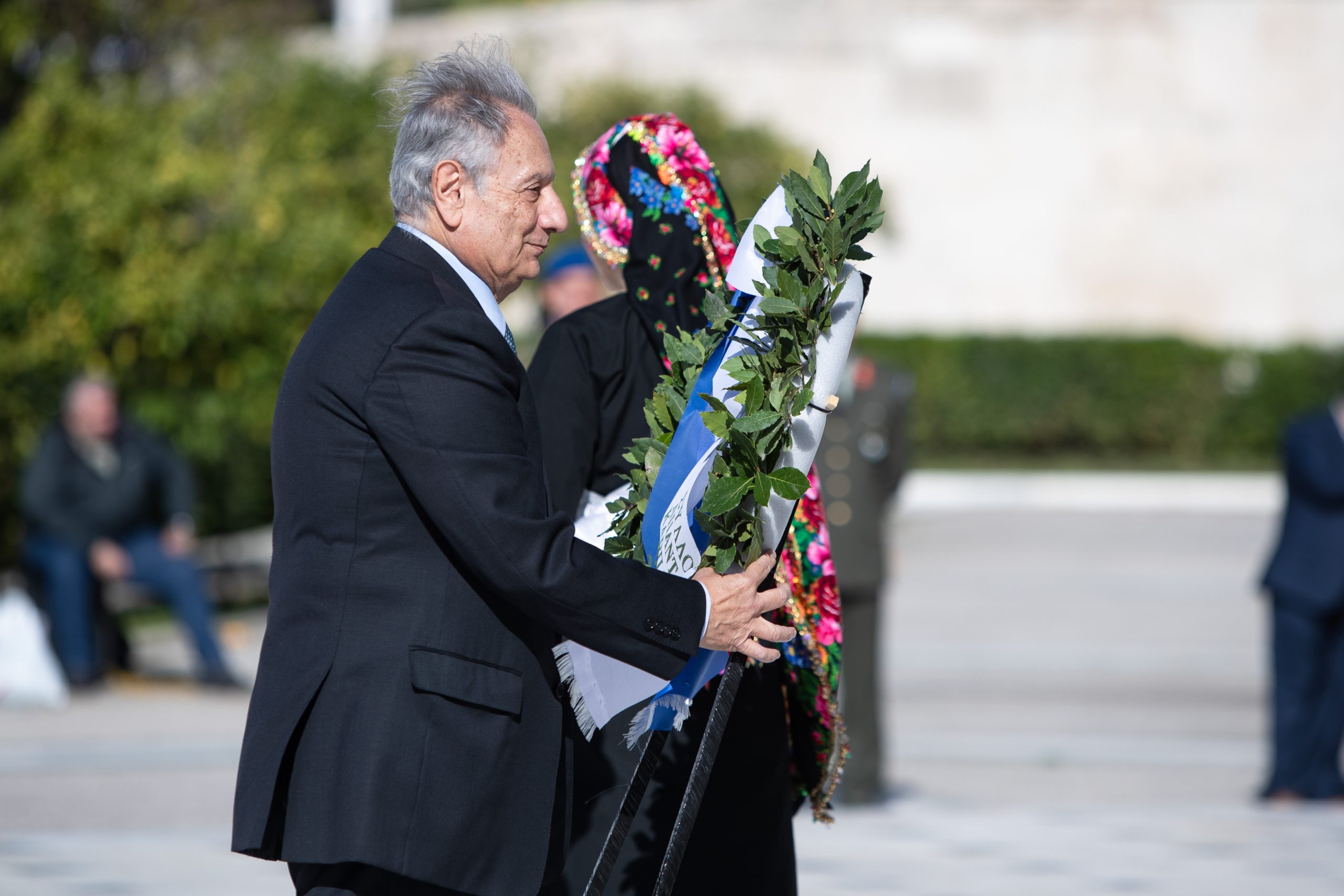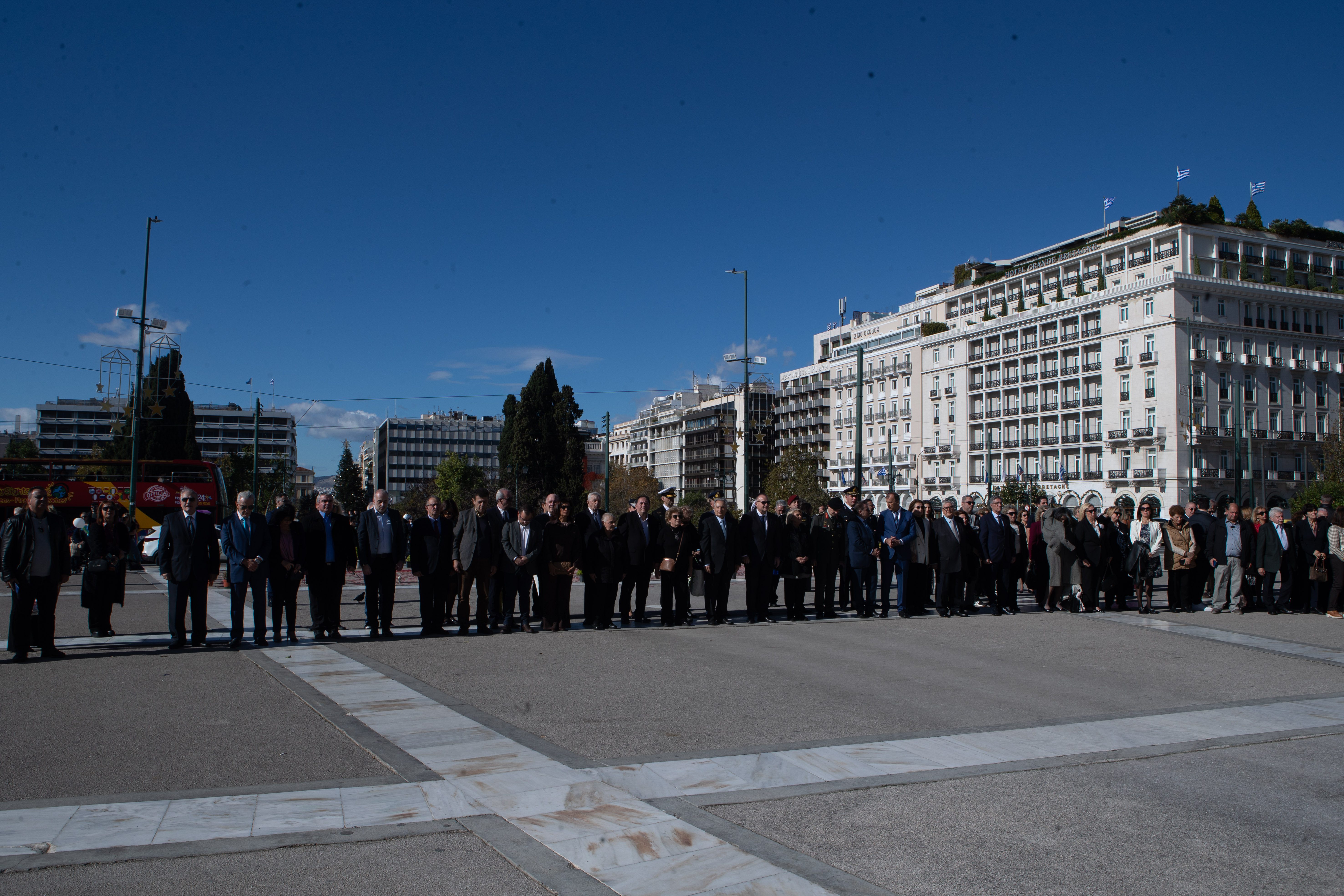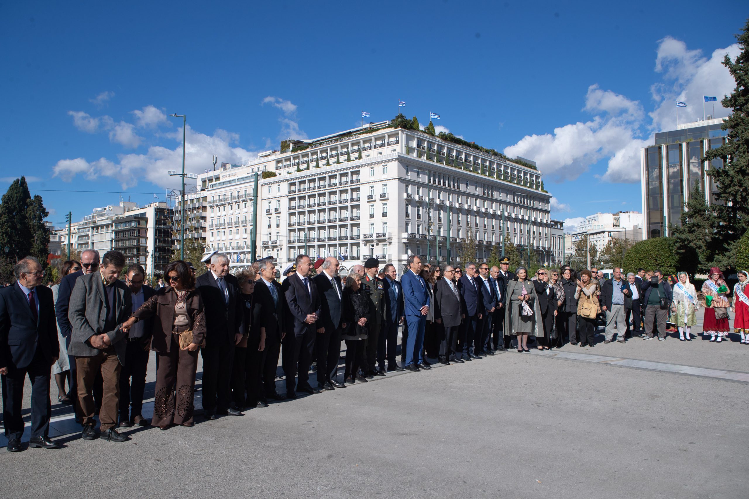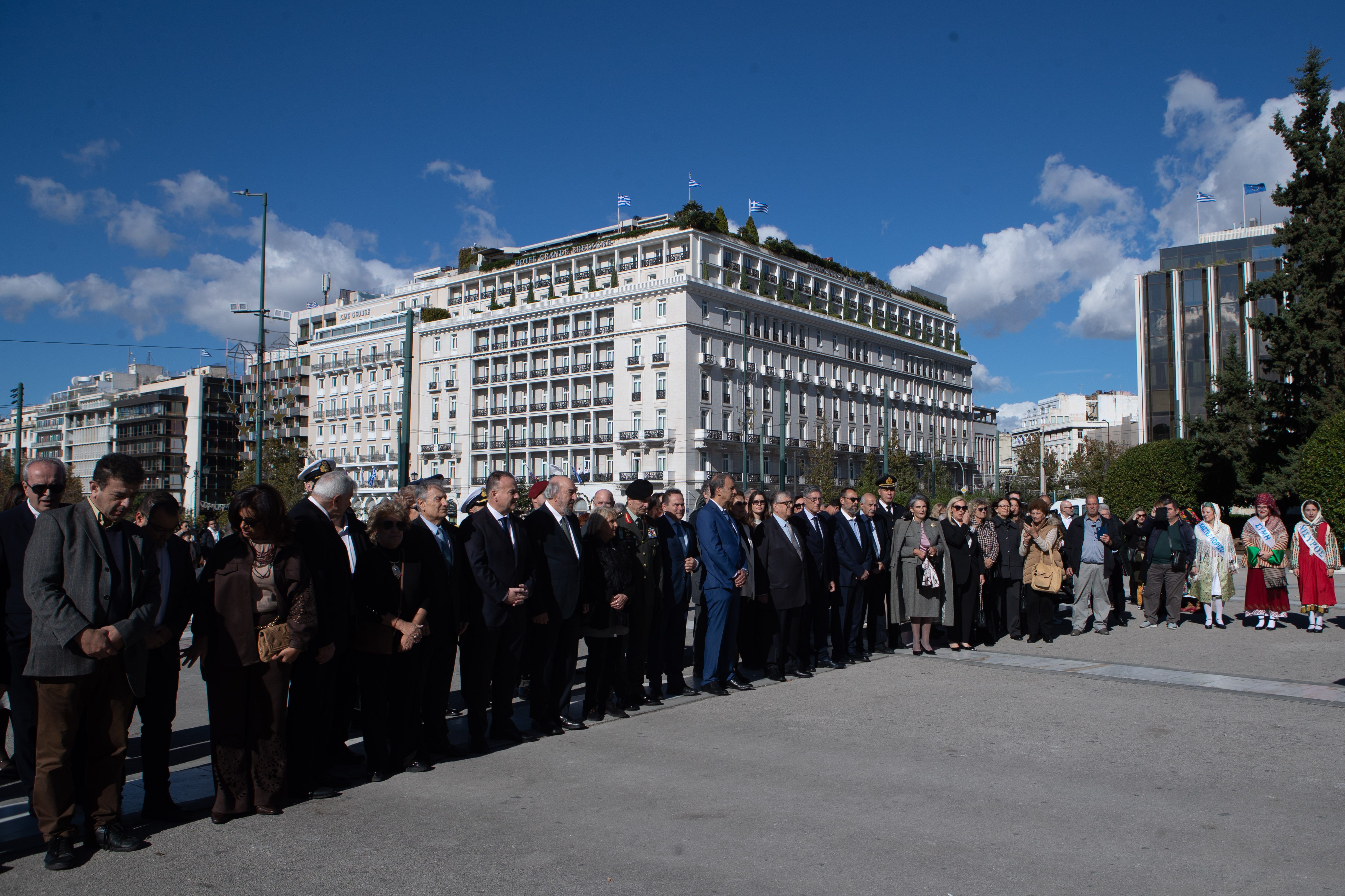 Στο Μνημείο του Αγνώστου Στρατιώτη στις 12:10 μ.μ. πραγματοποιήθηκε κατάθεση στεφάνων από την πολιτική ηγεσία, τις ένοπλες δυνάμεις, την τοπική αυτοδιοίκηση καθώς και δωδεκανησιακούς και καρπαθιακούς φορείς. Τελετάρχης ήταν ο Αντιπρόεδρος του Σ.Α.Κ. Ιωάννης Χριστοδουλάκης και συντονιστές τα μέλη του Σ.Α.Κ. Μιχαήλα Σπανομανωλή-Αμανεζή και Γρηγόρης Χατζηαντωνίου.