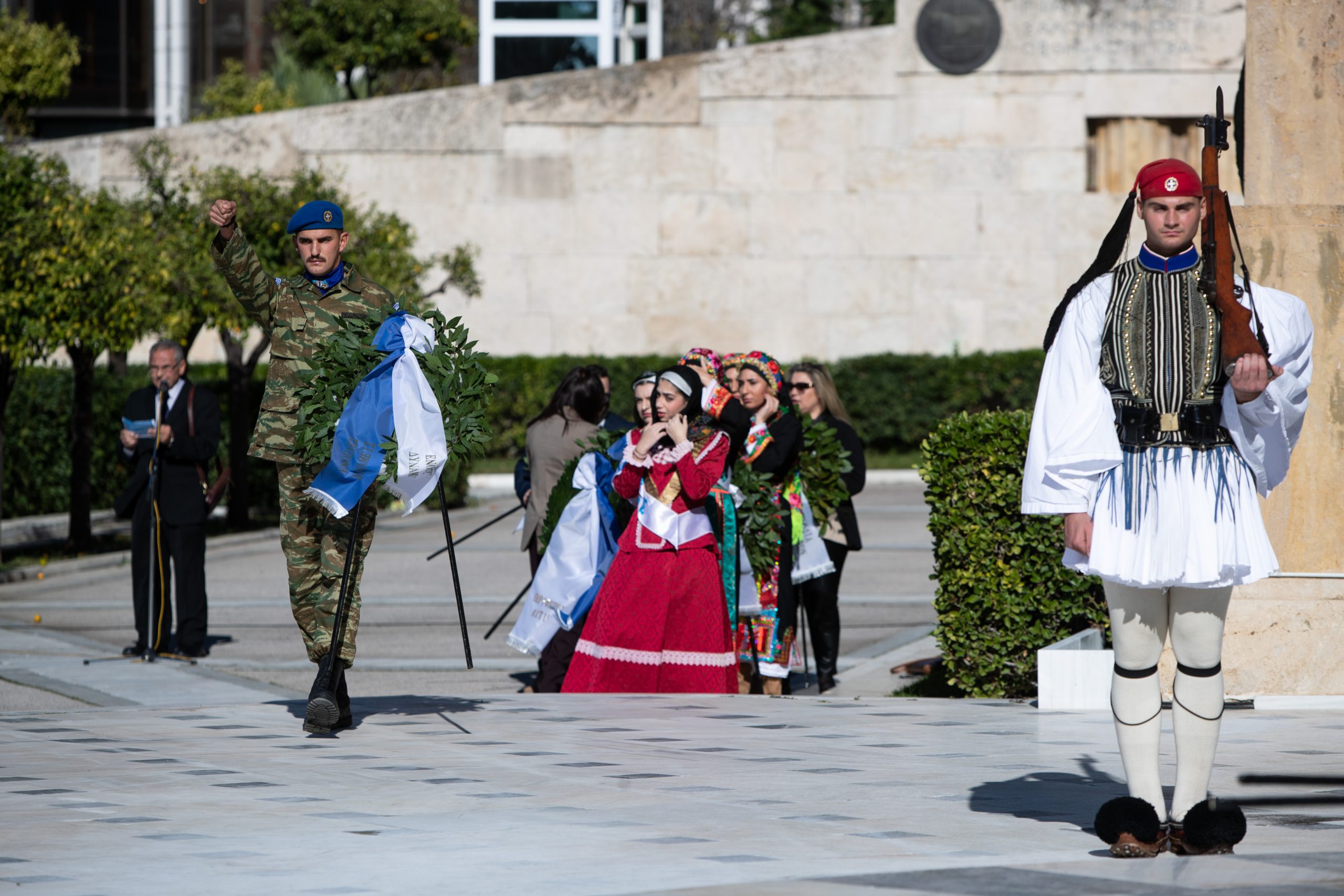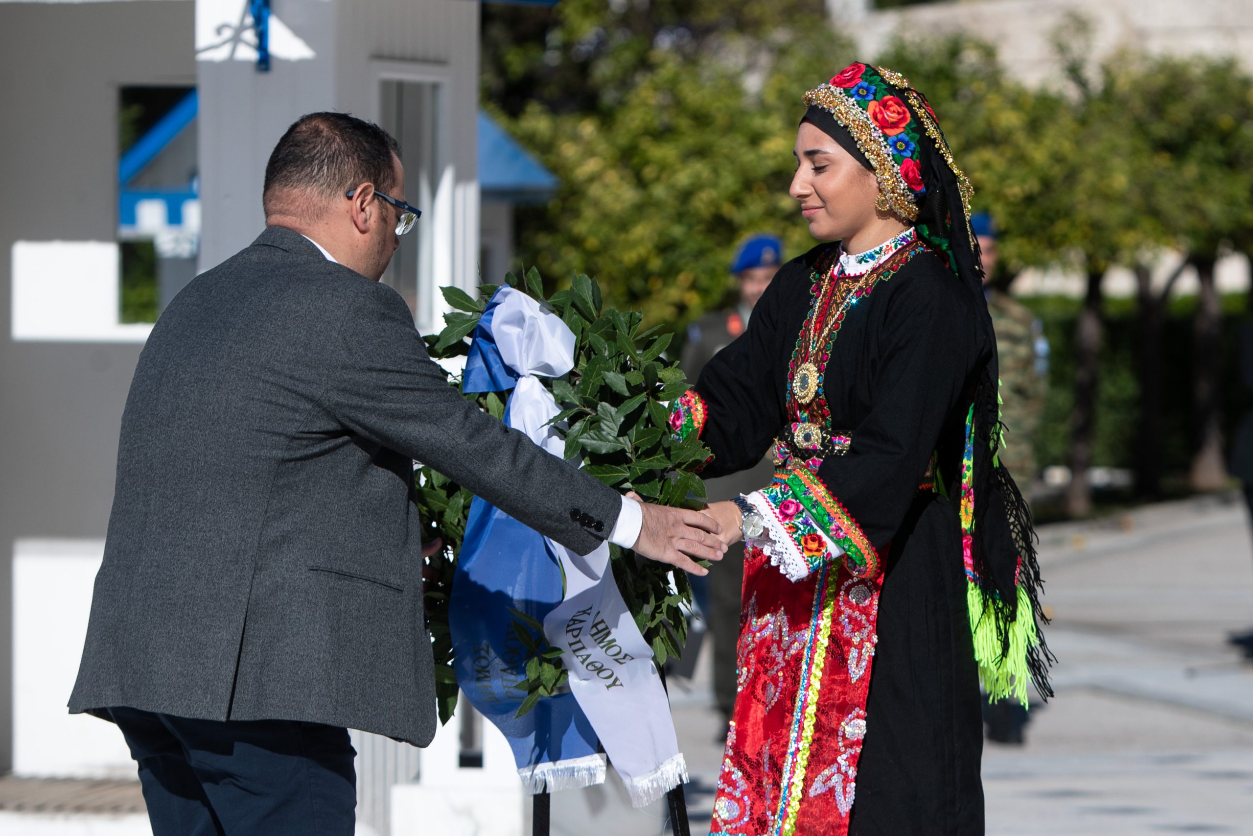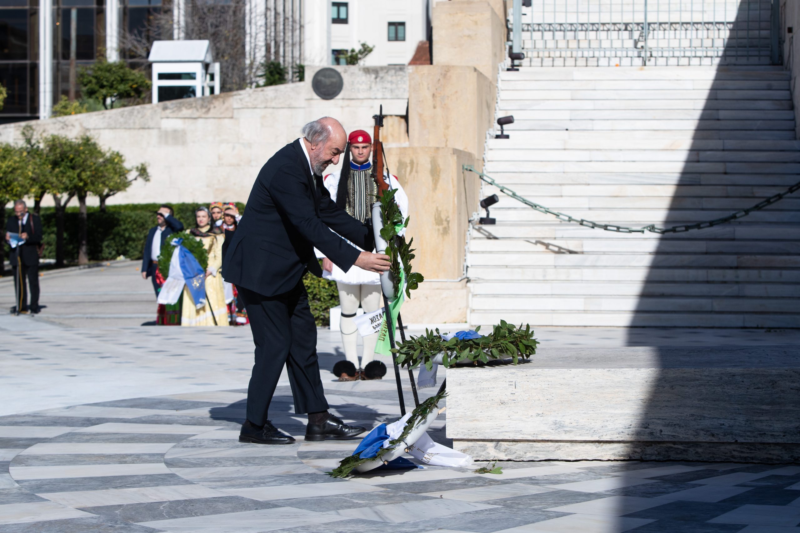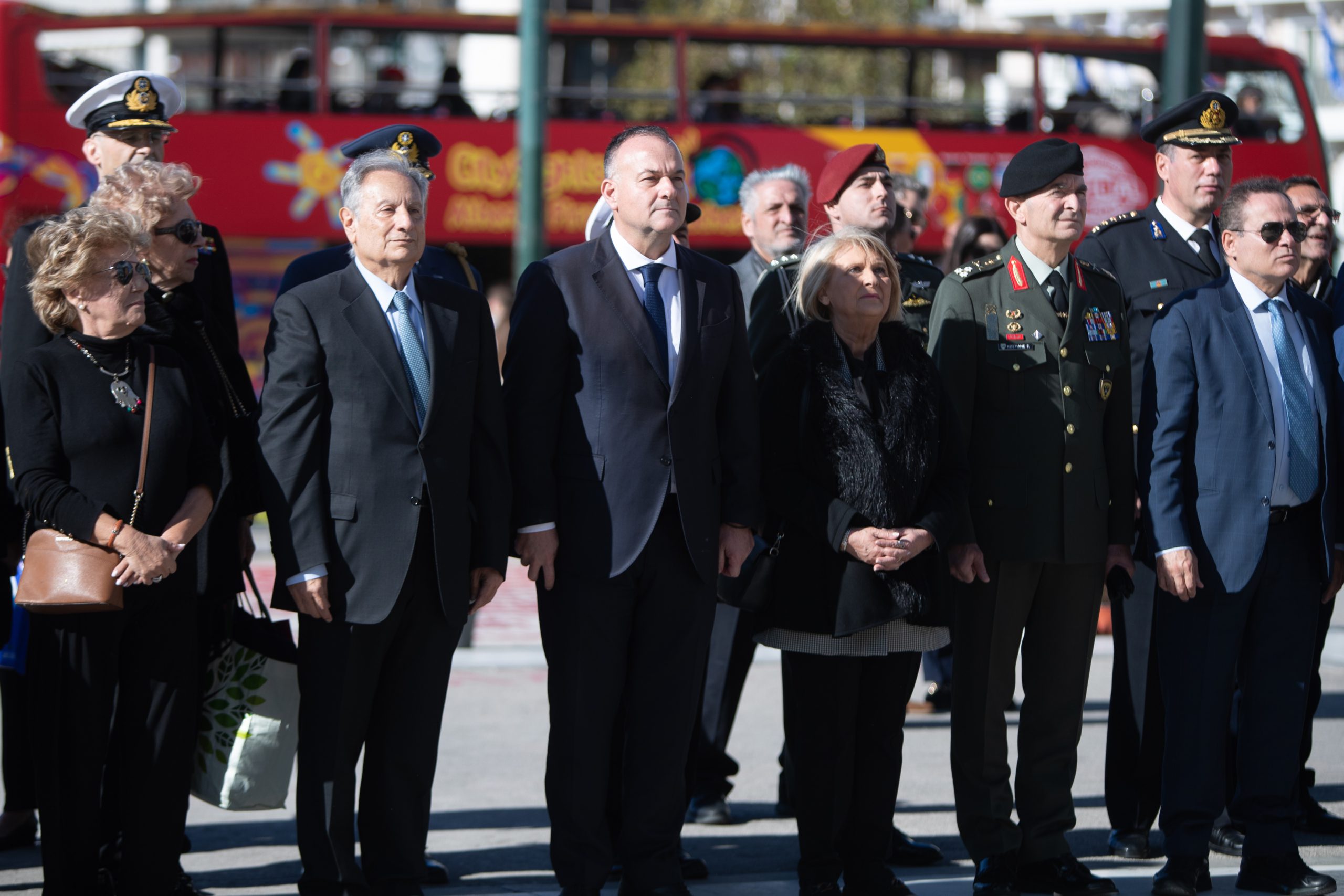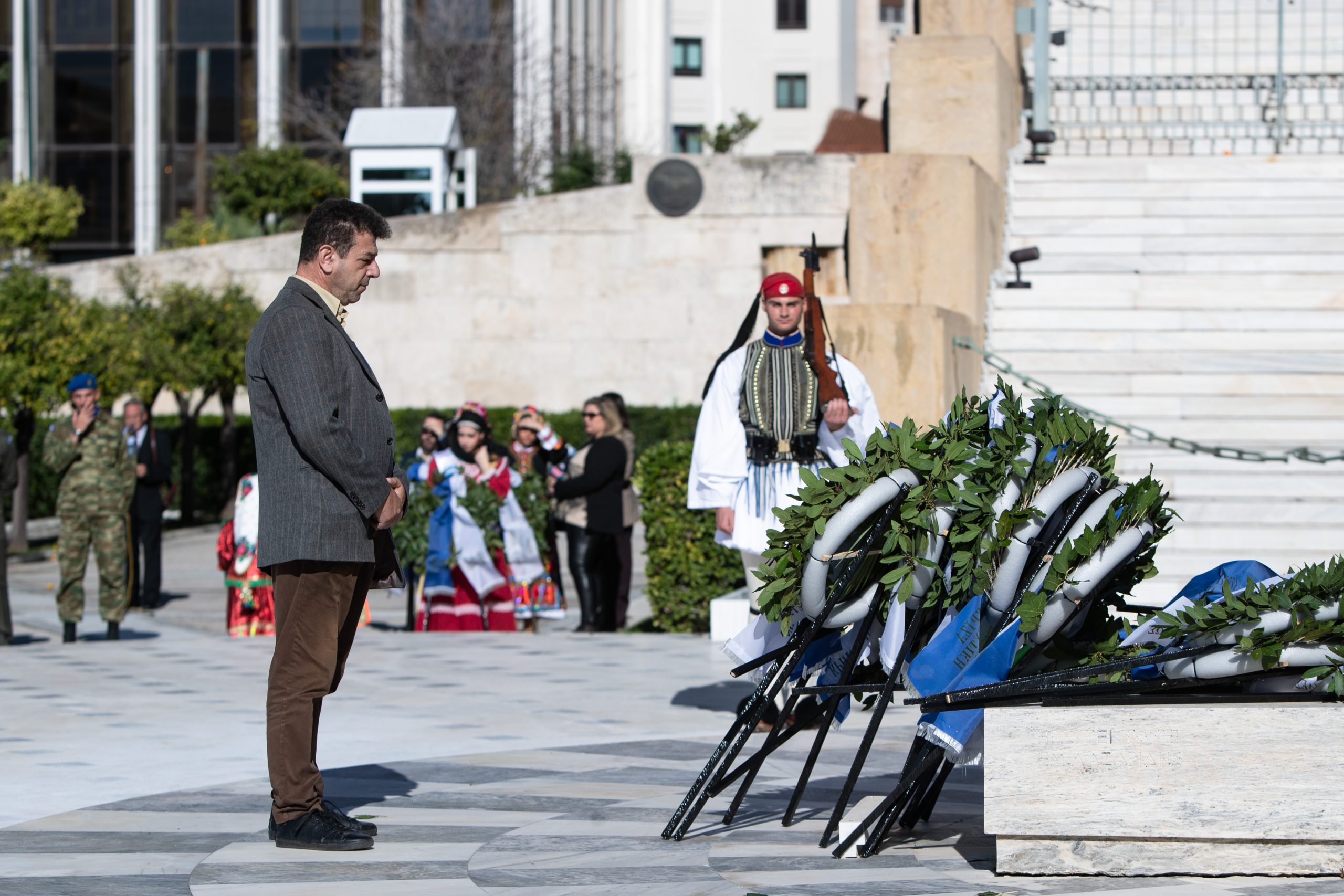 Στο Μνημείο του Αγνώστου Στρατιώτη στις 12:10 μ.μ. πραγματοποιήθηκε κατάθεση στεφάνων από την πολιτική ηγεσία, τις ένοπλες δυνάμεις, την τοπική αυτοδιοίκηση καθώς και δωδεκανησιακούς και καρπαθιακούς φορείς. Τελετάρχης ήταν ο Αντιπρόεδρος του Σ.Α.Κ. Ιωάννης Χριστοδουλάκης και συντονιστές τα μέλη του Σ.Α.Κ. Μιχαήλα Σπανομανωλή-Αμανεζή και Γρηγόρης Χατζηαντωνίου.