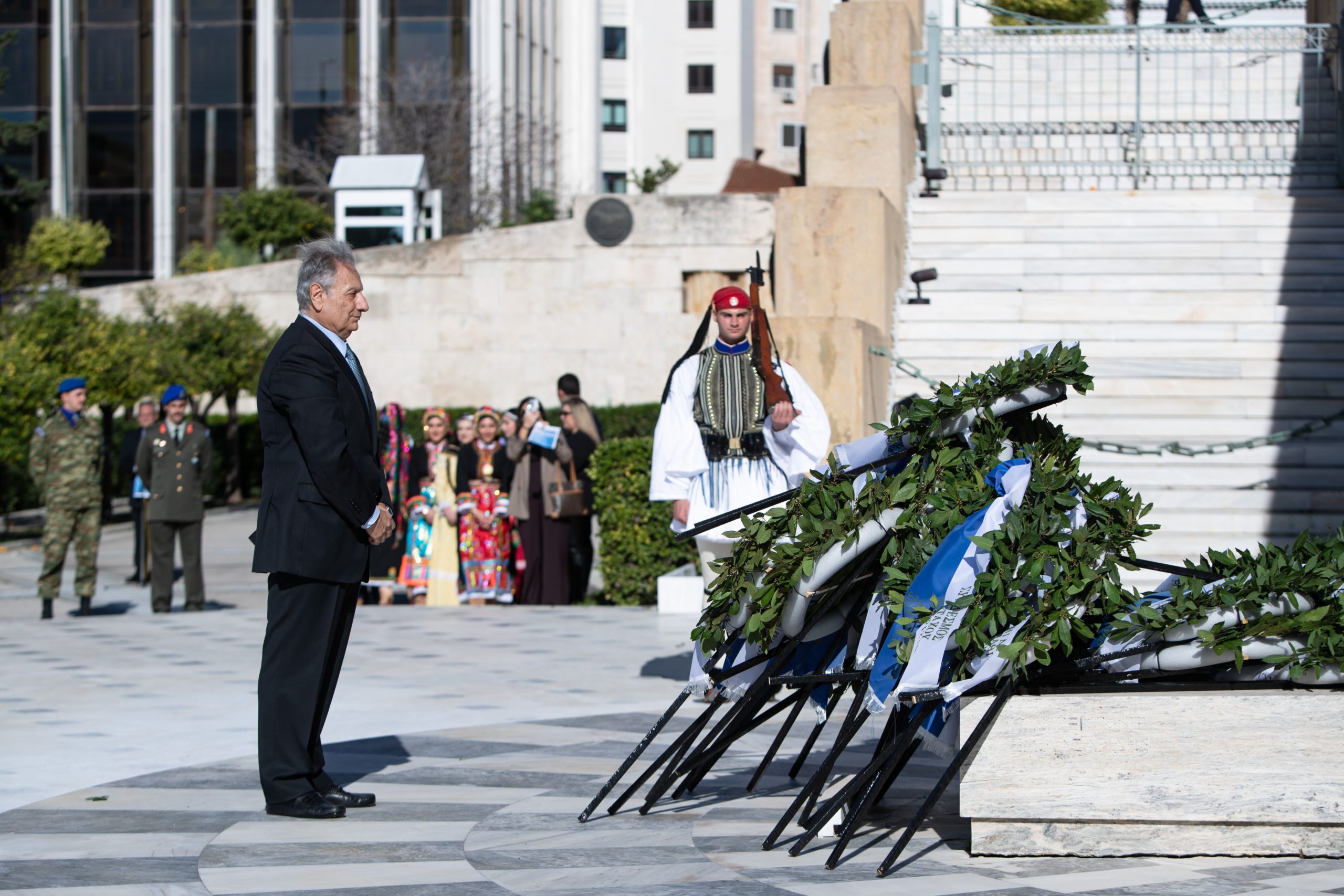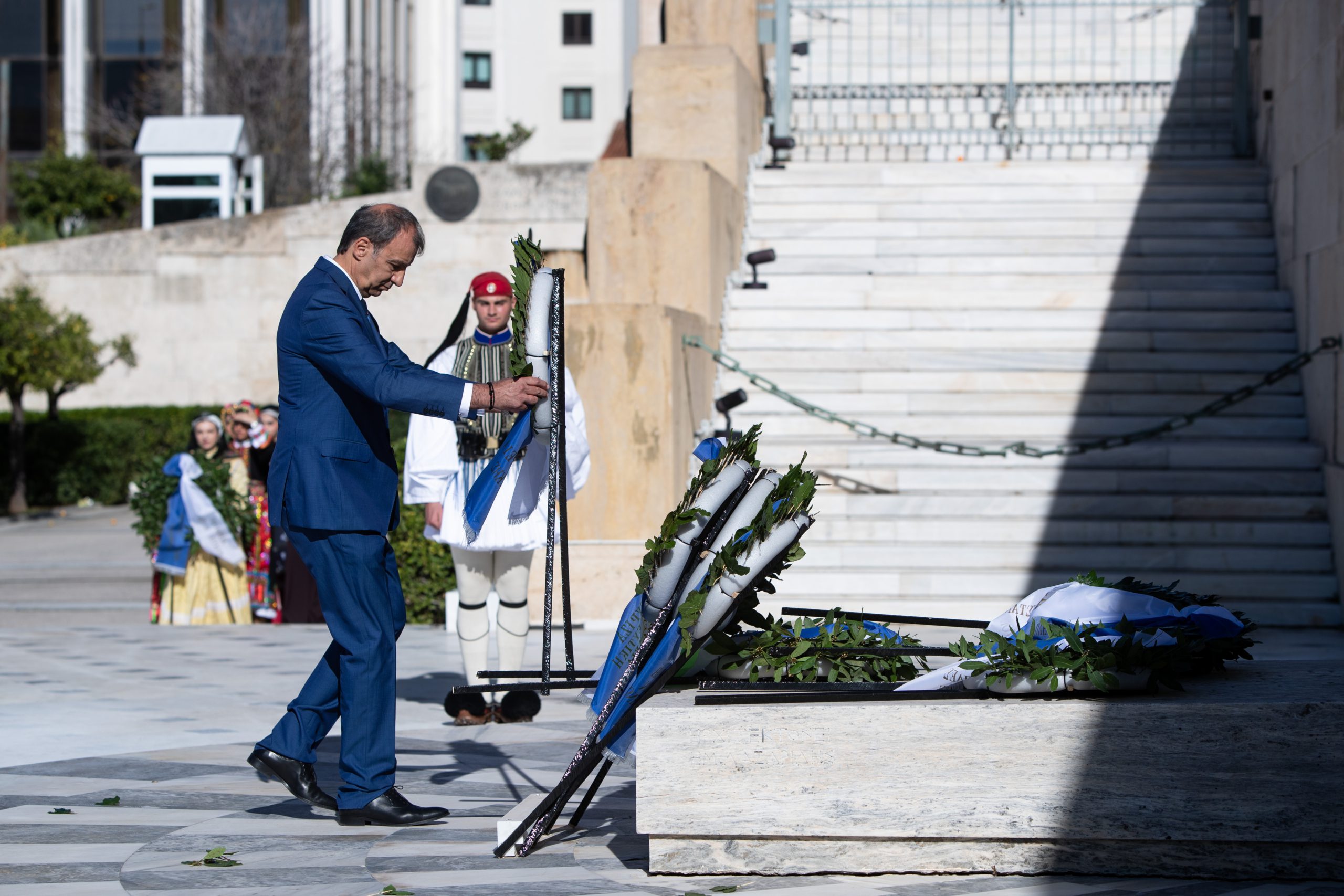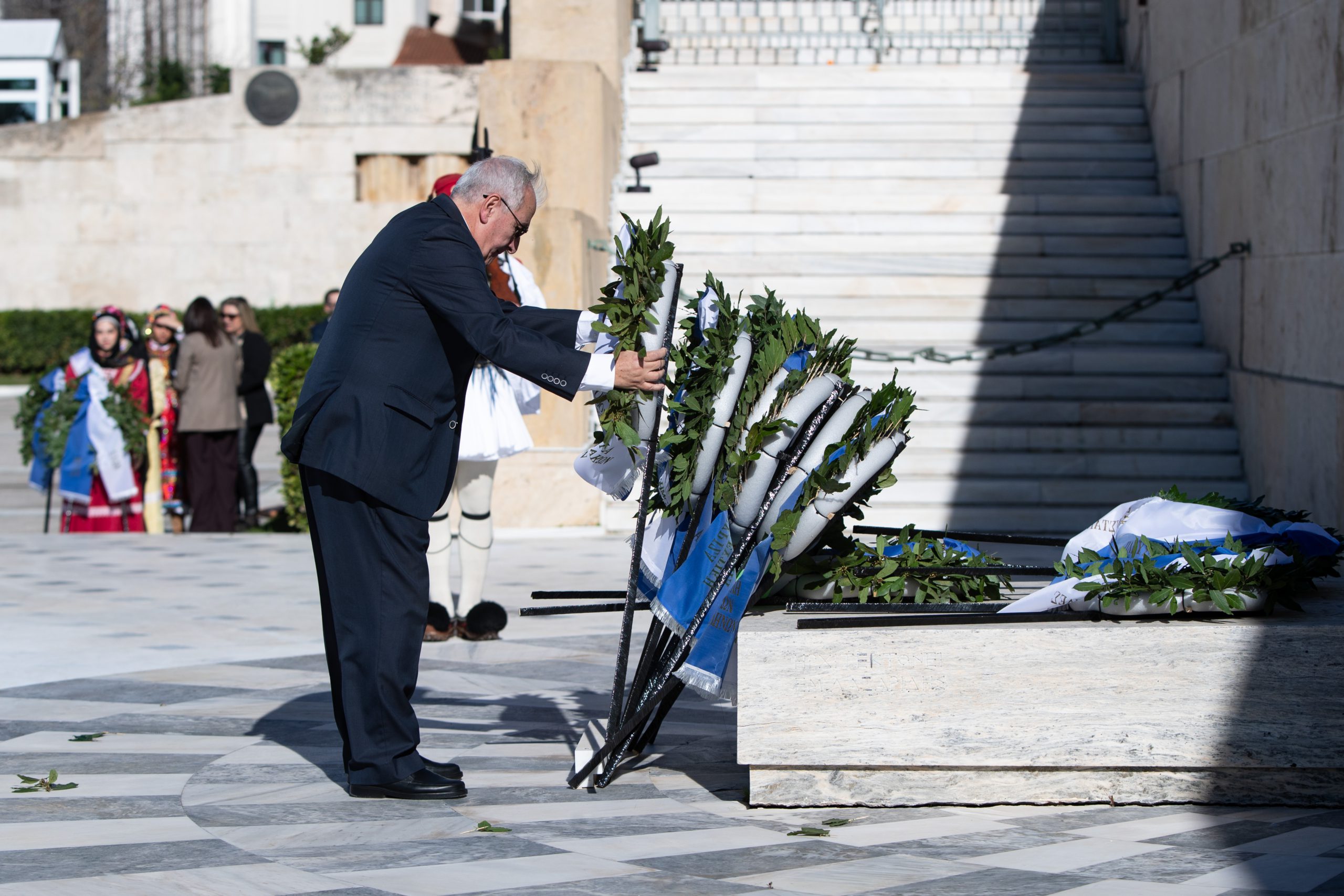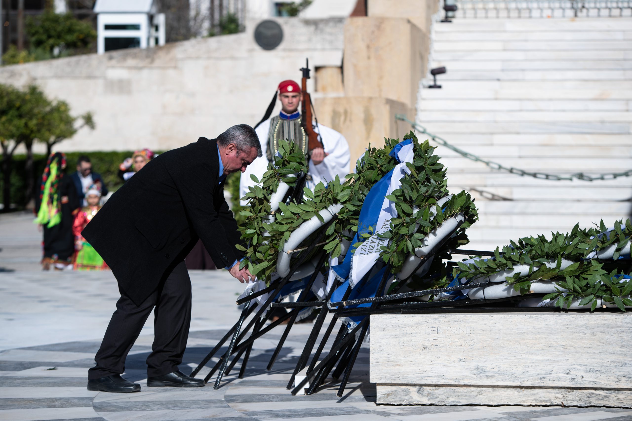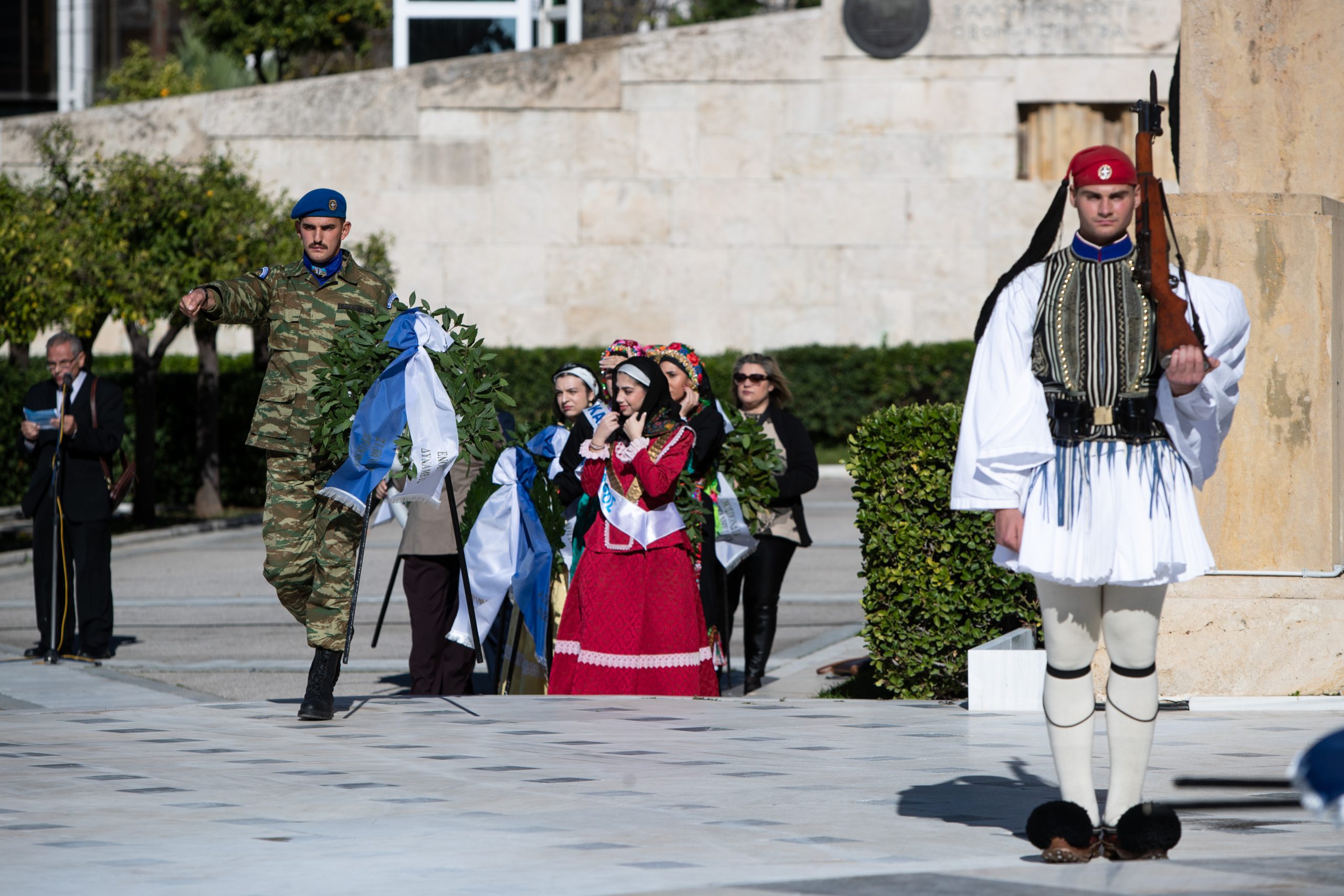 Στο Μνημείο του Αγνώστου Στρατιώτη στις 12:10 μ.μ. πραγματοποιήθηκε κατάθεση στεφάνων από την πολιτική ηγεσία, τις ένοπλες δυνάμεις, την τοπική αυτοδιοίκηση καθώς και δωδεκανησιακούς και καρπαθιακούς φορείς. Τελετάρχης ήταν ο Αντιπρόεδρος του Σ.Α.Κ. Ιωάννης Χριστοδουλάκης και συντονιστές τα μέλη του Σ.Α.Κ. Μιχαήλα Σπανομανωλή-Αμανεζή και Γρηγόρης Χατζηαντωνίου.