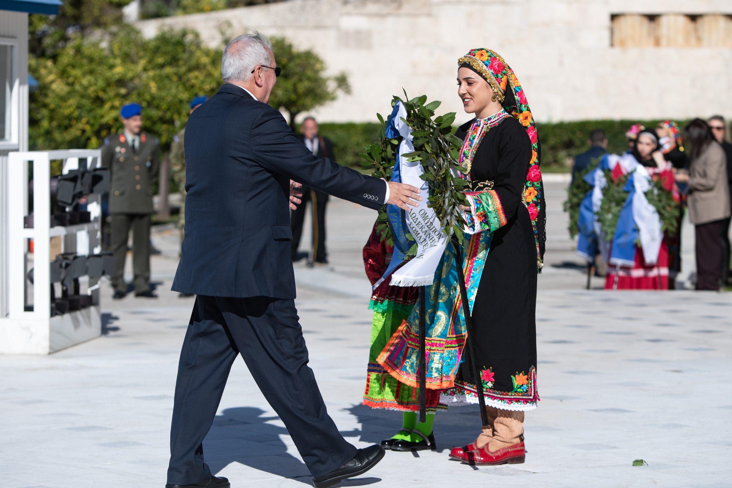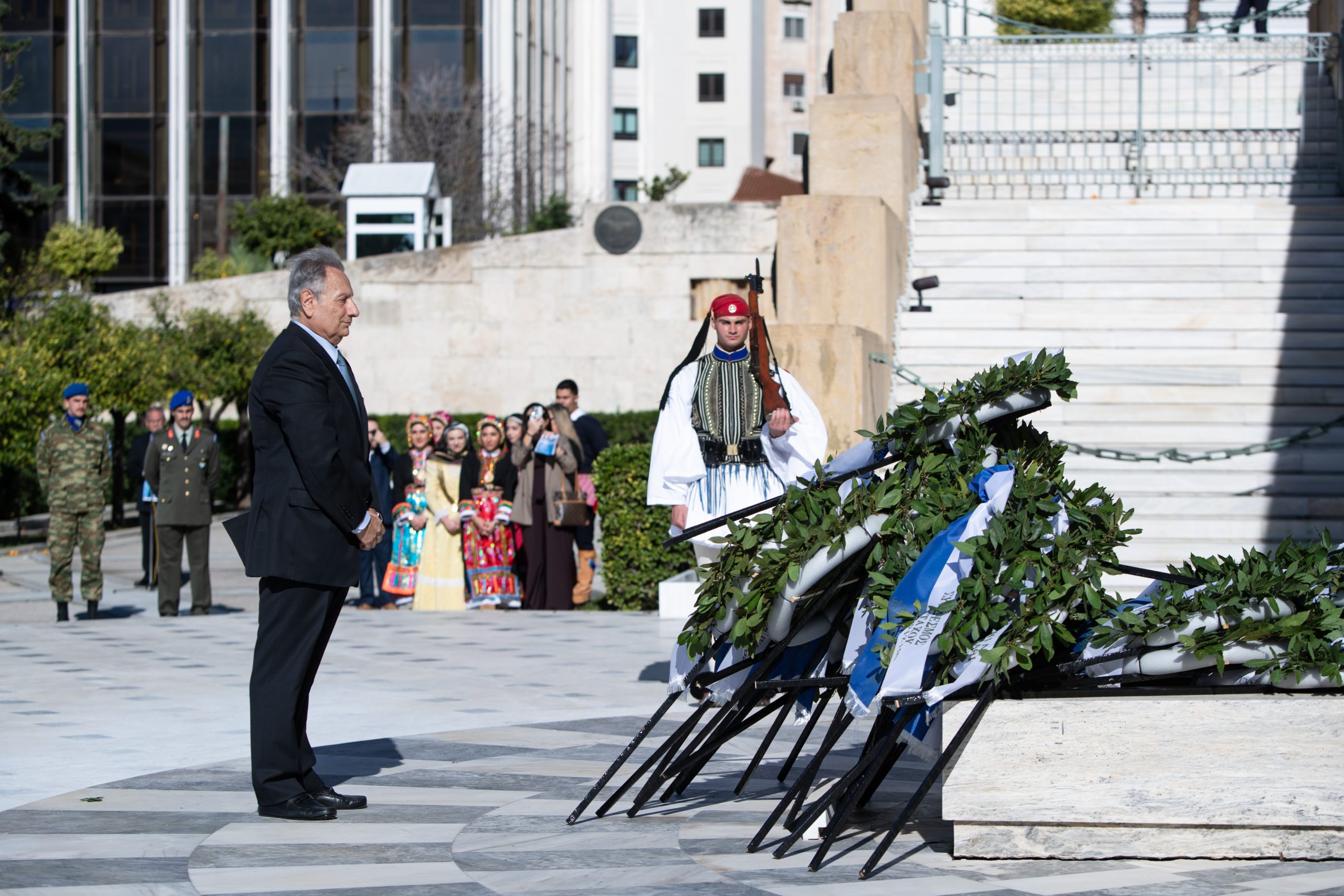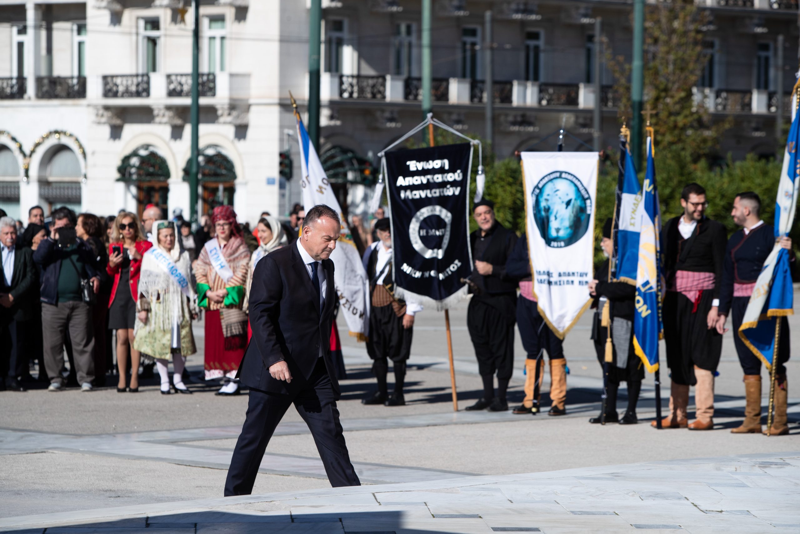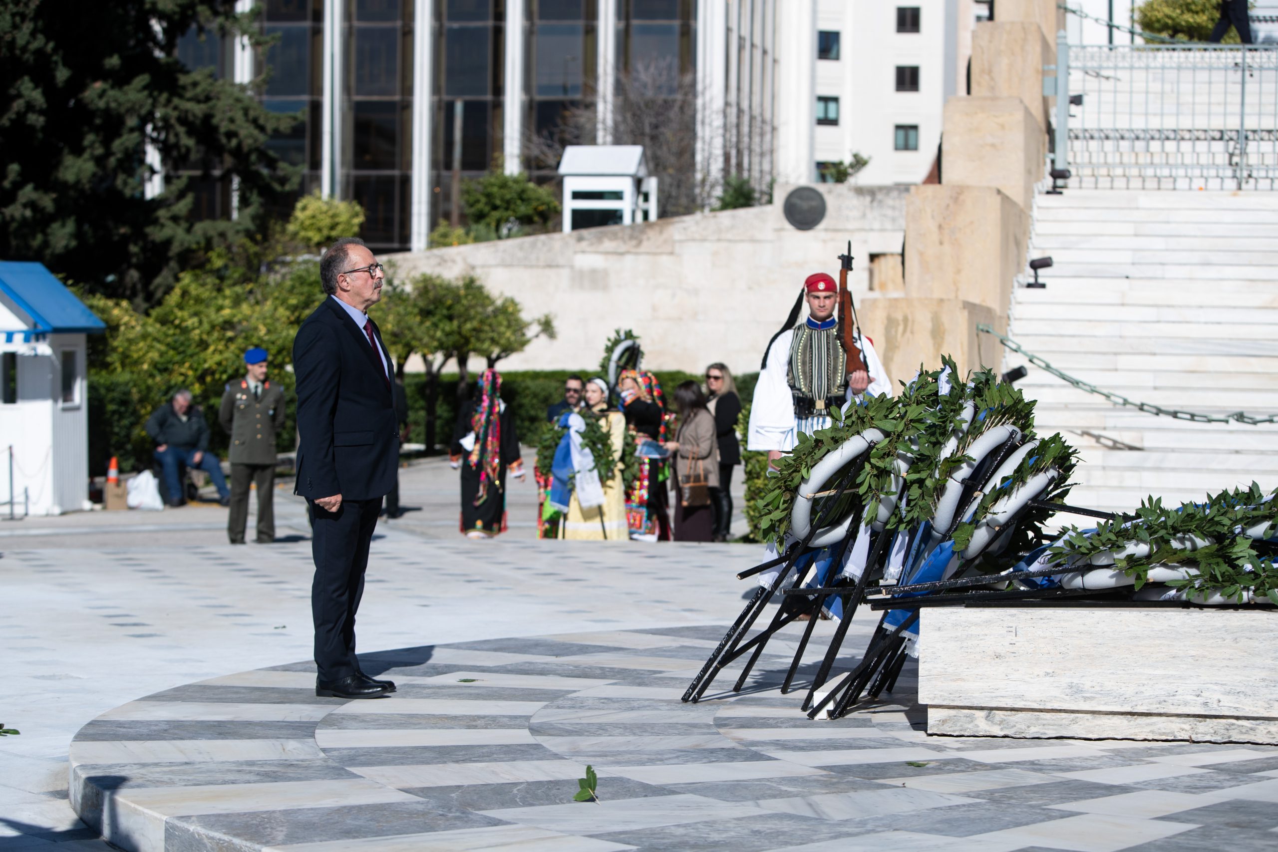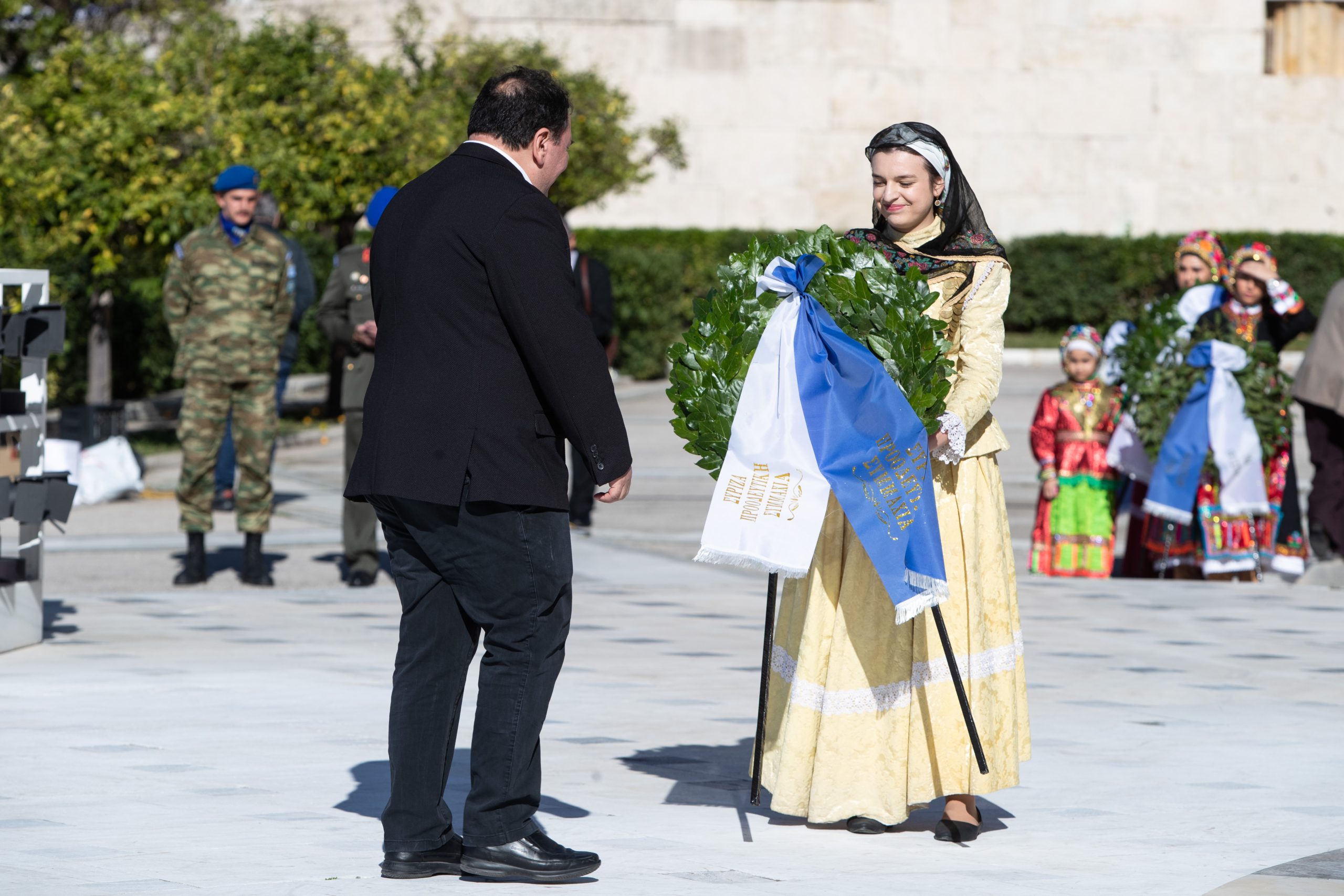 Στο Μνημείο του Αγνώστου Στρατιώτη στις 12:10 μ.μ. πραγματοποιήθηκε κατάθεση στεφάνων από την πολιτική ηγεσία, τις ένοπλες δυνάμεις, την τοπική αυτοδιοίκηση καθώς και δωδεκανησιακούς και καρπαθιακούς φορείς. Τελετάρχης ήταν ο Αντιπρόεδρος του Σ.Α.Κ. Ιωάννης Χριστοδουλάκης και συντονιστές τα μέλη του Σ.Α.Κ. Μιχαήλα Σπανομανωλή-Αμανεζή και Γρηγόρης Χατζηαντωνίου.