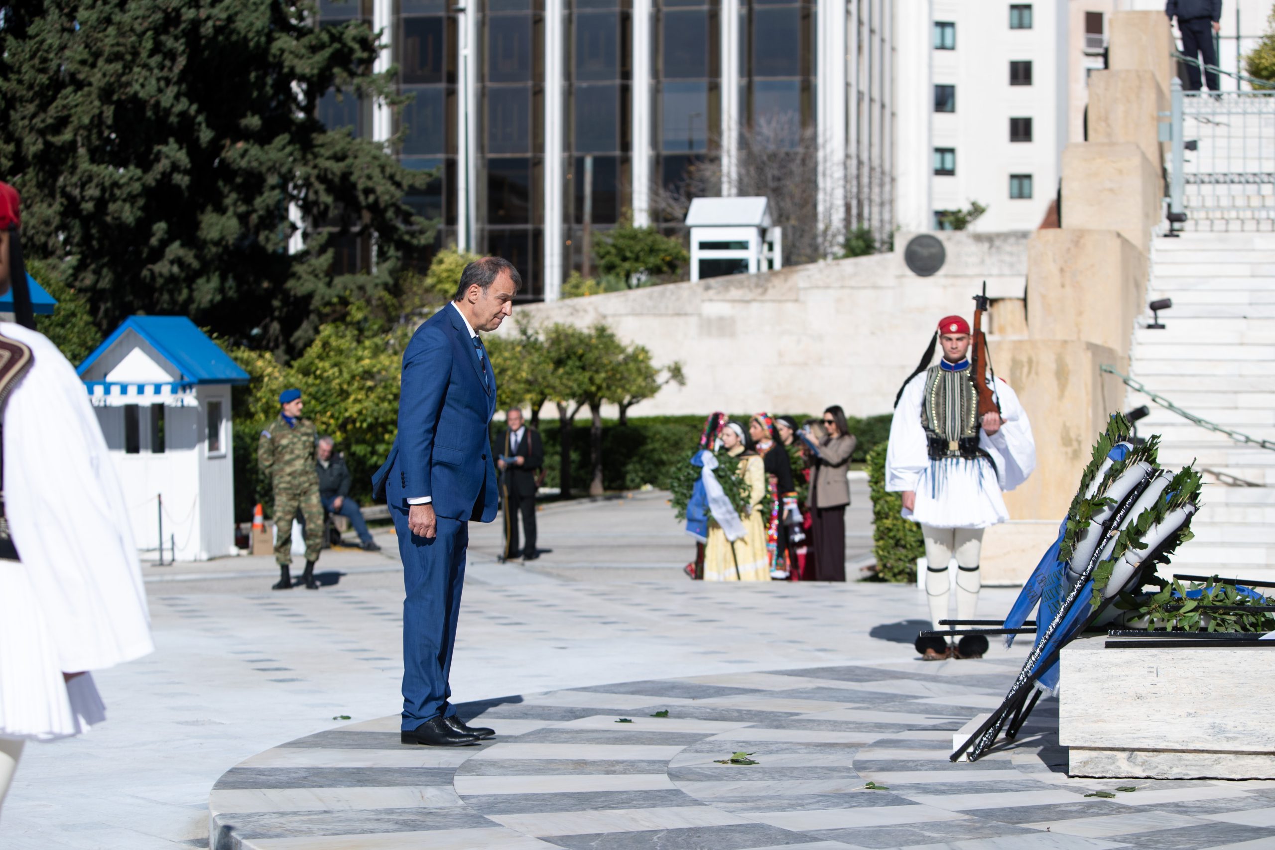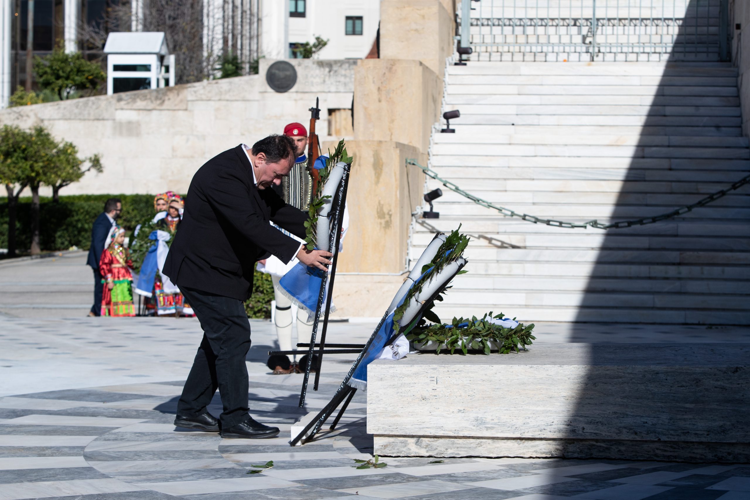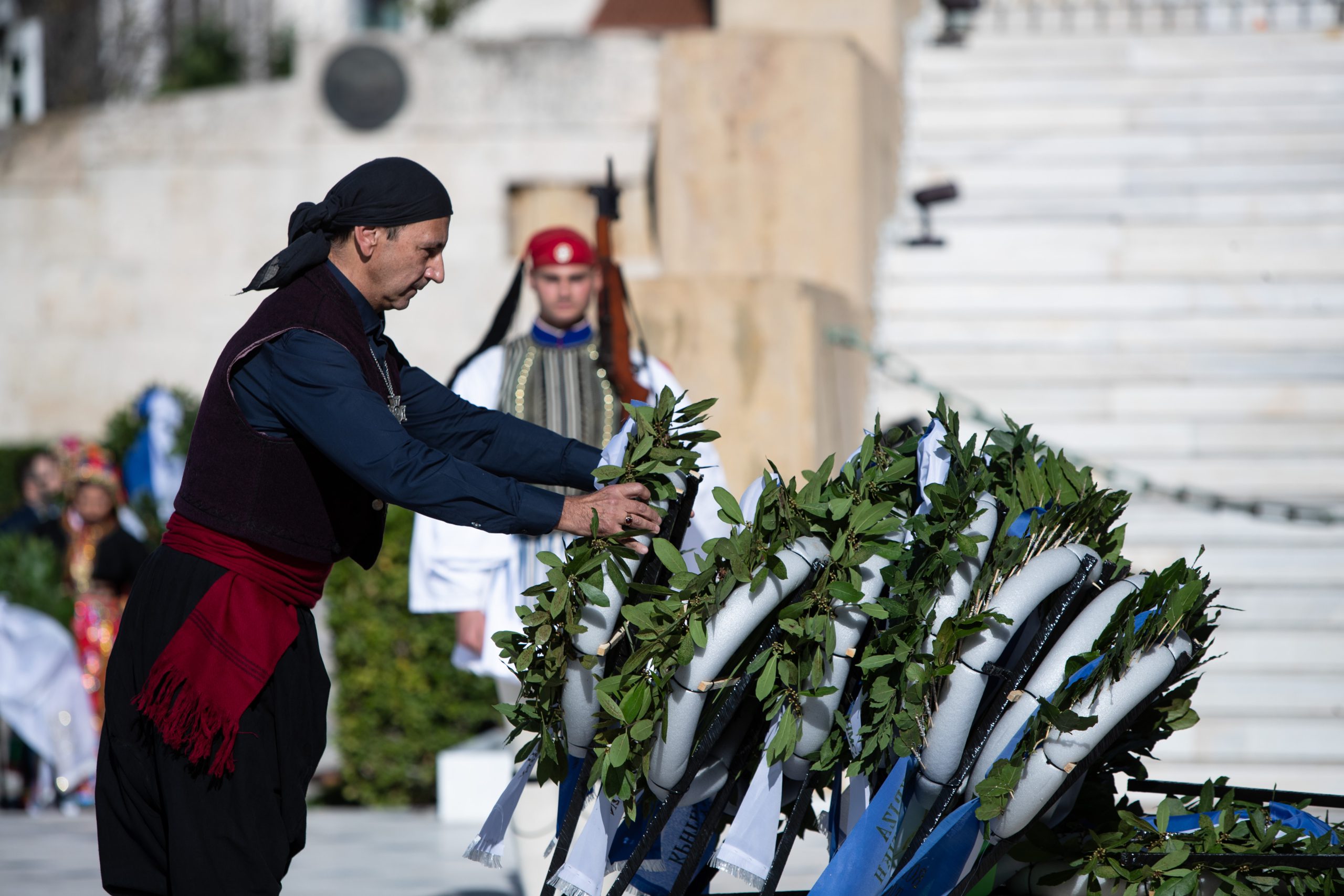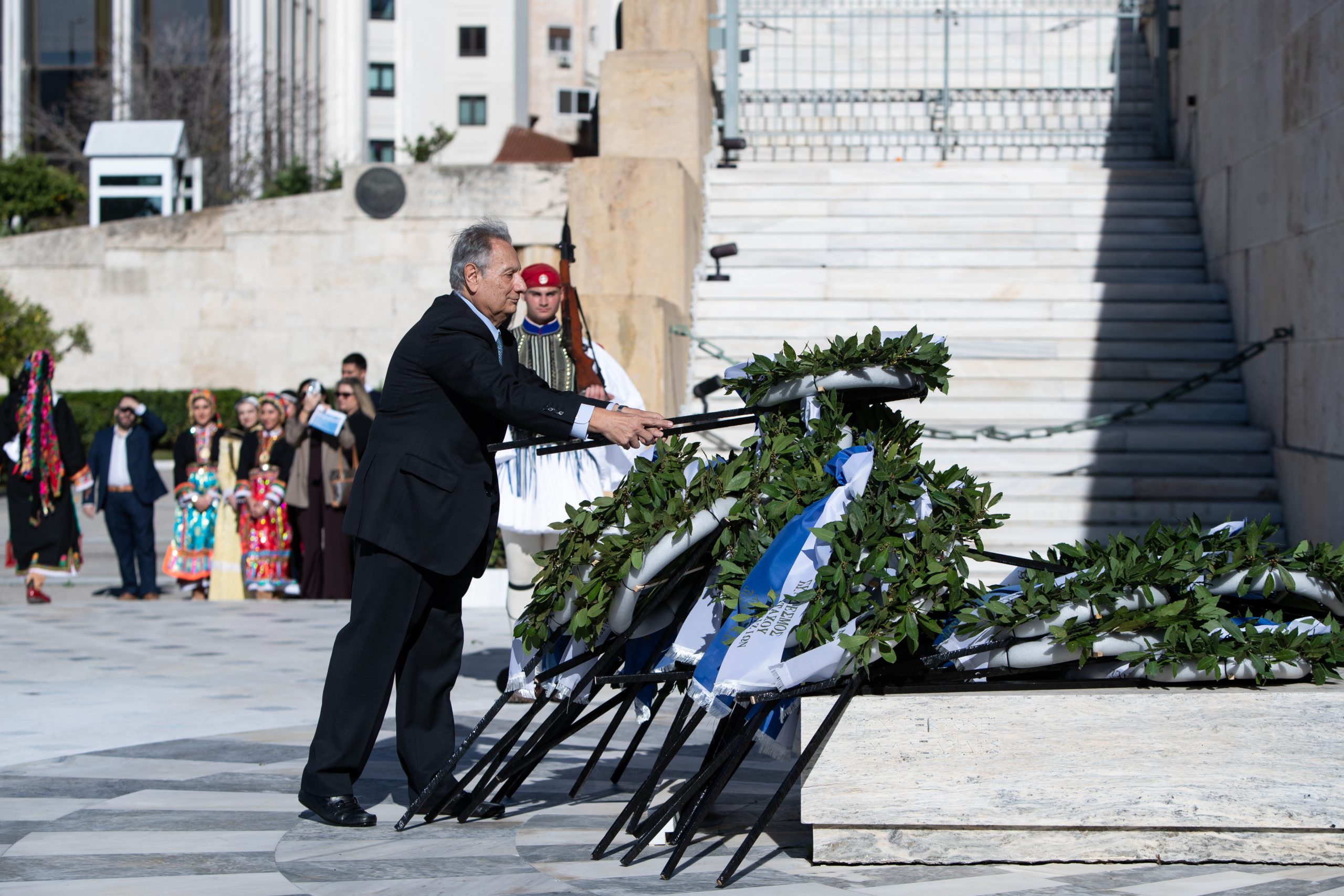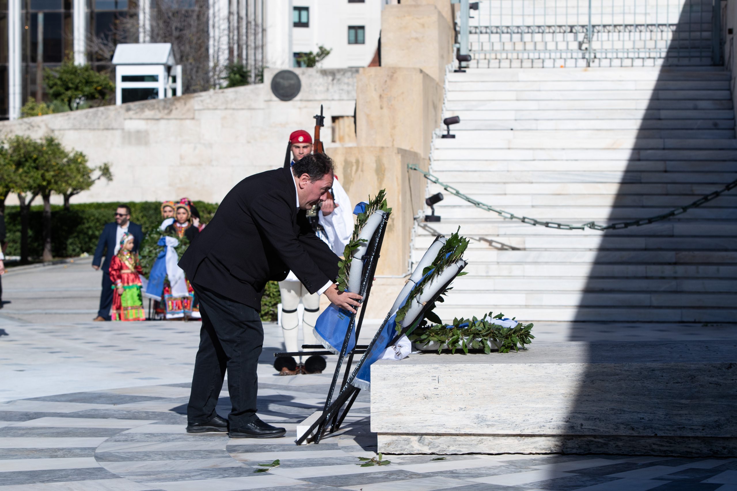 Στο Μνημείο του Αγνώστου Στρατιώτη στις 12:10 μ.μ. πραγματοποιήθηκε κατάθεση στεφάνων από την πολιτική ηγεσία, τις ένοπλες δυνάμεις, την τοπική αυτοδιοίκηση καθώς και δωδεκανησιακούς και καρπαθιακούς φορείς. Τελετάρχης ήταν ο Αντιπρόεδρος του Σ.Α.Κ. Ιωάννης Χριστοδουλάκης και συντονιστές τα μέλη του Σ.Α.Κ. Μιχαήλα Σπανομανωλή-Αμανεζή και Γρηγόρης Χατζηαντωνίου.