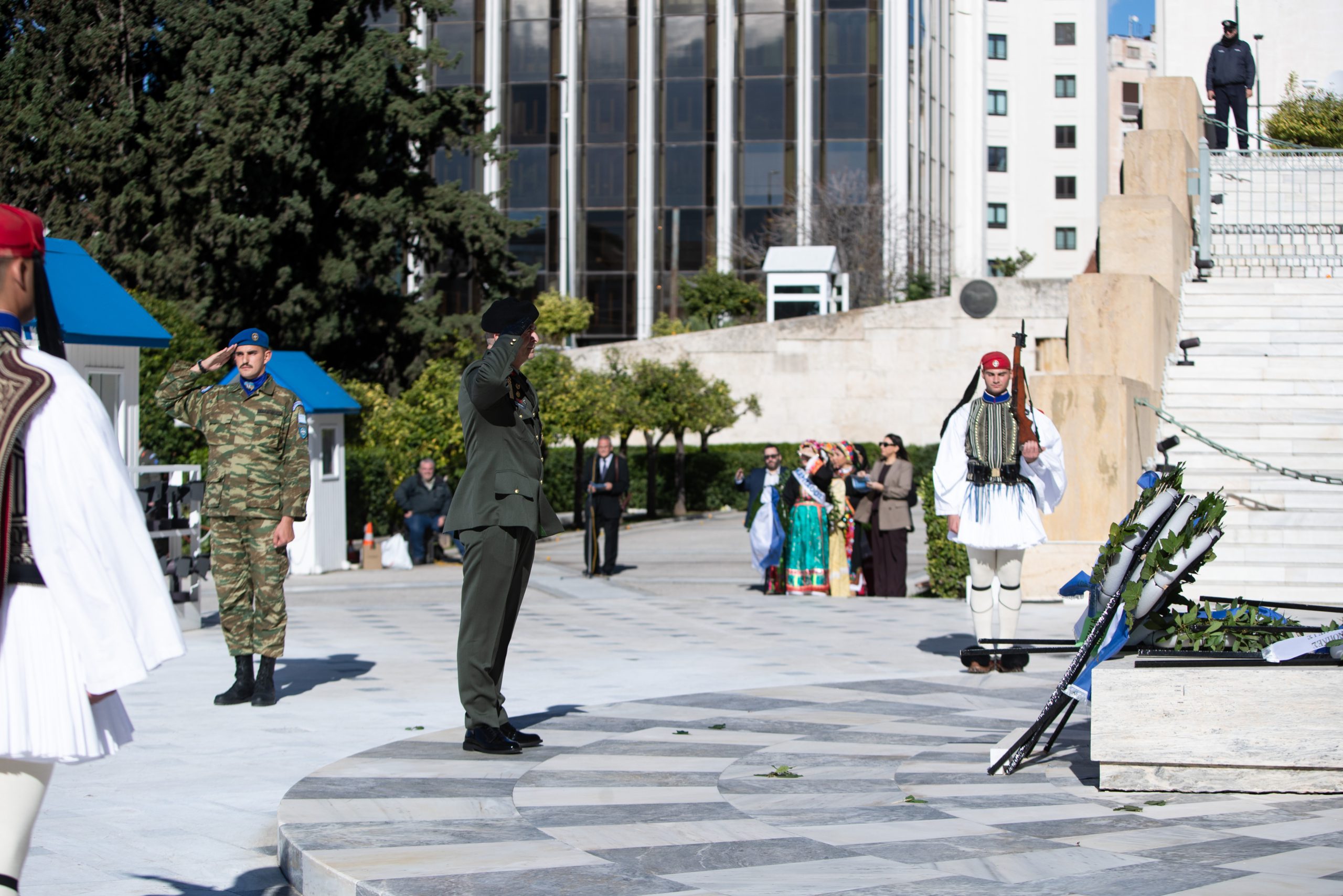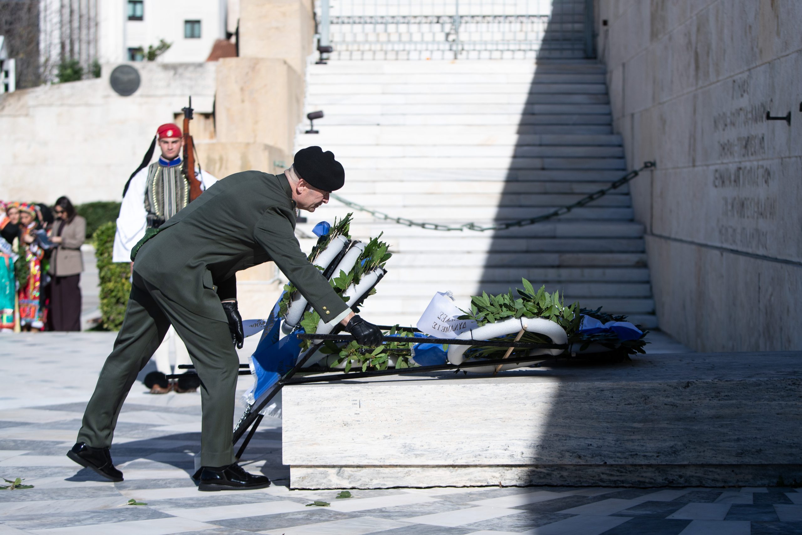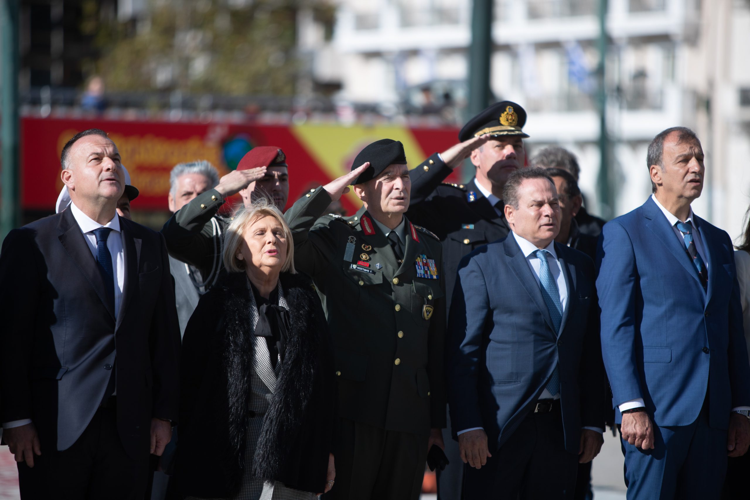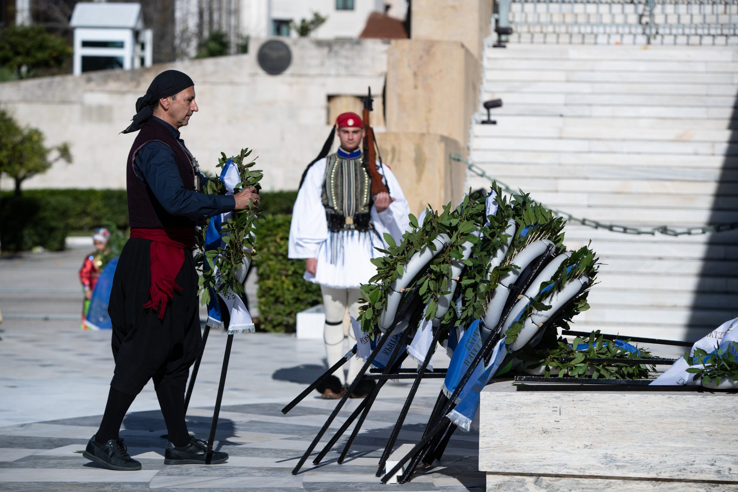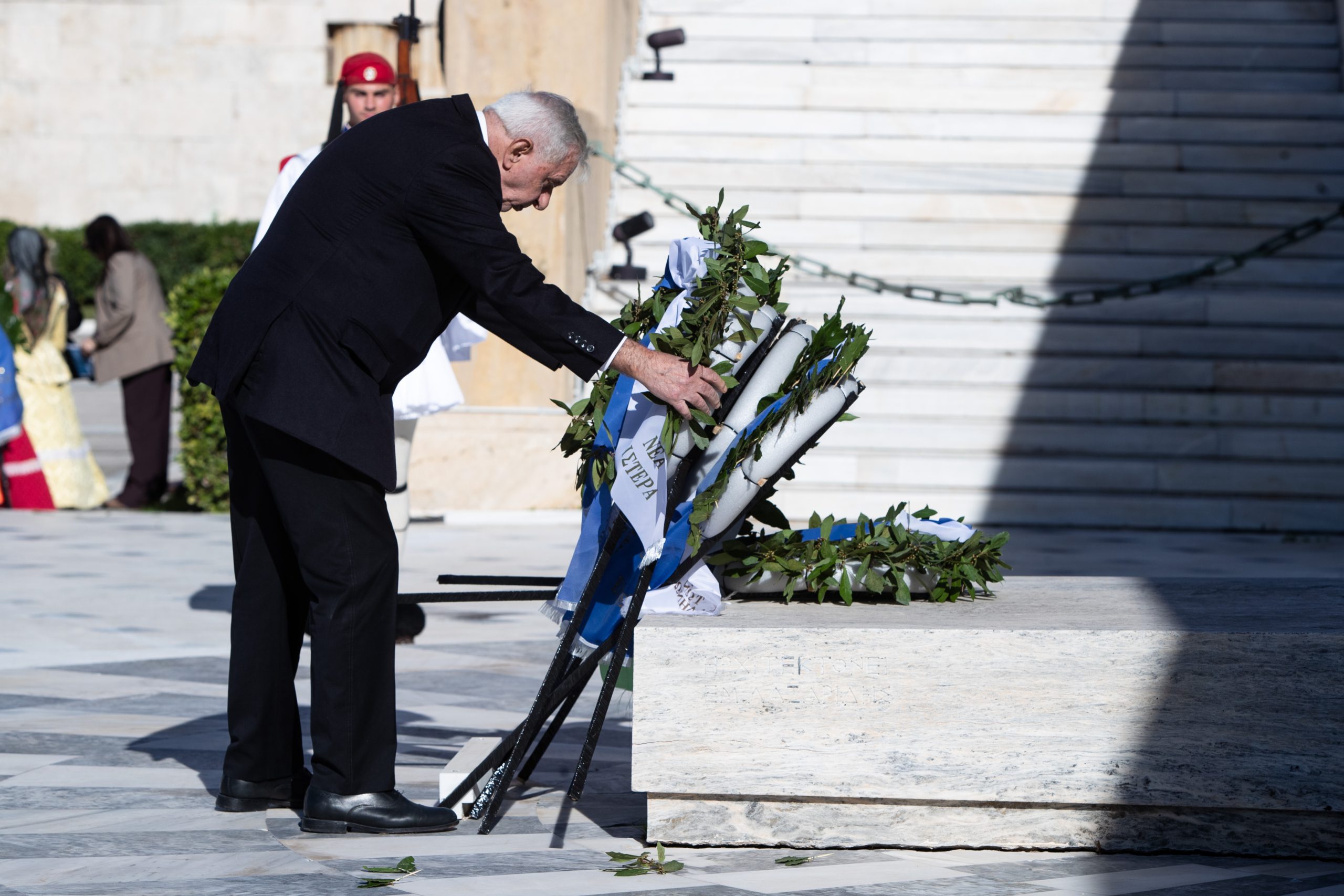 Στο Μνημείο του Αγνώστου Στρατιώτη στις 12:10 μ.μ. πραγματοποιήθηκε κατάθεση στεφάνων από την πολιτική ηγεσία, τις ένοπλες δυνάμεις, την τοπική αυτοδιοίκηση καθώς και δωδεκανησιακούς και καρπαθιακούς φορείς. Τελετάρχης ήταν ο Αντιπρόεδρος του Σ.Α.Κ. Ιωάννης Χριστοδουλάκης και συντονιστές τα μέλη του Σ.Α.Κ. Μιχαήλα Σπανομανωλή-Αμανεζή και Γρηγόρης Χατζηαντωνίου.