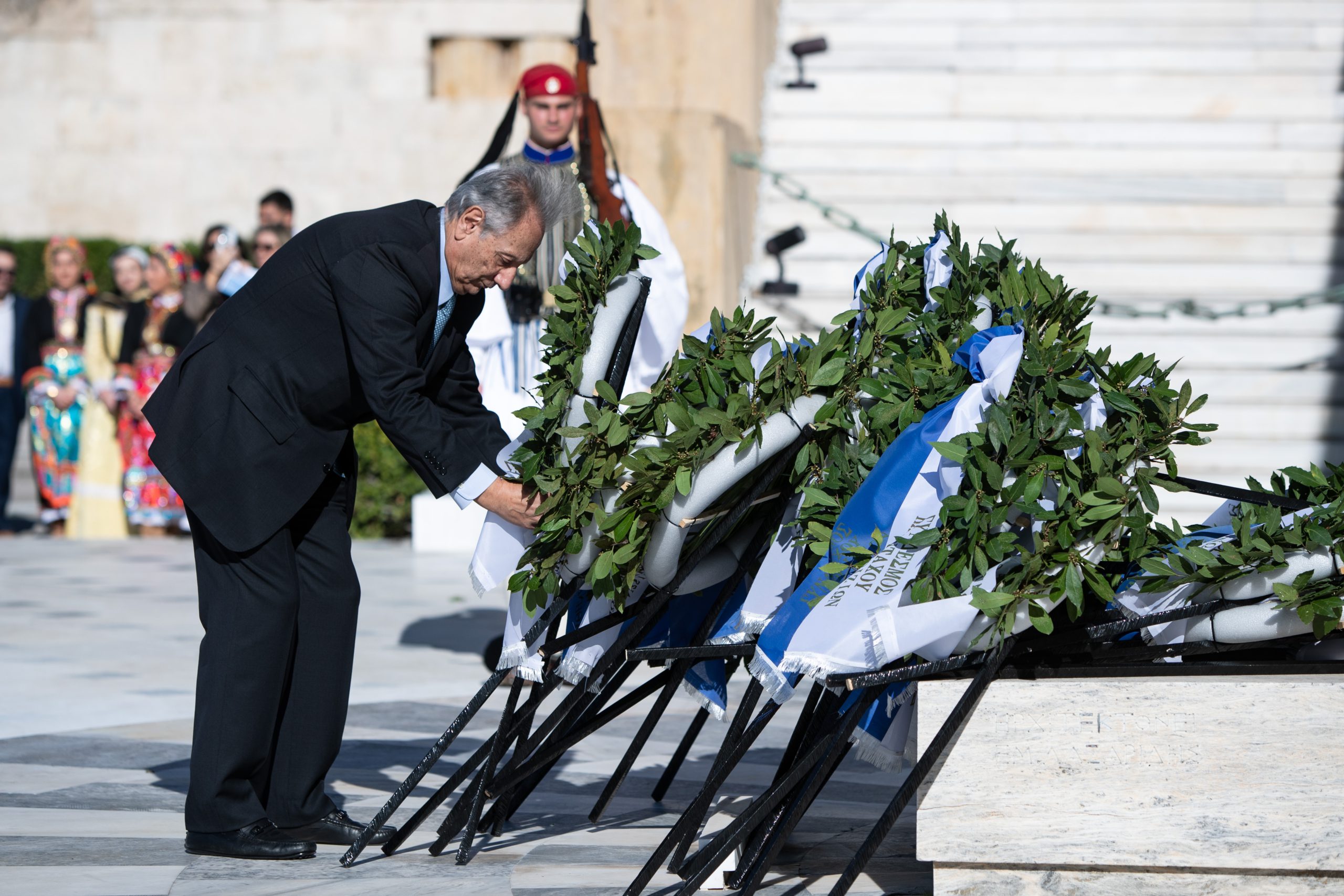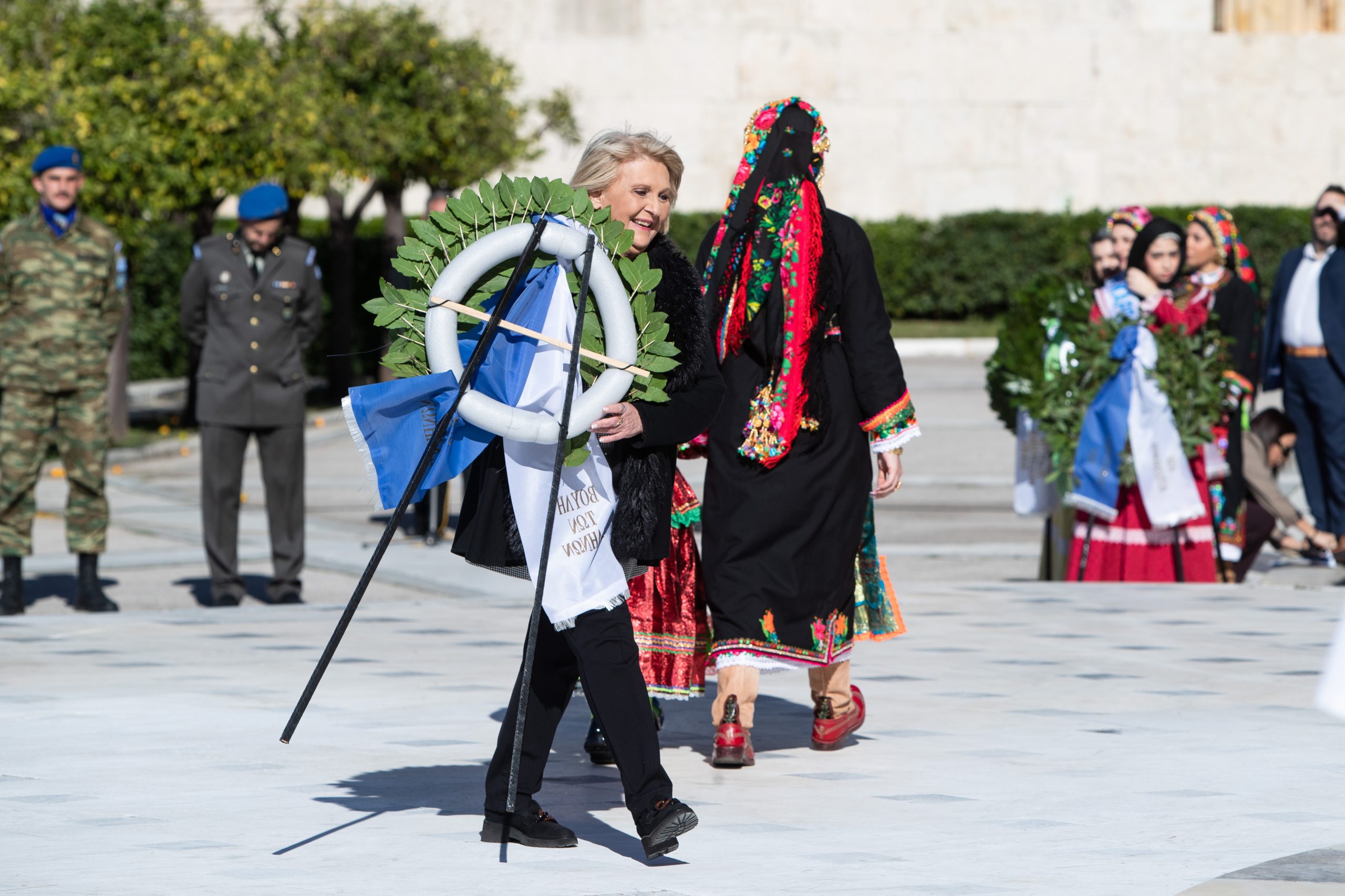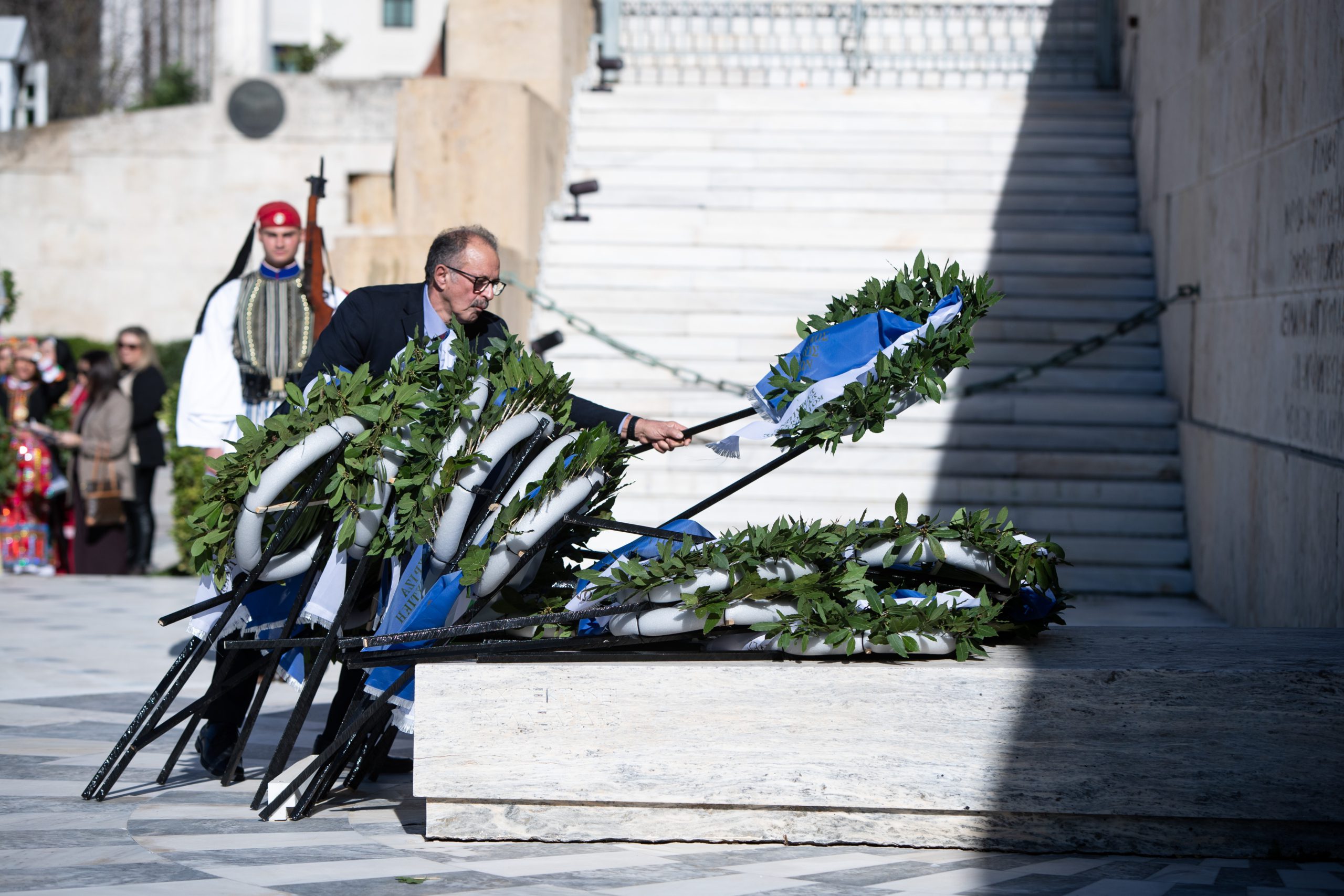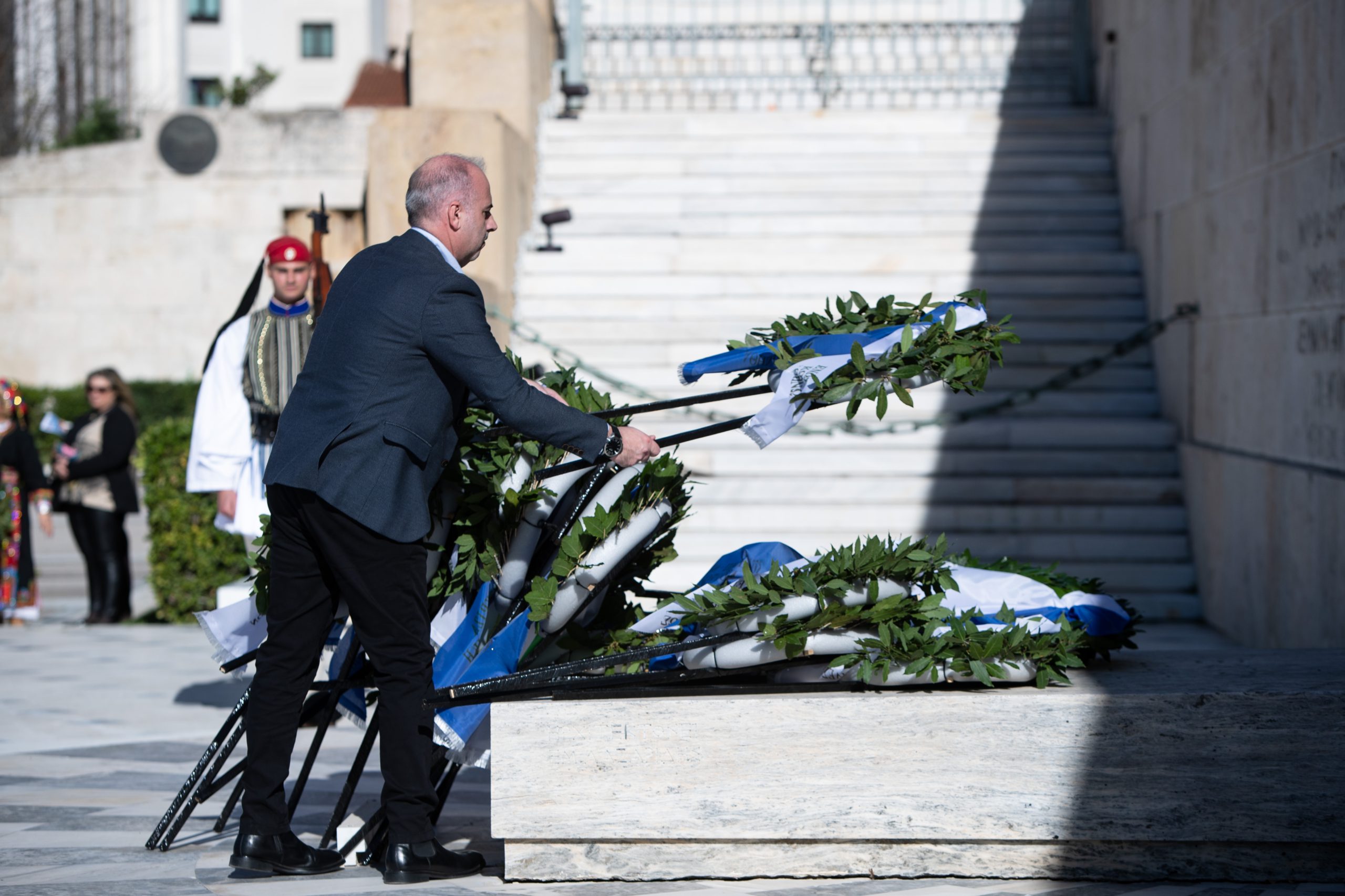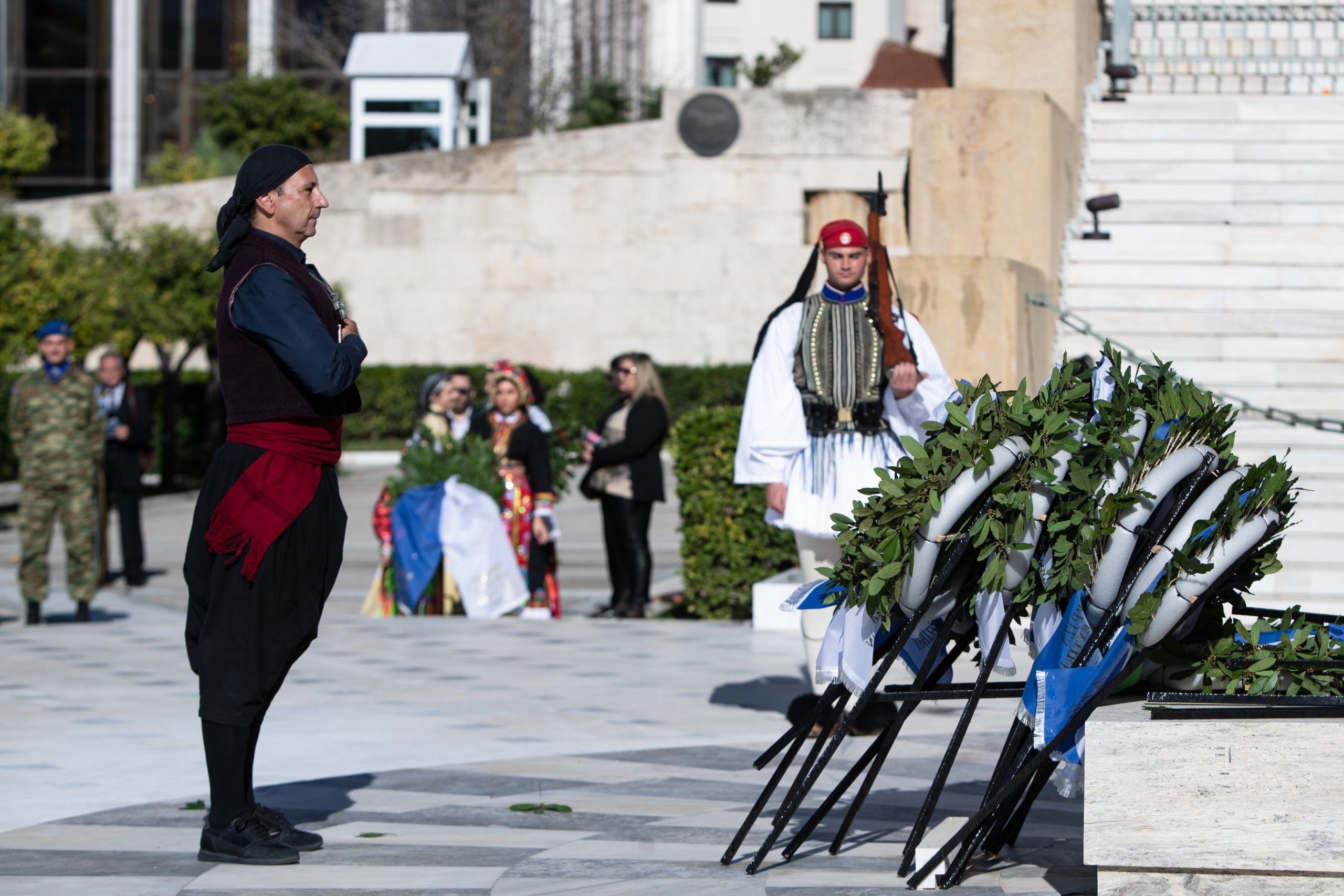Στο Μνημείο του Αγνώστου Στρατιώτη στις 12:10 μ.μ. πραγματοποιήθηκε κατάθεση στεφάνων από την πολιτική ηγεσία, τις ένοπλες δυνάμεις, την τοπική αυτοδιοίκηση καθώς και δωδεκανησιακούς και καρπαθιακούς φορείς. Τελετάρχης ήταν ο Αντιπρόεδρος του Σ.Α.Κ. Ιωάννης Χριστοδουλάκης και συντονιστές τα μέλη του Σ.Α.Κ. Μιχαήλα Σπανομανωλή-Αμανεζή και Γρηγόρης Χατζηαντωνίου.