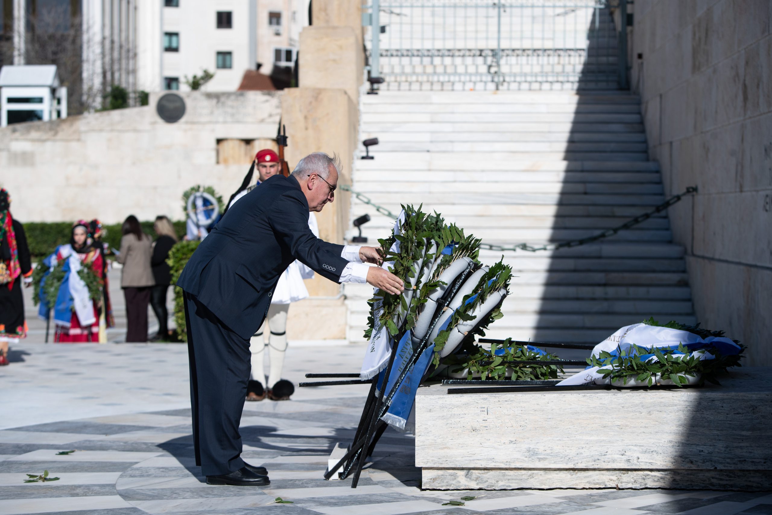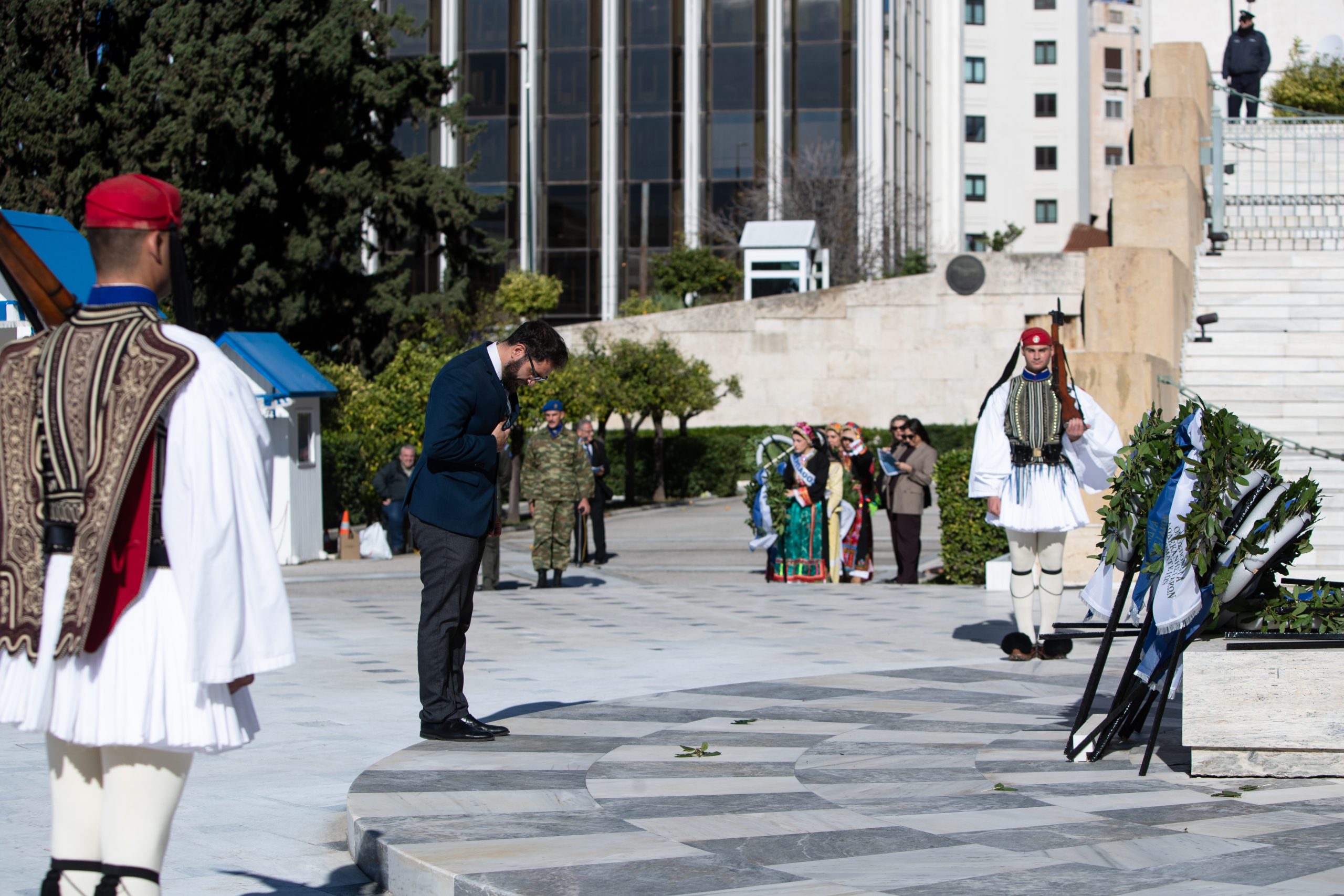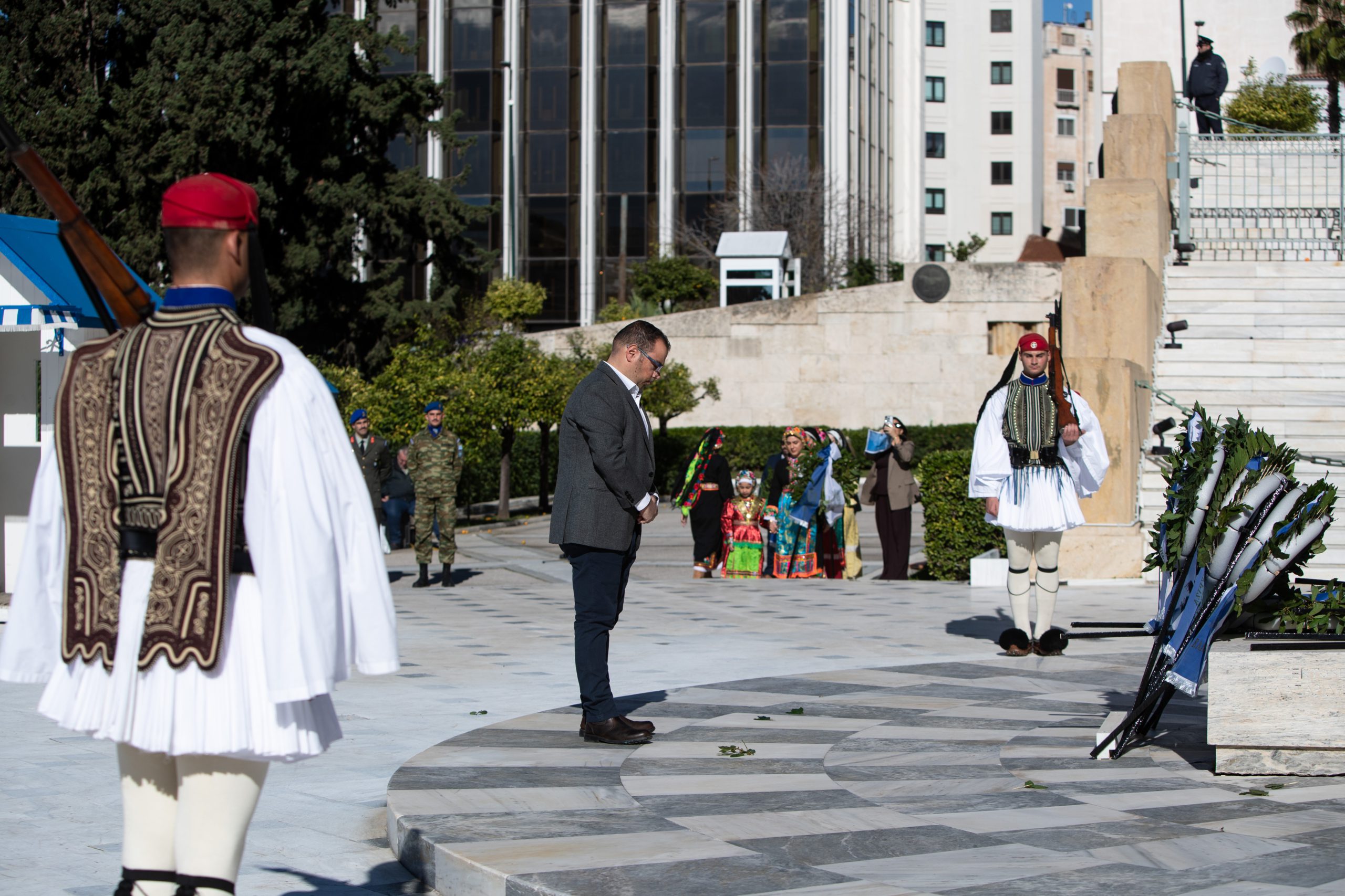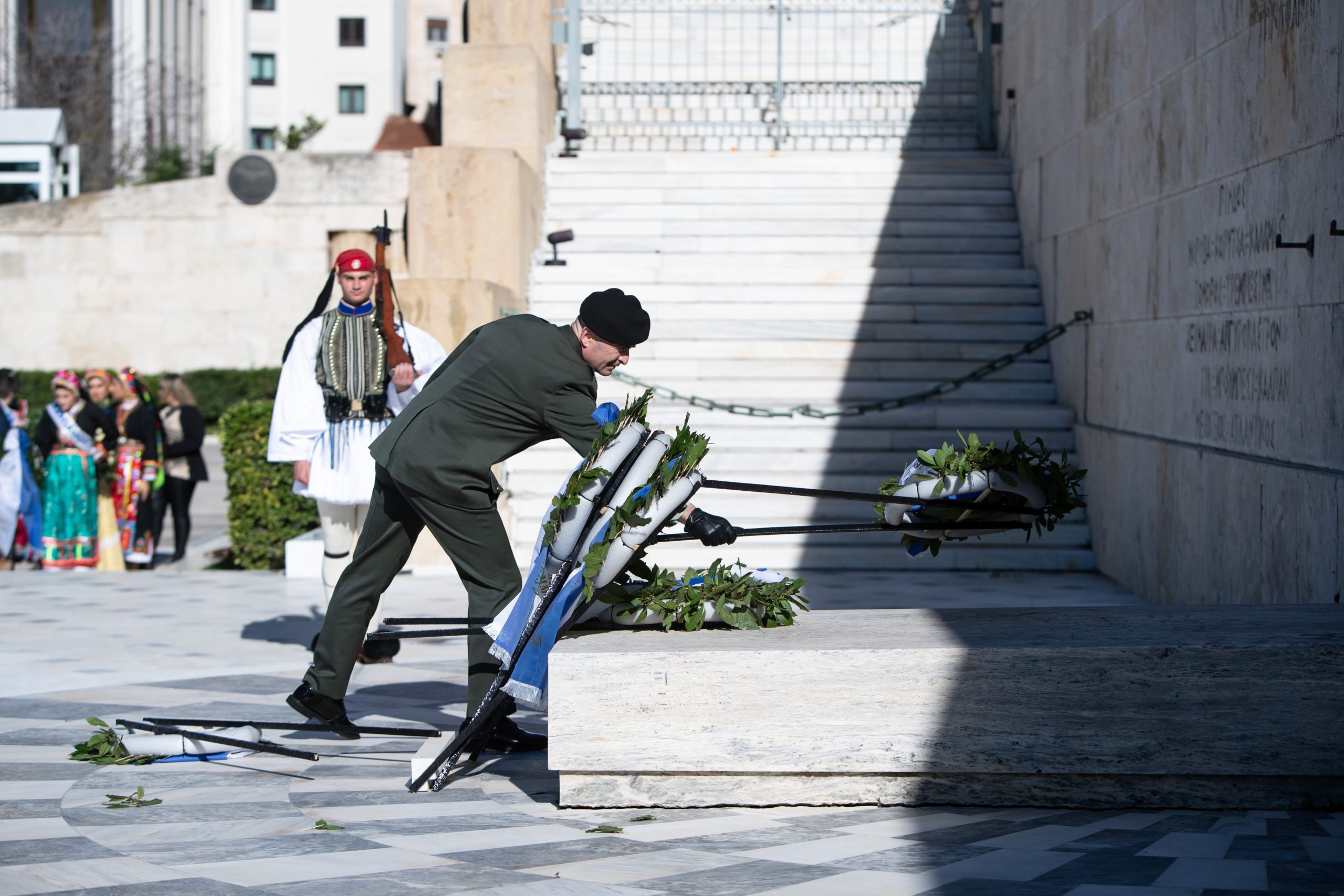 Στο Μνημείο του Αγνώστου Στρατιώτη στις 12:10 μ.μ. πραγματοποιήθηκε κατάθεση στεφάνων από την πολιτική ηγεσία, τις ένοπλες δυνάμεις, την τοπική αυτοδιοίκηση καθώς και δωδεκανησιακούς και καρπαθιακούς φορείς. Τελετάρχης ήταν ο Αντιπρόεδρος του Σ.Α.Κ. Ιωάννης Χριστοδουλάκης και συντονιστές τα μέλη του Σ.Α.Κ. Μιχαήλα Σπανομανωλή-Αμανεζή και Γρηγόρης Χατζηαντωνίου.