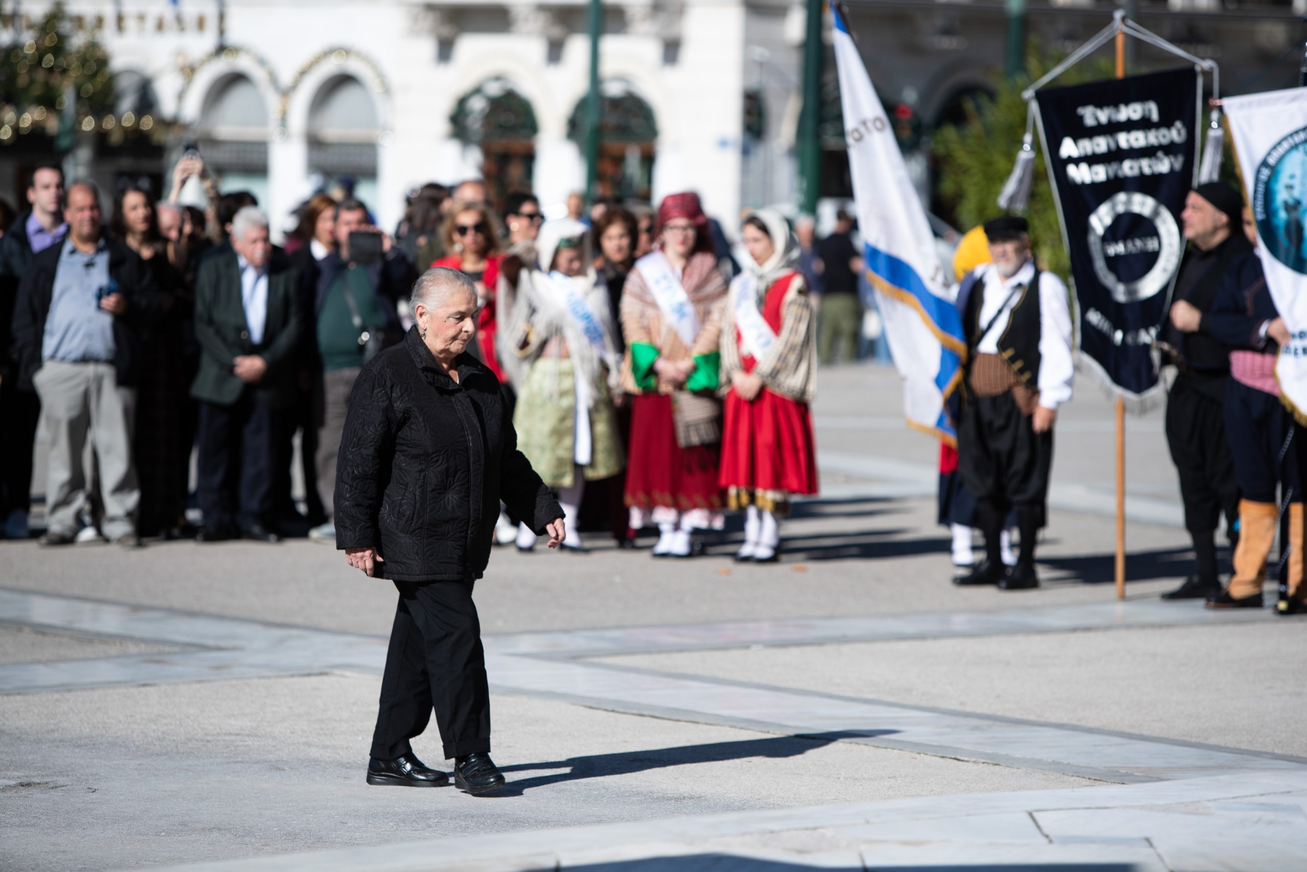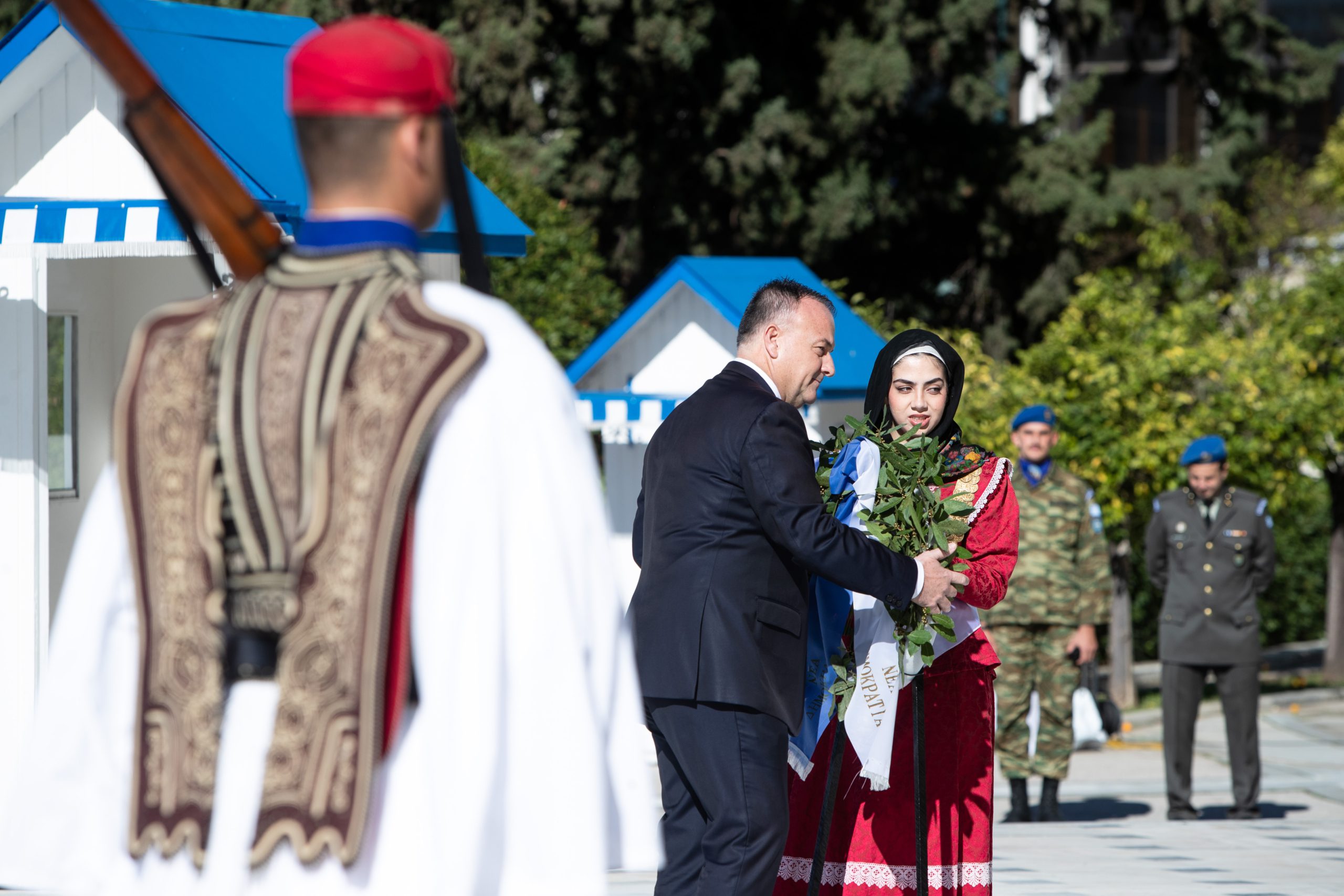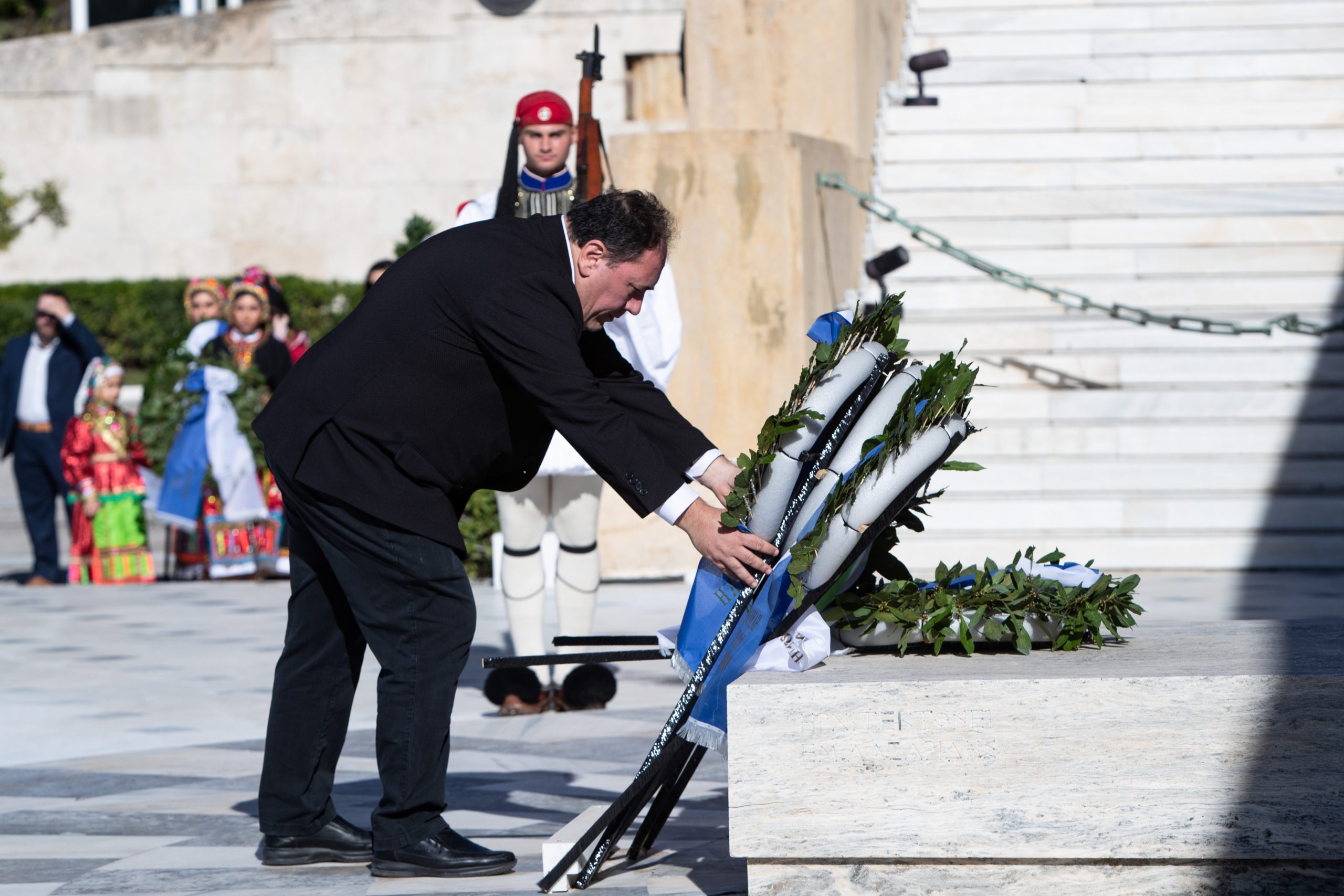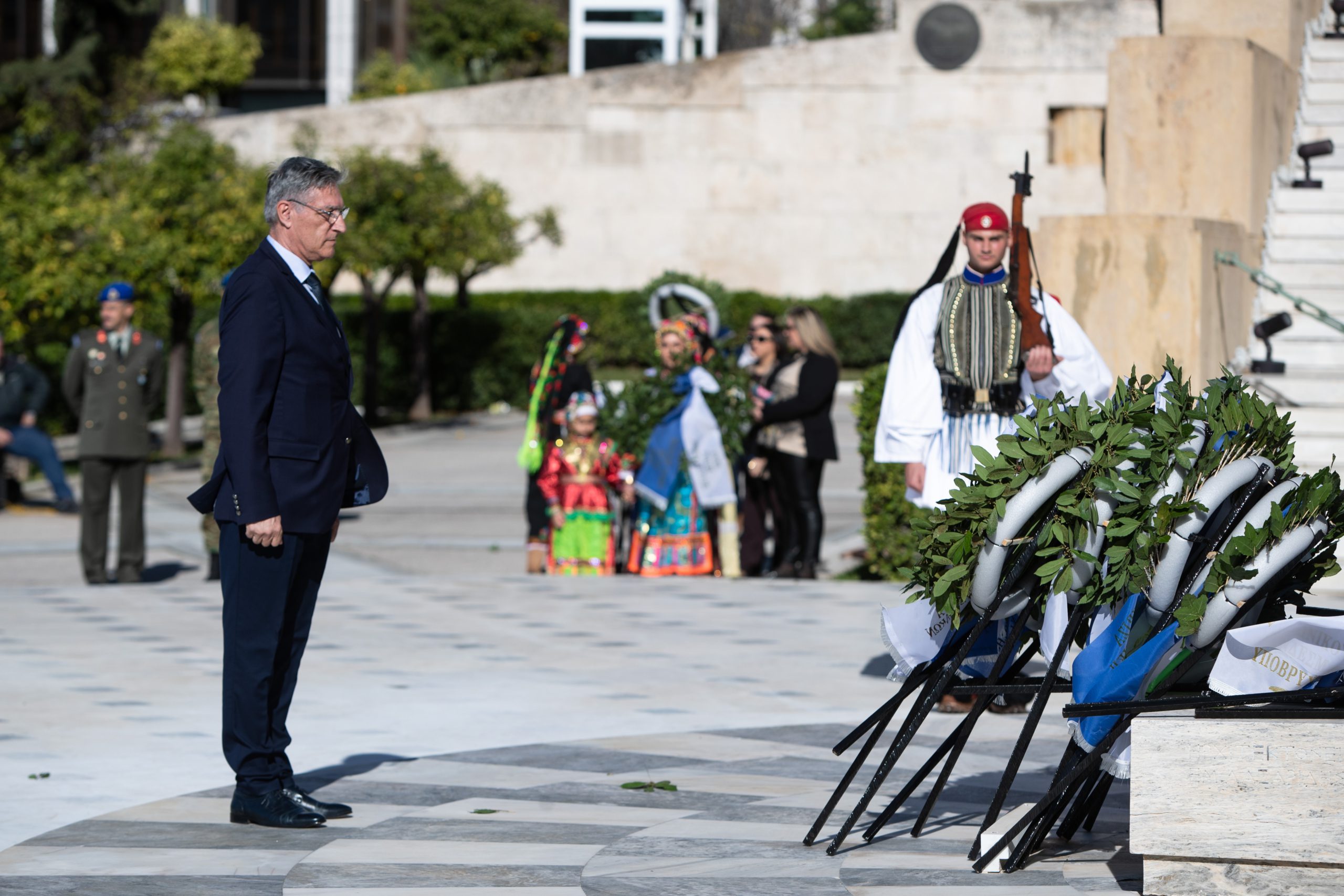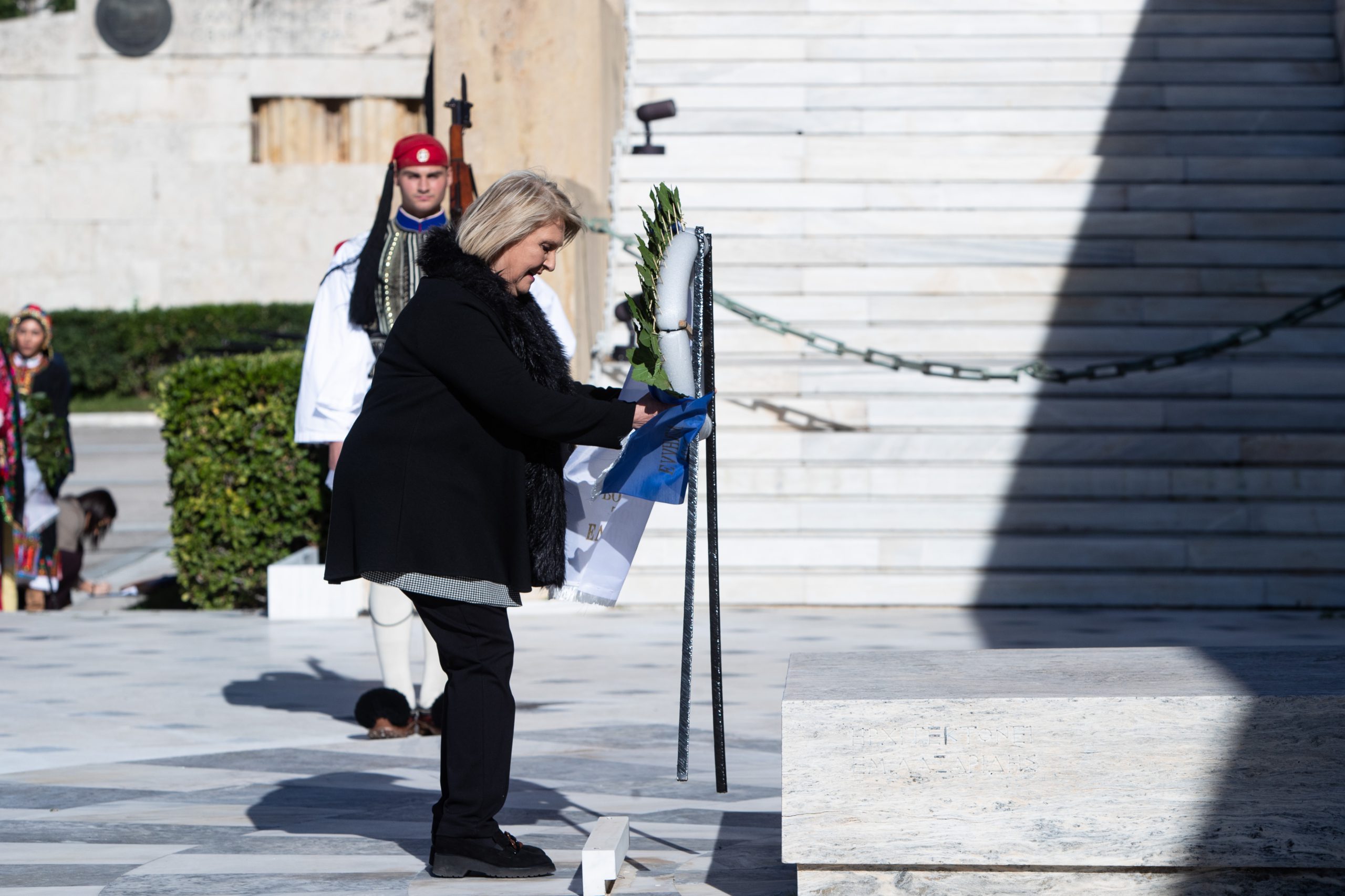 Στο Μνημείο του Αγνώστου Στρατιώτη στις 12:10 μ.μ. πραγματοποιήθηκε κατάθεση στεφάνων από την πολιτική ηγεσία, τις ένοπλες δυνάμεις, την τοπική αυτοδιοίκηση καθώς και δωδεκανησιακούς και καρπαθιακούς φορείς. Τελετάρχης ήταν ο Αντιπρόεδρος του Σ.Α.Κ. Ιωάννης Χριστοδουλάκης και συντονιστές τα μέλη του Σ.Α.Κ. Μιχαήλα Σπανομανωλή-Αμανεζή και Γρηγόρης Χατζηαντωνίου.