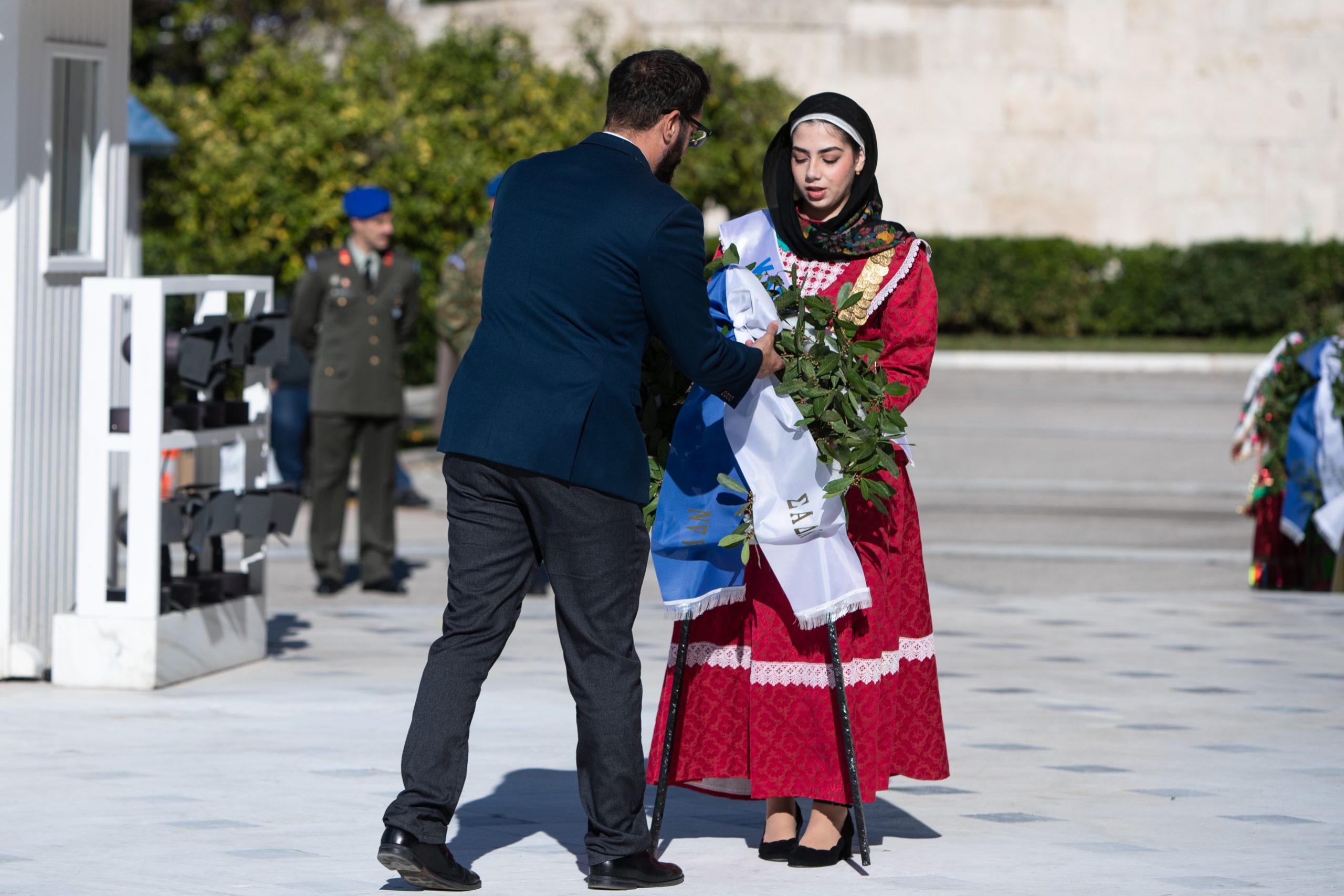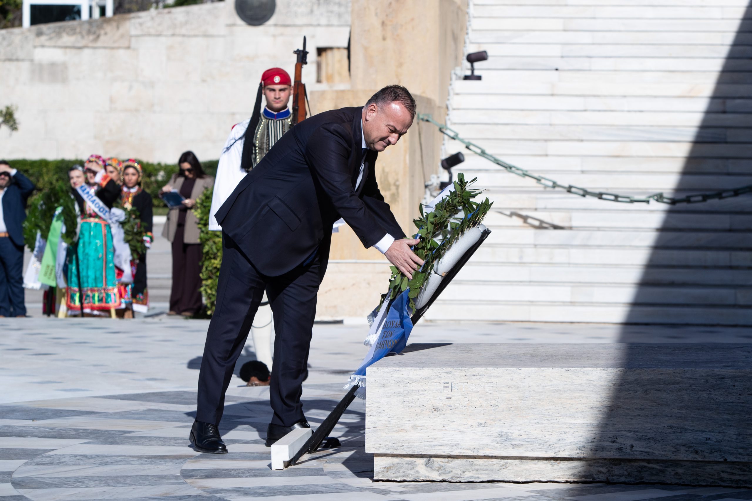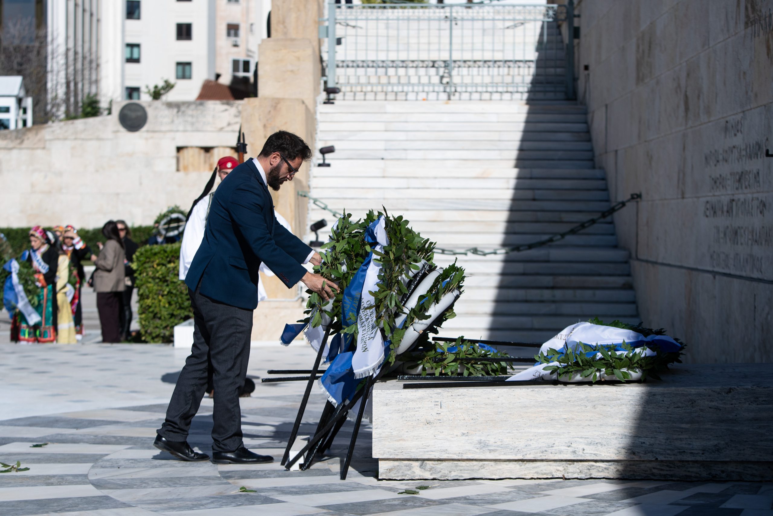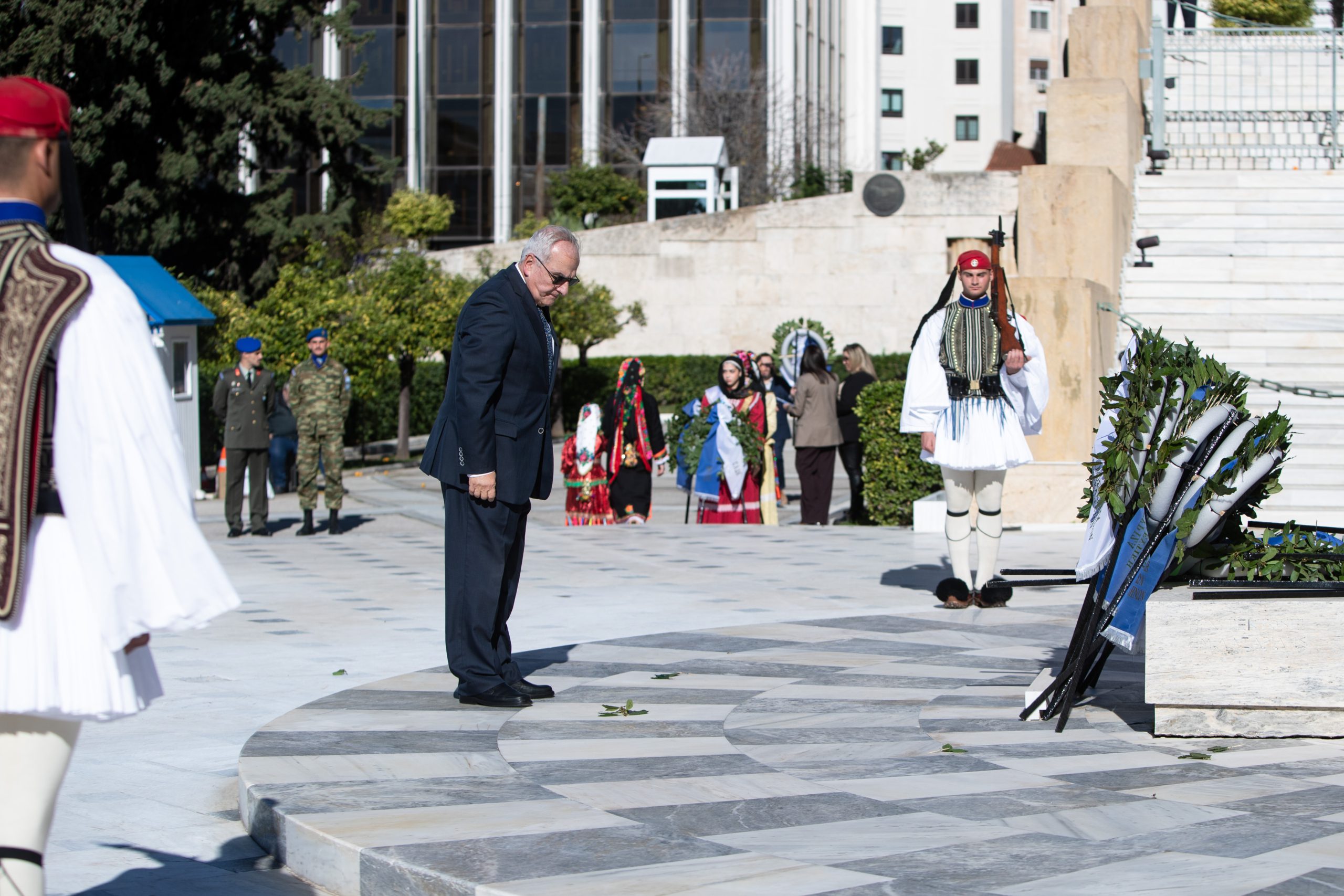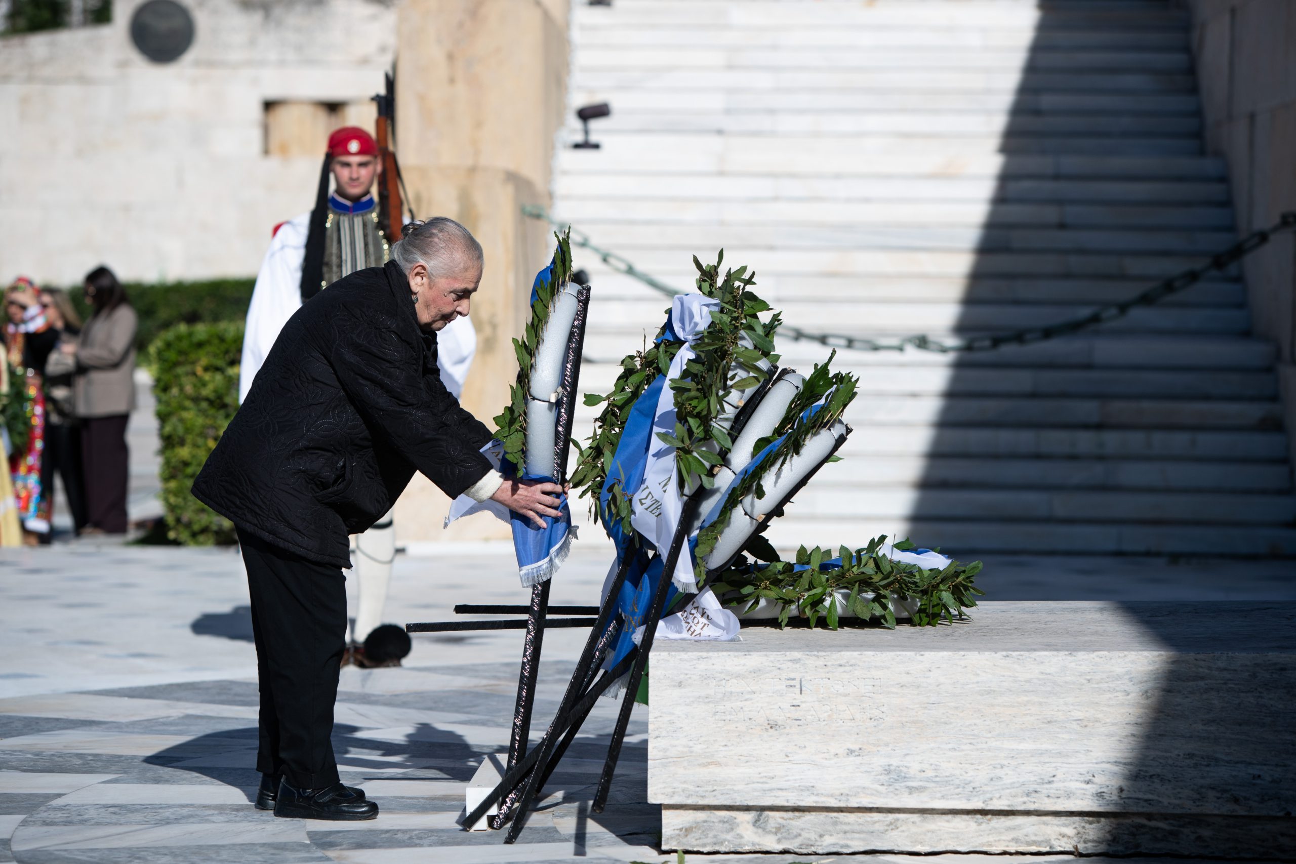 Στο Μνημείο του Αγνώστου Στρατιώτη στις 12:10 μ.μ. πραγματοποιήθηκε κατάθεση στεφάνων από την πολιτική ηγεσία, τις ένοπλες δυνάμεις, την τοπική αυτοδιοίκηση καθώς και δωδεκανησιακούς και καρπαθιακούς φορείς. Τελετάρχης ήταν ο Αντιπρόεδρος του Σ.Α.Κ. Ιωάννης Χριστοδουλάκης και συντονιστές τα μέλη του Σ.Α.Κ. Μιχαήλα Σπανομανωλή-Αμανεζή και Γρηγόρης Χατζηαντωνίου.