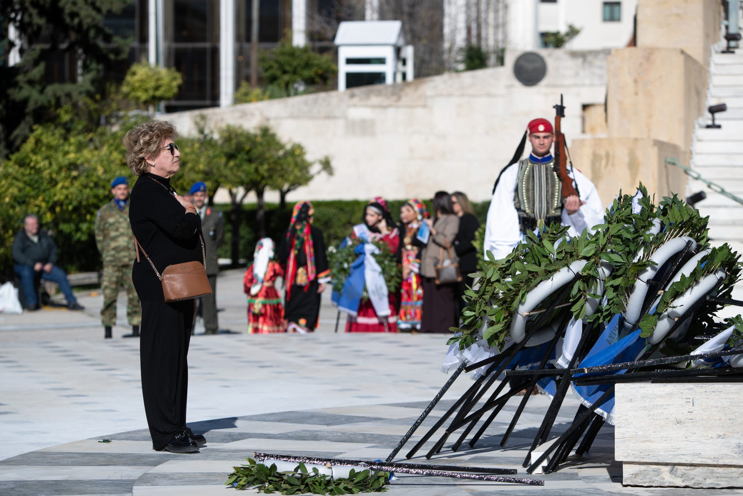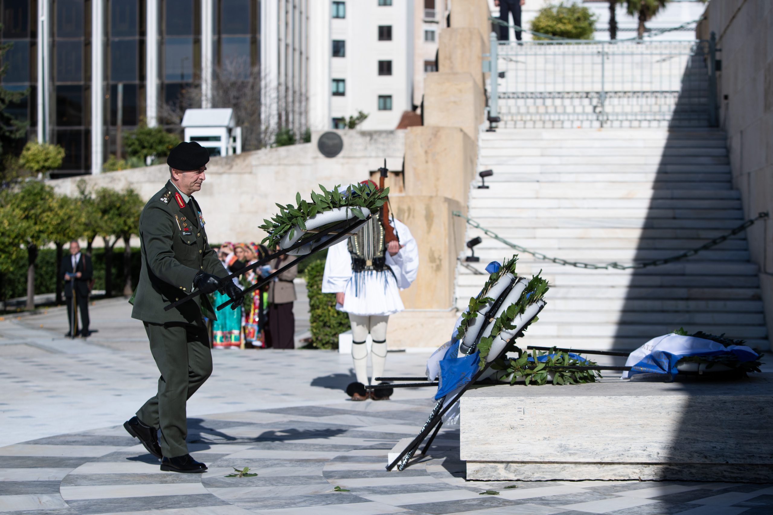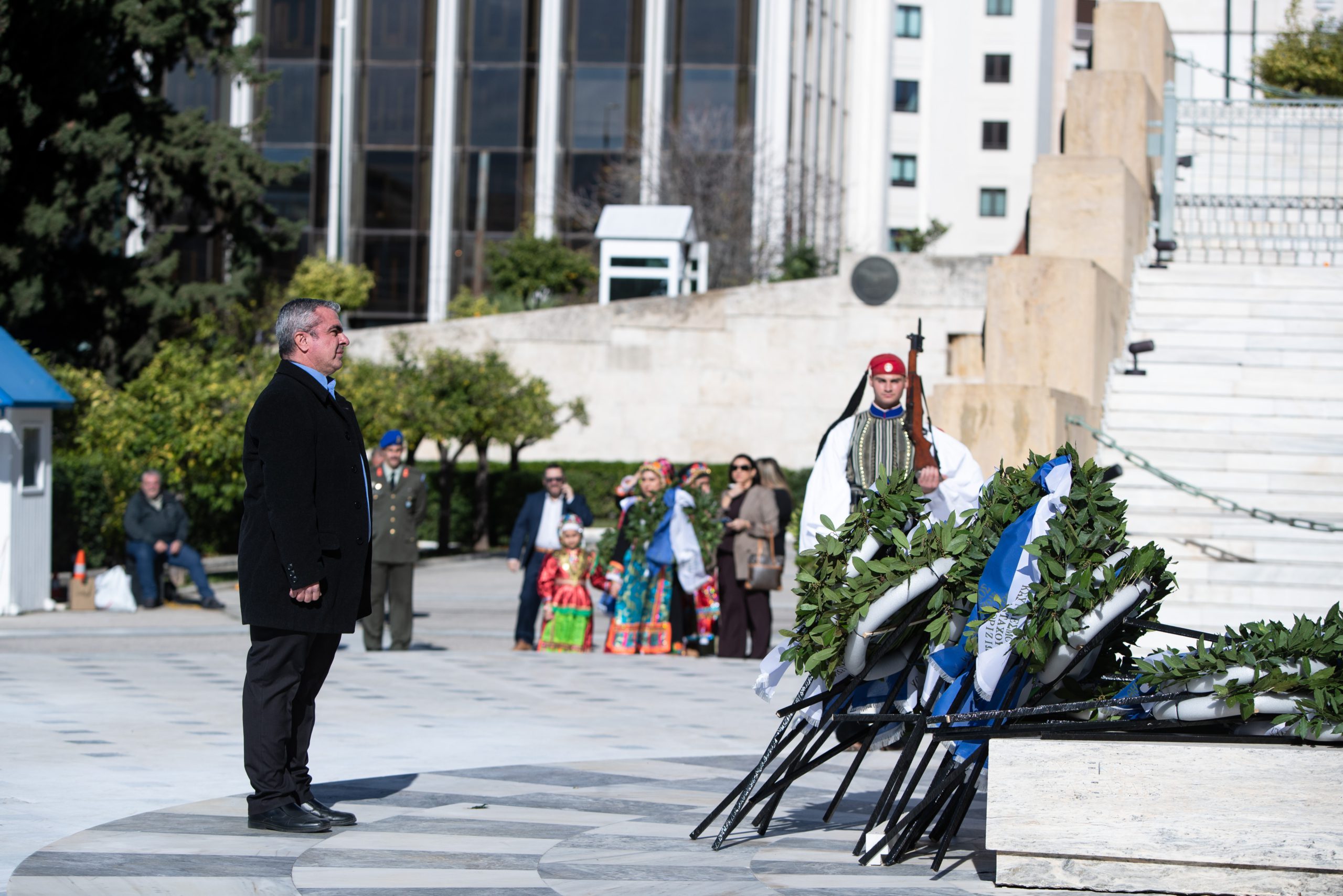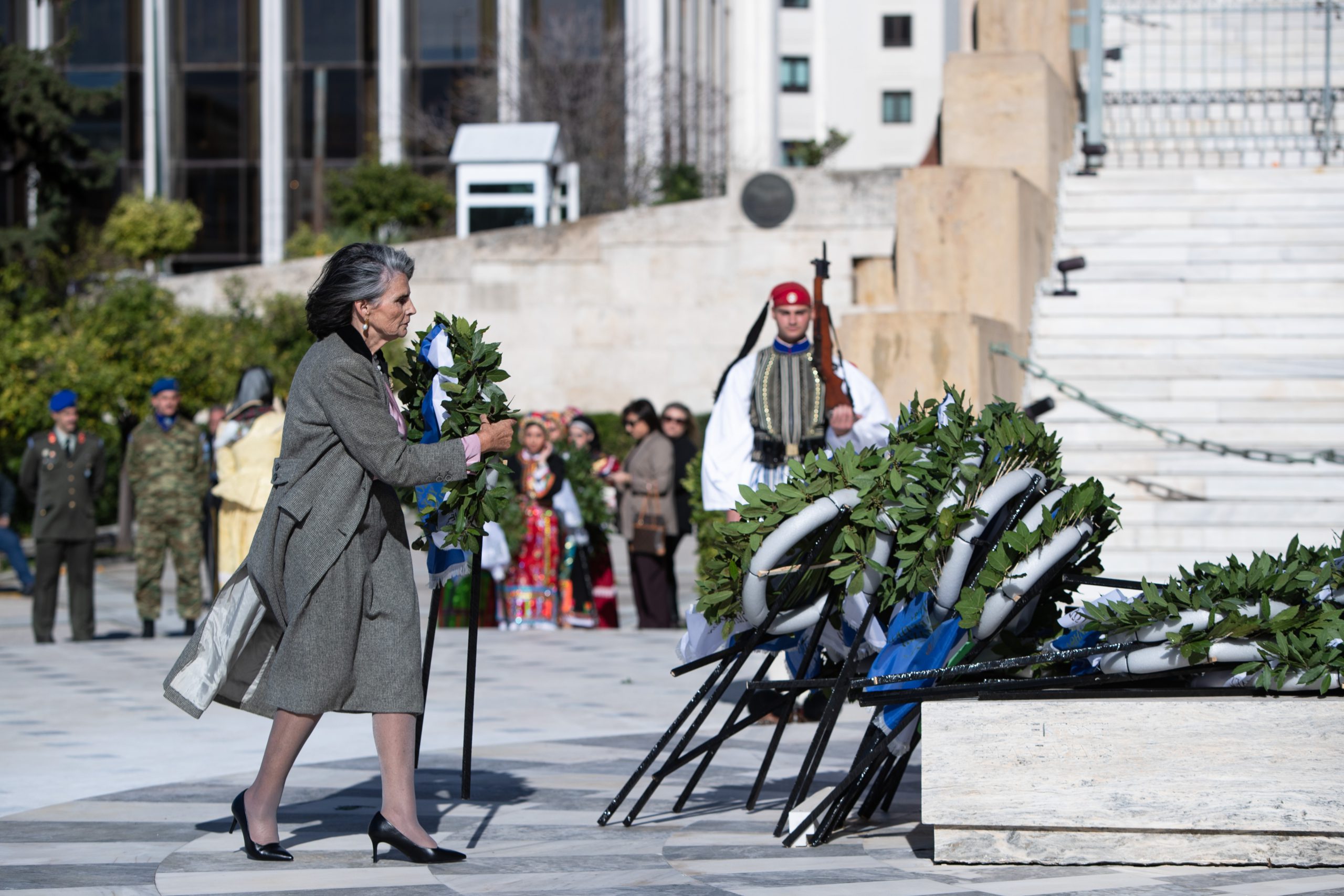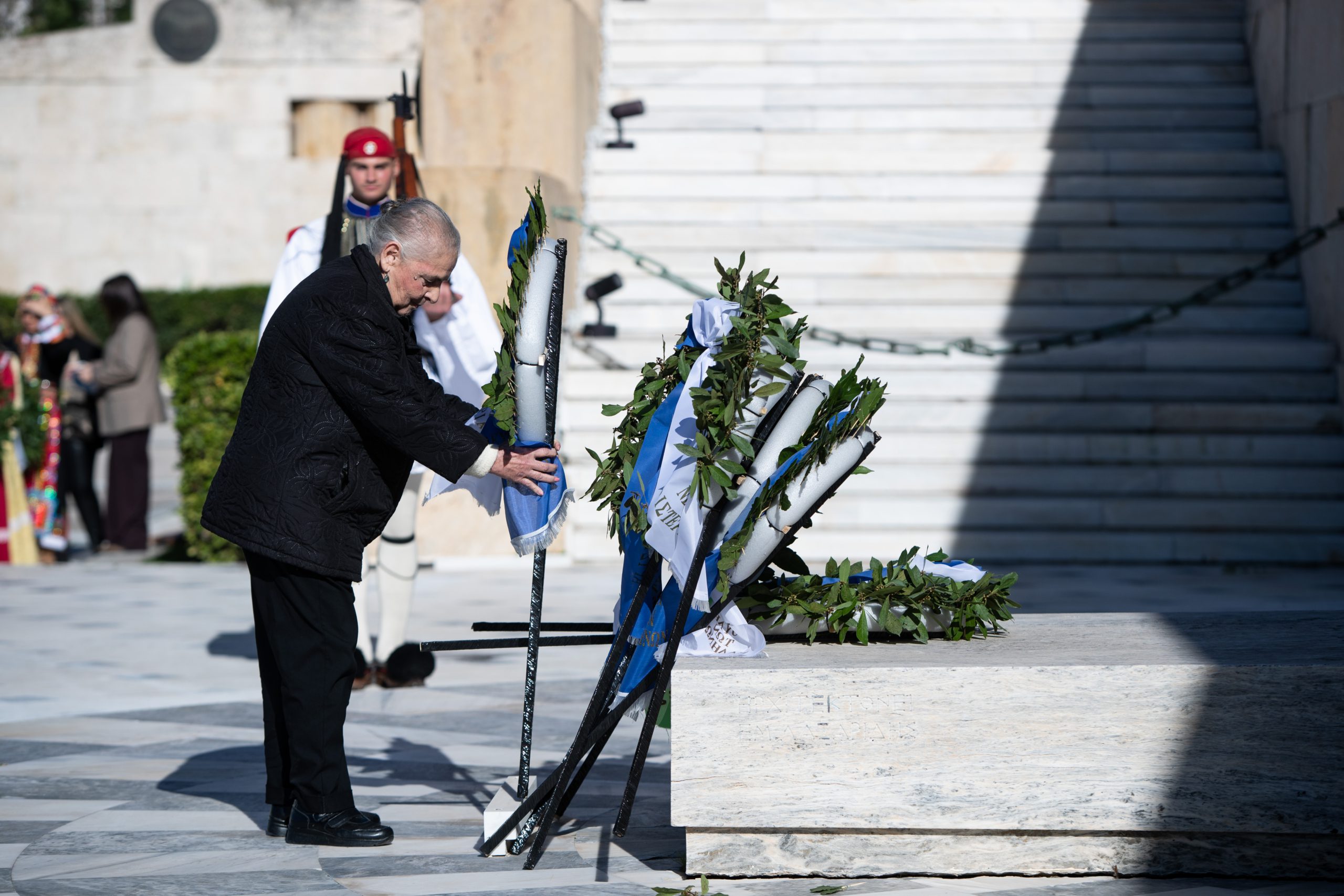Στο Μνημείο του Αγνώστου Στρατιώτη στις 12:10 μ.μ. πραγματοποιήθηκε κατάθεση στεφάνων από την πολιτική ηγεσία, τις ένοπλες δυνάμεις, την τοπική αυτοδιοίκηση καθώς και δωδεκανησιακούς και καρπαθιακούς φορείς. Τελετάρχης ήταν ο Αντιπρόεδρος του Σ.Α.Κ. Ιωάννης Χριστοδουλάκης και συντονιστές τα μέλη του Σ.Α.Κ. Μιχαήλα Σπανομανωλή-Αμανεζή και Γρηγόρης Χατζηαντωνίου.