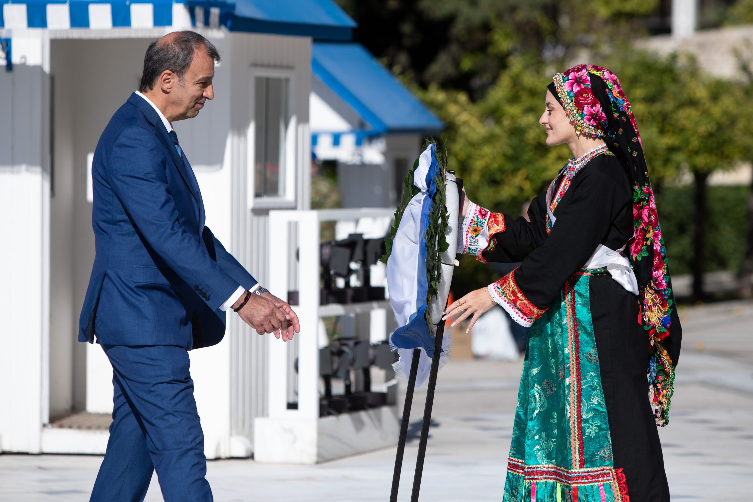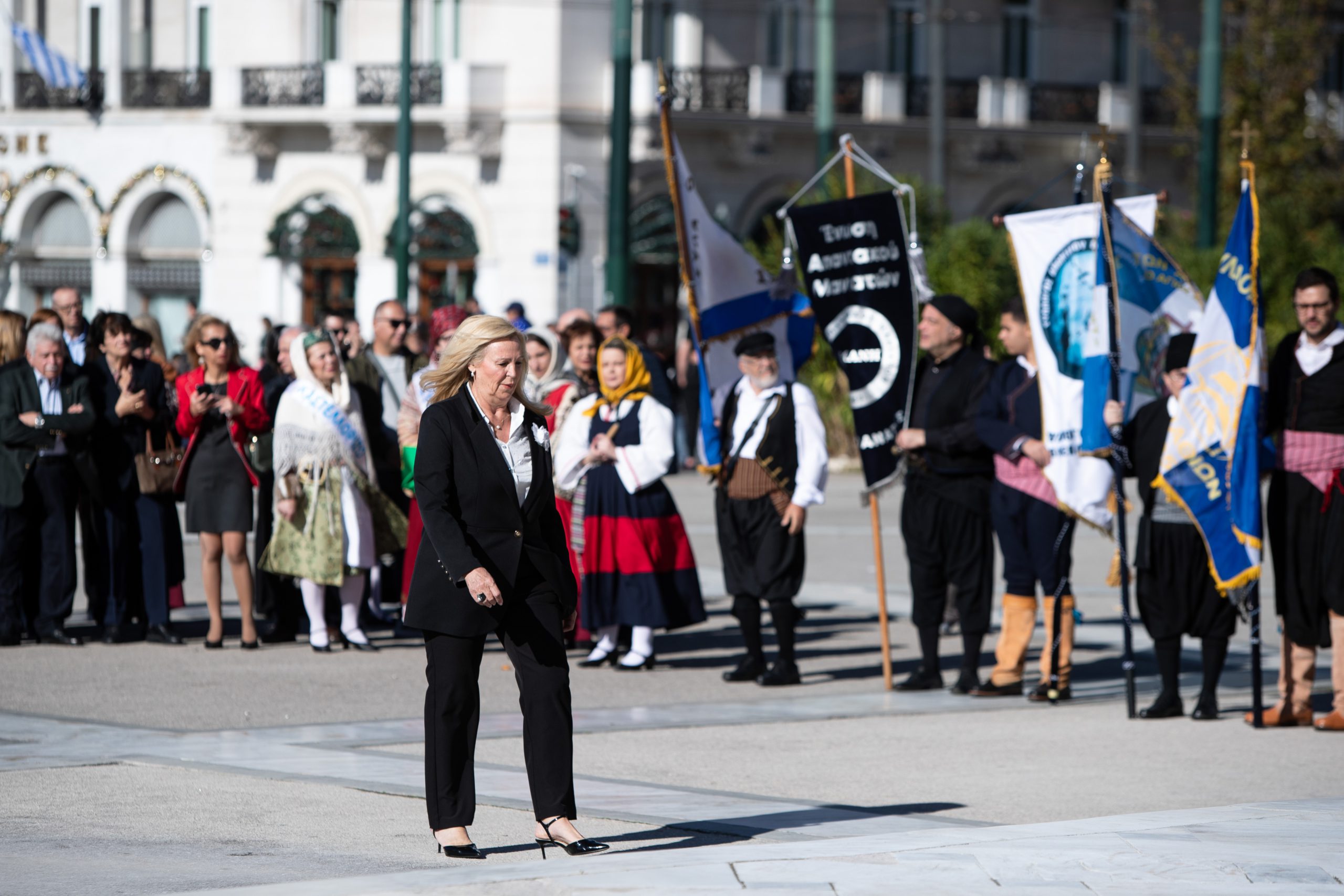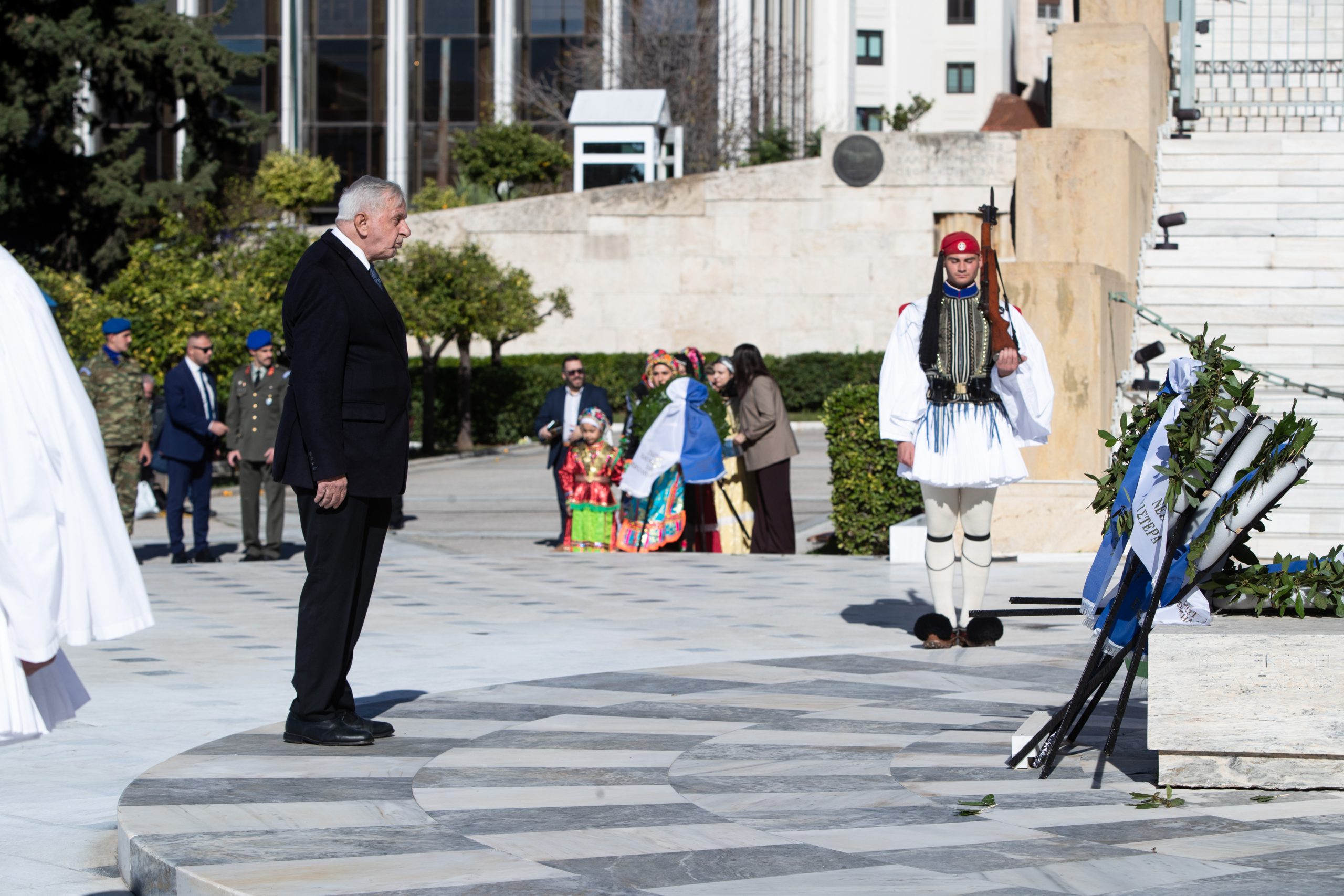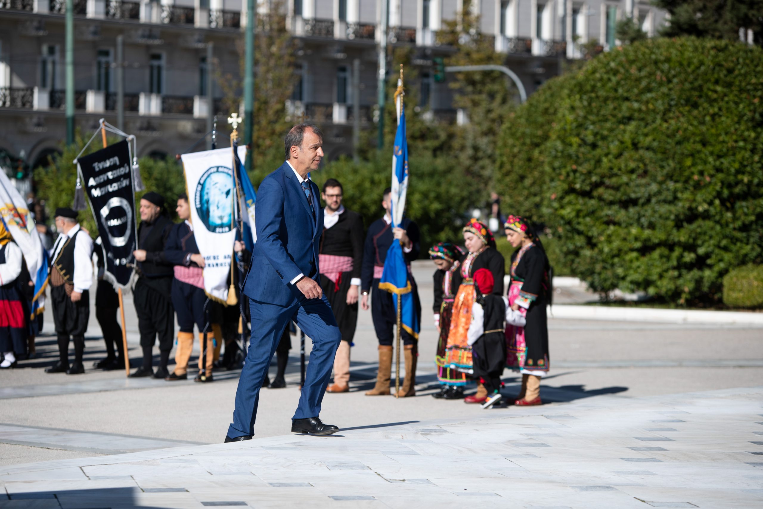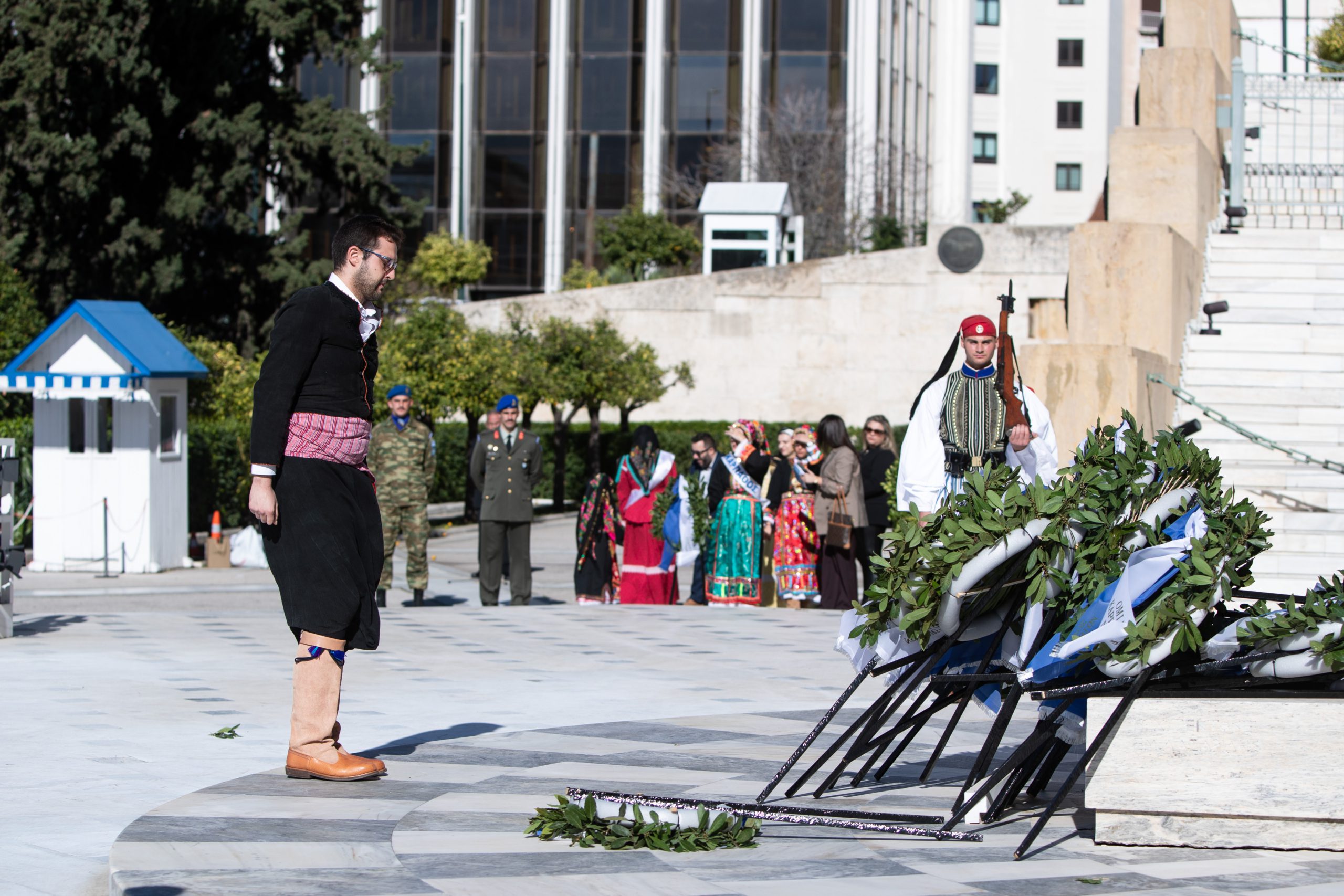 Στο Μνημείο του Αγνώστου Στρατιώτη στις 12:10 μ.μ. πραγματοποιήθηκε κατάθεση στεφάνων από την πολιτική ηγεσία, τις ένοπλες δυνάμεις, την τοπική αυτοδιοίκηση καθώς και δωδεκανησιακούς και καρπαθιακούς φορείς. Τελετάρχης ήταν ο Αντιπρόεδρος του Σ.Α.Κ. Ιωάννης Χριστοδουλάκης και συντονιστές τα μέλη του Σ.Α.Κ. Μιχαήλα Σπανομανωλή-Αμανεζή και Γρηγόρης Χατζηαντωνίου.