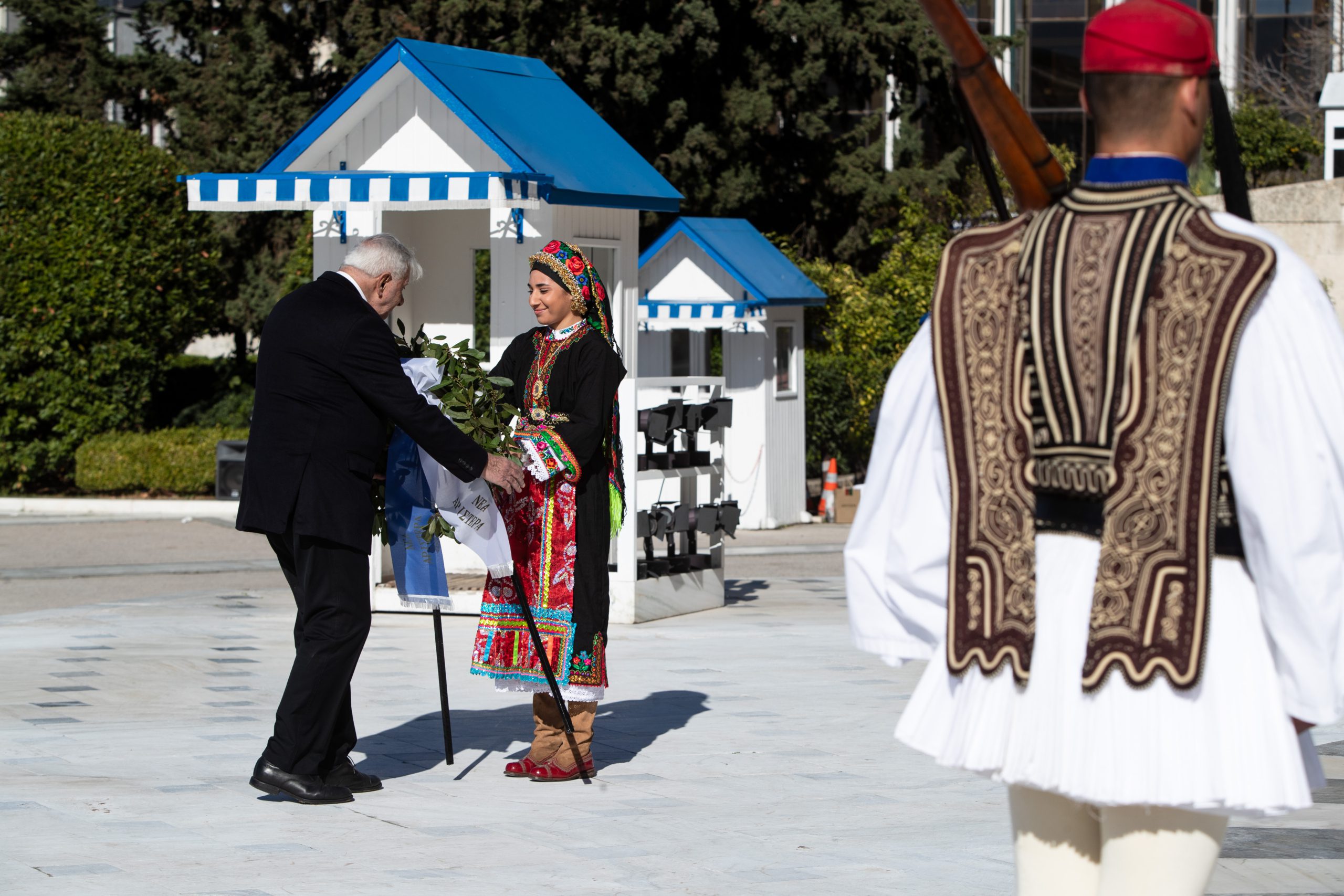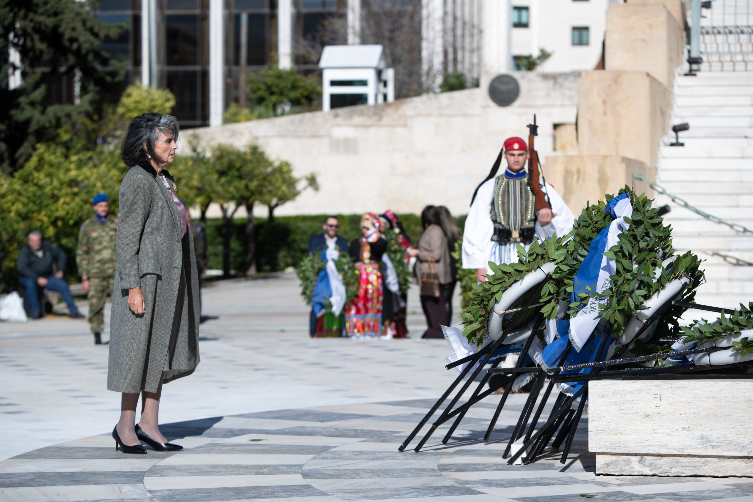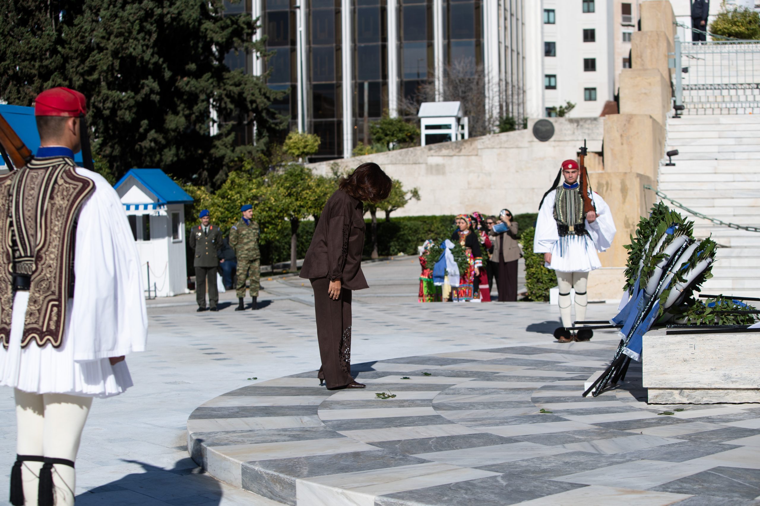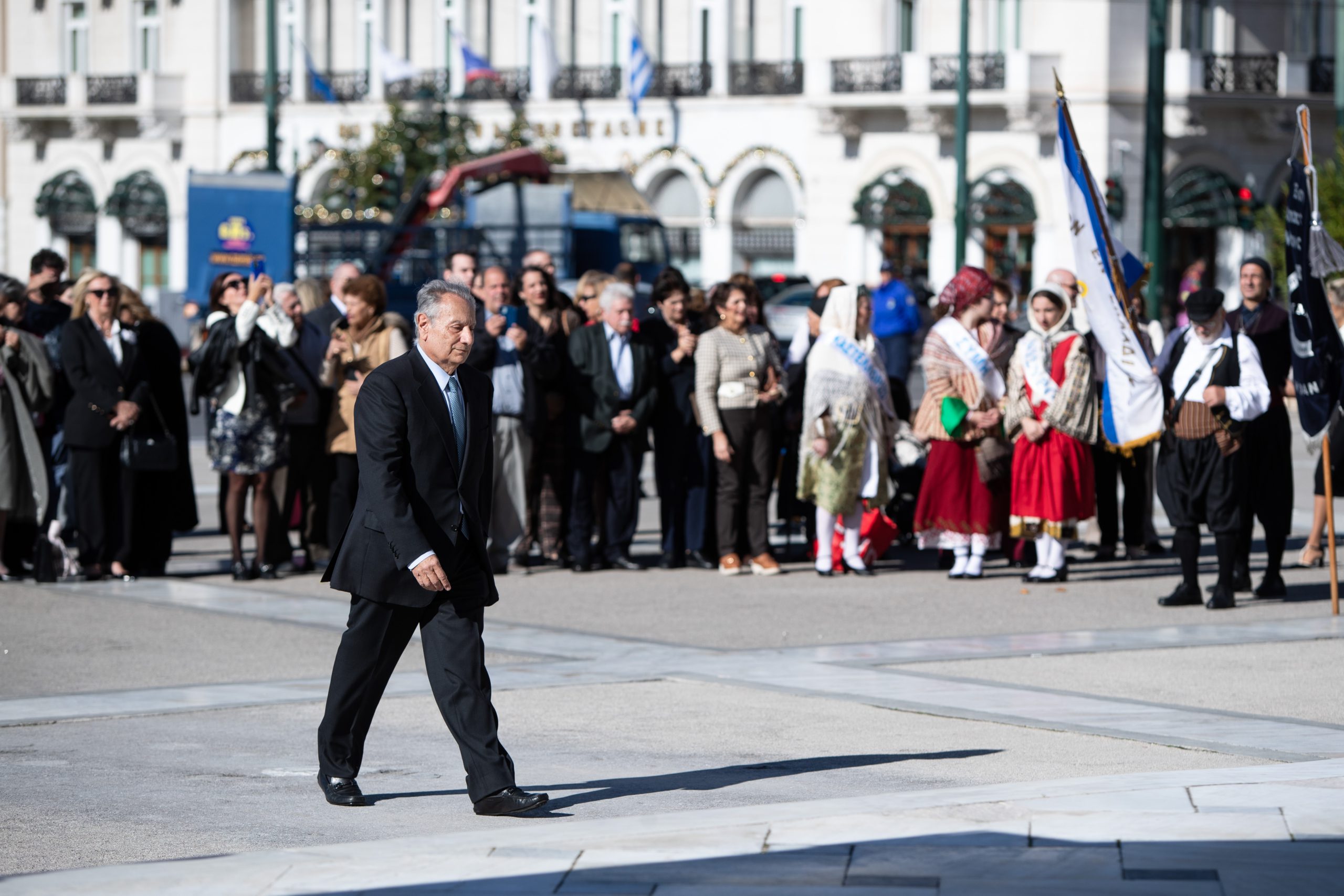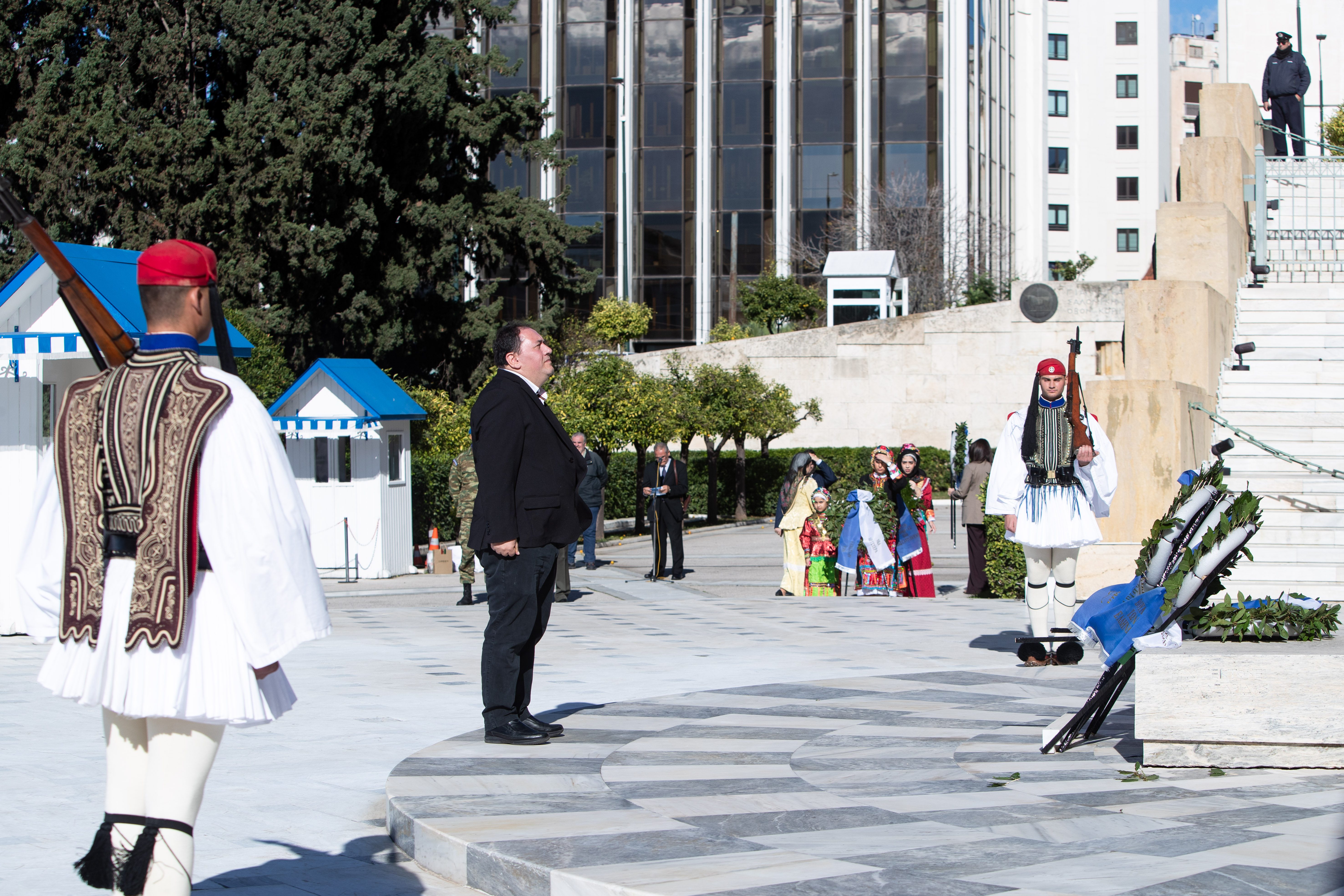Στο Μνημείο του Αγνώστου Στρατιώτη στις 12:10 μ.μ. πραγματοποιήθηκε κατάθεση στεφάνων από την πολιτική ηγεσία, τις ένοπλες δυνάμεις, την τοπική αυτοδιοίκηση καθώς και δωδεκανησιακούς και καρπαθιακούς φορείς. Τελετάρχης ήταν ο Αντιπρόεδρος του Σ.Α.Κ. Ιωάννης Χριστοδουλάκης και συντονιστές τα μέλη του Σ.Α.Κ. Μιχαήλα Σπανομανωλή-Αμανεζή και Γρηγόρης Χατζηαντωνίου.