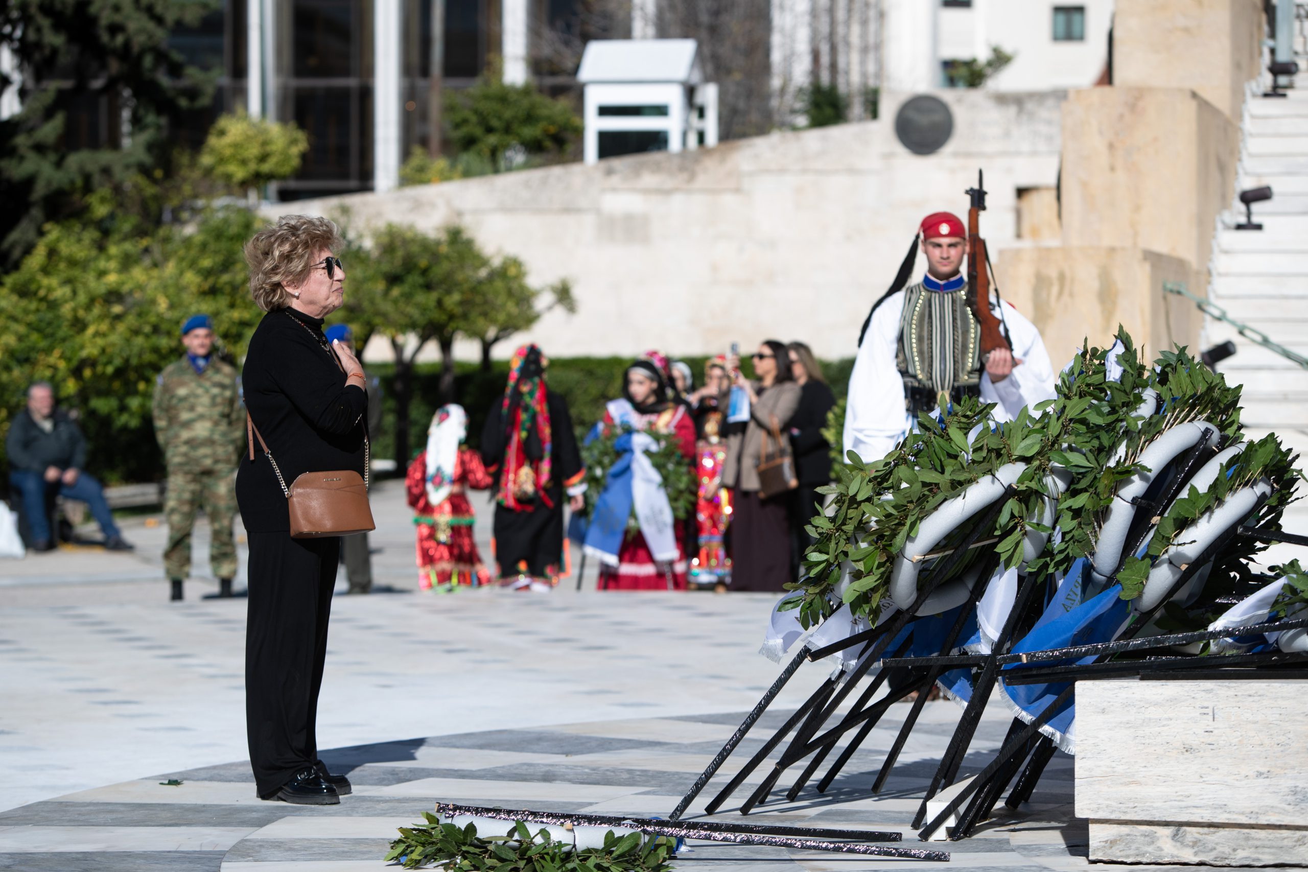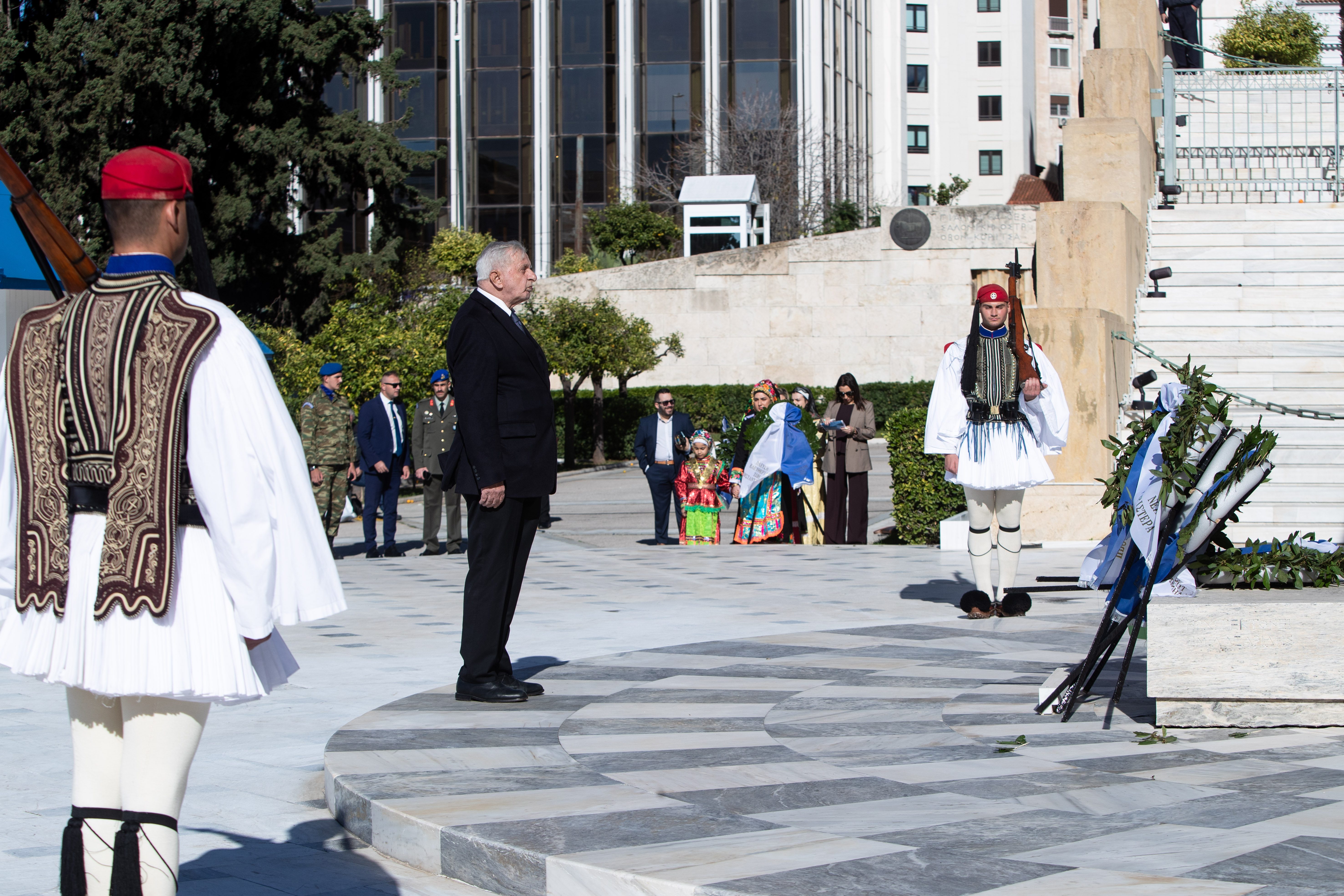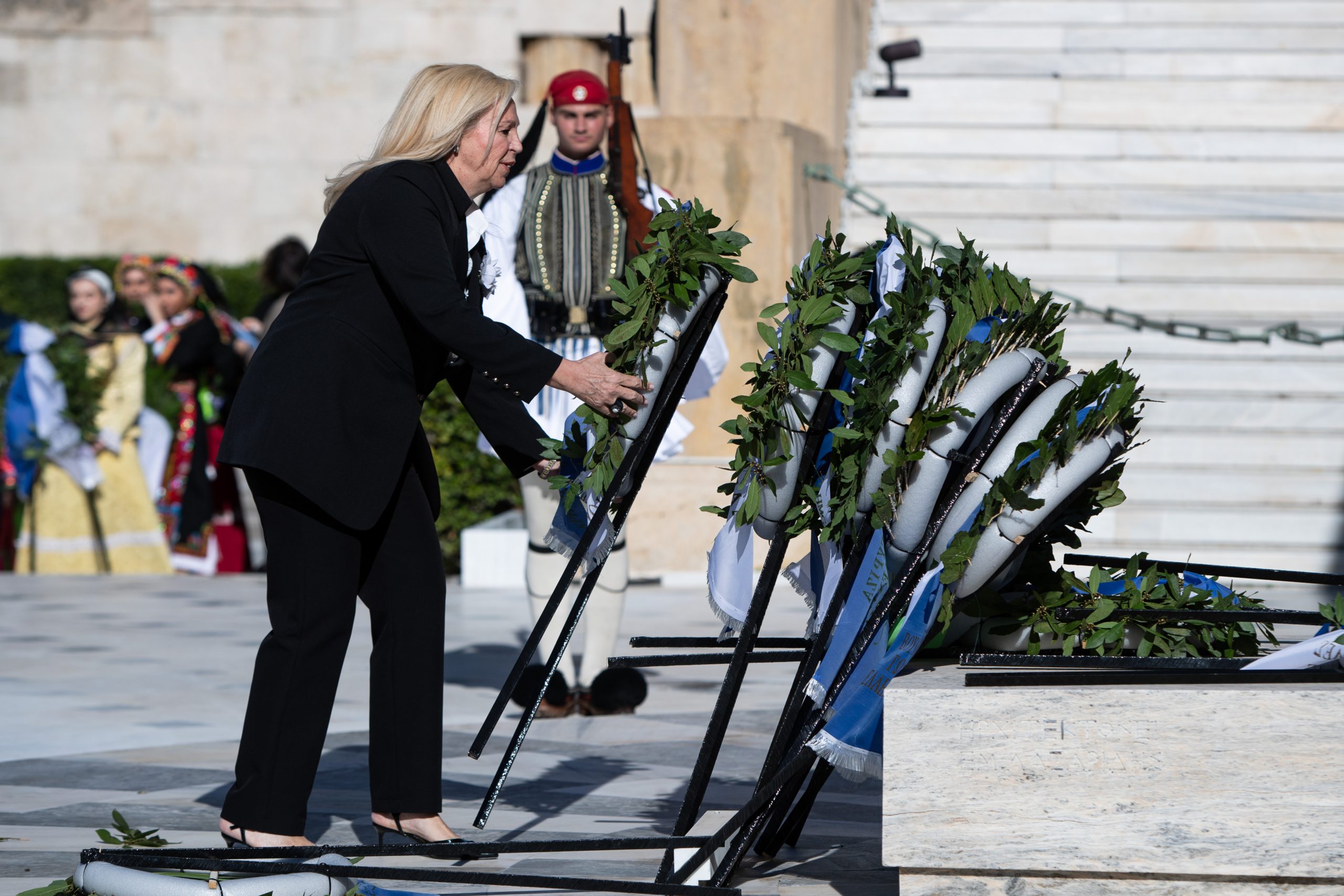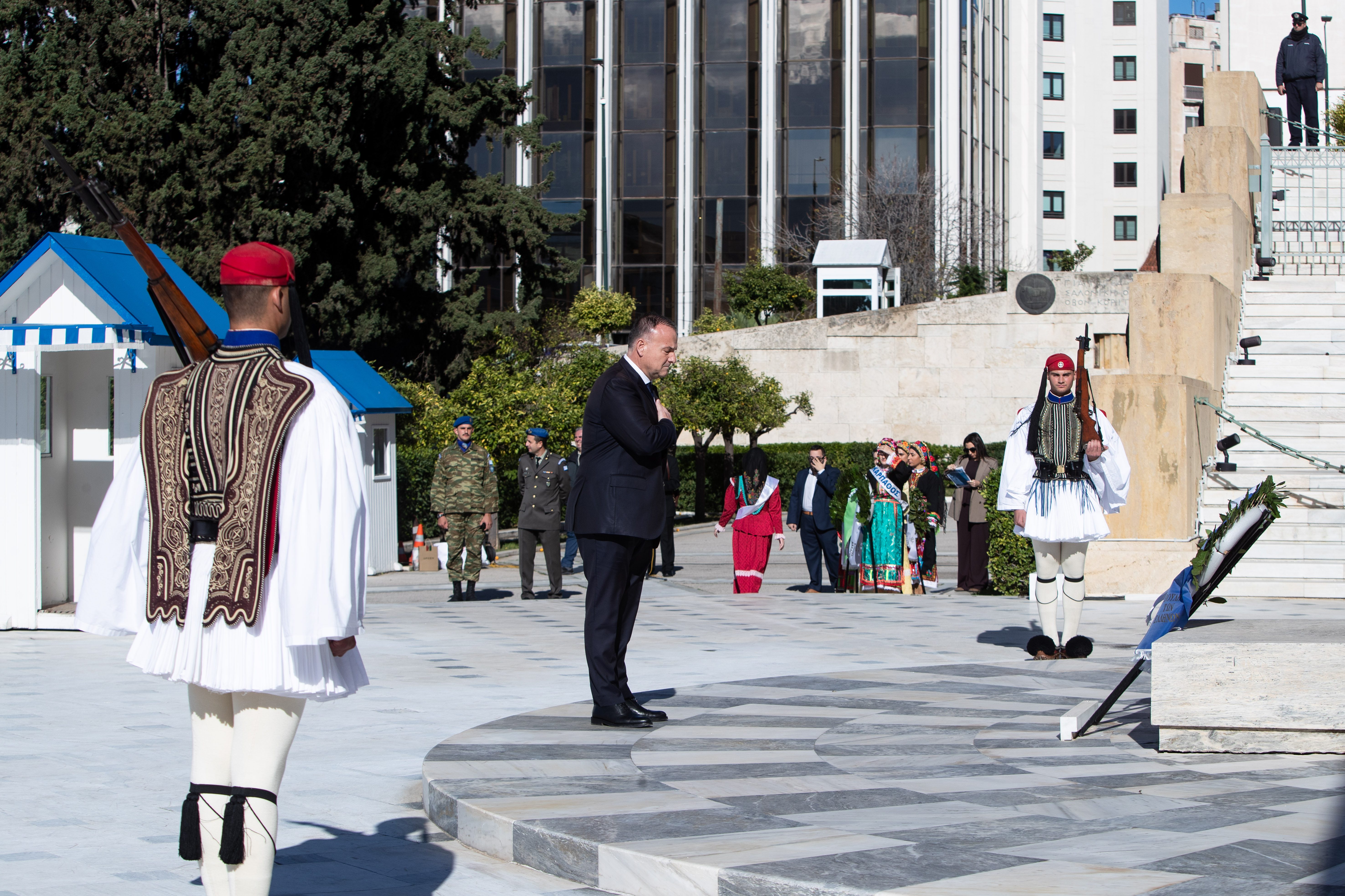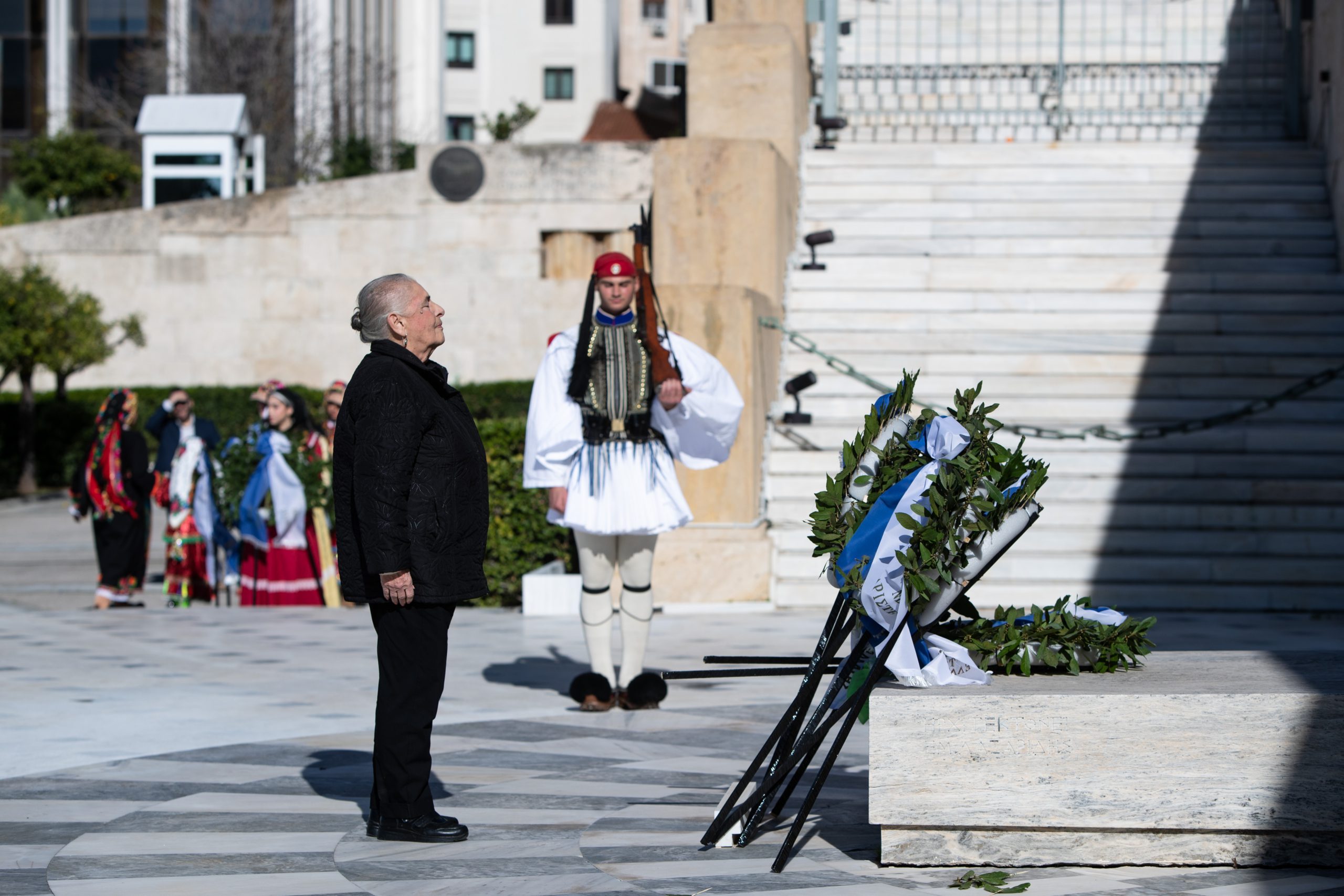 Στο Μνημείο του Αγνώστου Στρατιώτη στις 12:10 μ.μ. πραγματοποιήθηκε κατάθεση στεφάνων από την πολιτική ηγεσία, τις ένοπλες δυνάμεις, την τοπική αυτοδιοίκηση καθώς και δωδεκανησιακούς και καρπαθιακούς φορείς. Τελετάρχης ήταν ο Αντιπρόεδρος του Σ.Α.Κ. Ιωάννης Χριστοδουλάκης και συντονιστές τα μέλη του Σ.Α.Κ. Μιχαήλα Σπανομανωλή-Αμανεζή και Γρηγόρης Χατζηαντωνίου.